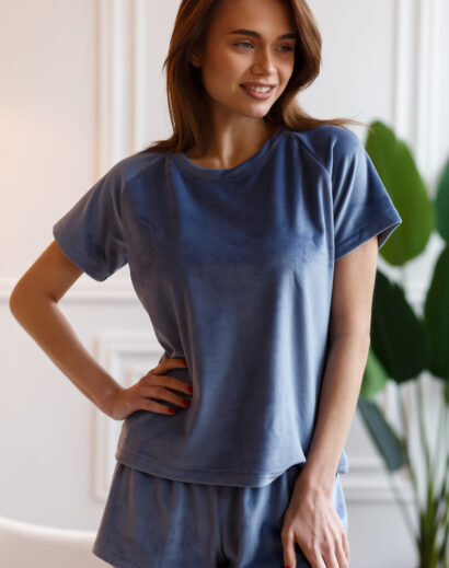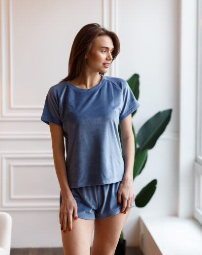 Велюрова піжама (шорти+футболка ) шорти комфортної посадки з м’якою резиночкою, футболка вільного крою Матеріал: двосторонній велюр Кольори: чорний, беж, сіро-блакитний, темно-фіолетовий, фісташка, темно-блакитний, ніжно блакитний, аквамарин, темно-зелений, молоко, пудра, манговий, малина, шоколад Розміри: XS (40-42) S (42-44) M (44-46) L (46-48)