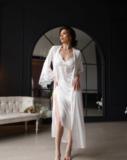 Пеньюар максі з розкльошеним рукавом із мереживом на рукавах, сорочка із мереживом і розрізом на ніжці Матеріал: шовк із мереживом Кольори: чорний, молоко Розміри: XS (40-42) S (42-44) M (44-46) L (46-48) Можливо придбати окремо пеньюар або сорочку: Пеньюар (халат) 1120грн Сорочка 965грн