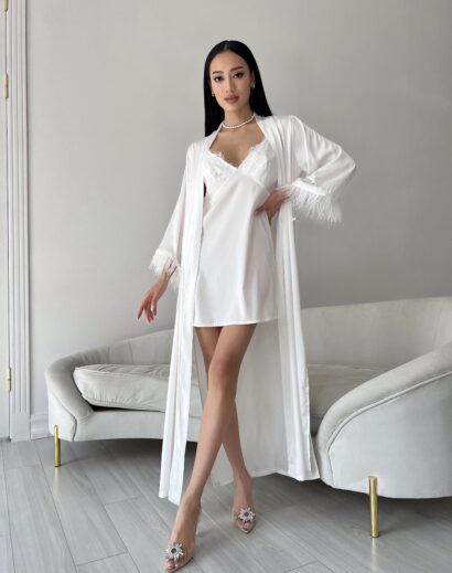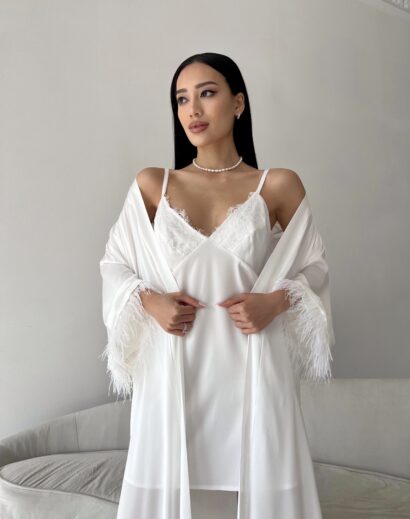 Шовковий комплект (пеньюар максі з пір’ям +сорочка) пеньюар із розкльошеним рукавом зі зйомним пір’ям, Сорочка з V-подібним вирізом на грудях і прямою спинкою, бретелі на регулюванні Матеріал: шовк з пір’ям Кольори: молоко, чорний Розміри: XS (40-42) S (42-44) M (44-46) L (46-48) Можливо придбати окремо пеньюар або сорочку: Пеньюар з