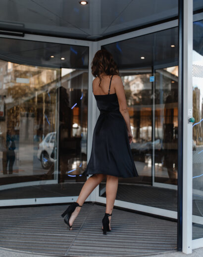 Шовкова сукня на запах у білизняному стилі шикарно підкреслює талію, бретелі на регулюванні. Матеріал: шовк Кольори: чорний Розміри: XS-S (40-42) S-M (42-44) M-L (44-46)
