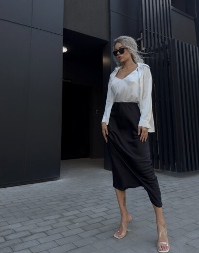 Шовкова сорочка подовжена спереду до низу, шикарно виглядає у зав’язаному вигляді, спідниця міді із топом, неймовірно легкий, приємний до тіла і водночас стильний образ. Кожен виріб можливо придбати окремо або різних кольорів та розмірів. Шовкова Сорочка 1250грн Кольори: чорний, молоко, шоколад Розміри: XS-S (40-42) M-L (44-46) Шовкова спідниця міді 1090грн