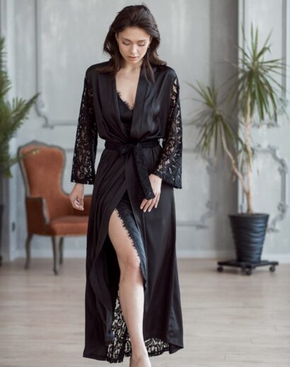 Шовковий комплект максі (Пеньюар+Сорочка міді) для гарних фотосесій, а також для повсякденного використання, щоб щодня почуватися королевою. Матеріал: шовк із мереживом Кольори: молочний, чорний Розміри: XS (40-42) S (42-44) M (44-46) L (46-48) Можливо придбати окремо пеньюар або сорочку: Пеньюар максі (халат) 1290грн Сорочка міді 965грн