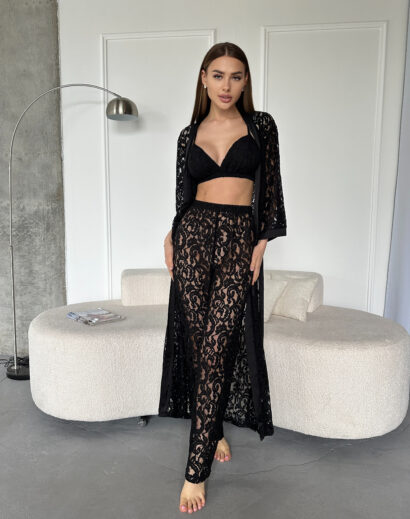 Комплект з гіпюровим мереживом (пеньюар максі+штани+топ) Матеріал: мереживо із шовком Кольори: чорний Розміри: XS (40-42) S (42-44) M (44-46) L (46-48) Можливо придбати окремо : Пеньюар максі (халат) 1020грн Штани + топ 1095грн