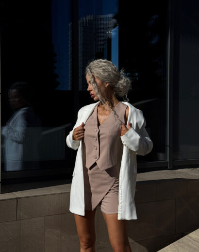 Жакет вільного крою виконаний з костюмної тканини. Легка підклада забезпечує комфорт. Застібається на ґудзики, додаючи класичного шарму, а функціональні кармани роблять жакет не тільки стильним, а й практичним, у жакету є підплічники, які роблять гарний силует, також у комплекті до жакету є пояс, щоб підкреслити талію. Базовий жилет із костюмної тканини