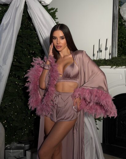 Ніжний і надзвичайно ефектний пеньюар максі зі зйомним пір’ям та шорти і топом, у топа бретелі йдуть навхрест, регулюються Матеріал: шовк з пір’ям Колір: молоко, чорний, малина, ніжно блакитний, ліловий, шоколад, пісочний, пудра, смарагд, леопард, принт полоска, чорний з чорно-білим пірʼям, чорний з чорно-червоним пірʼям, малина, темно-синій Розміри: XS (40-42)