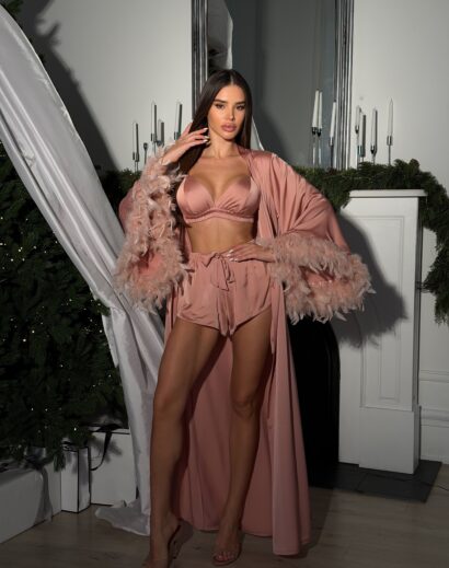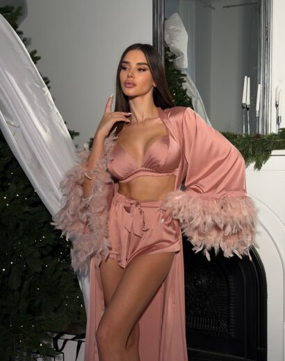 Шовковий комплект (пеньюар максі зі зйомним пір'ям+шорти+топ)
