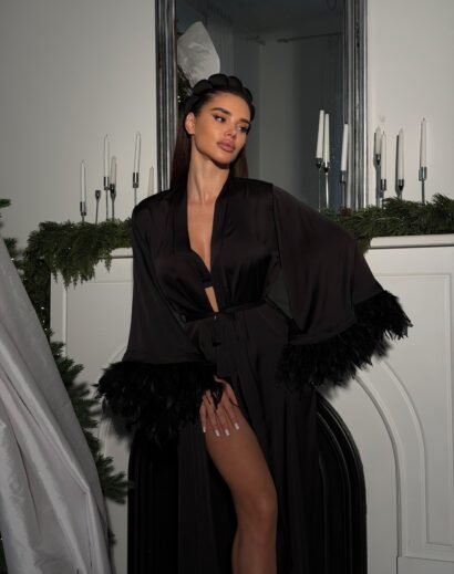 Шовковий комплект (Пеньюар максі зі зйомним пір'ям+Сорочка рюш)