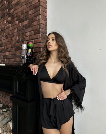 Шовковий комплект (пеньюар максі зі зйомним пір’ям +шорти+топ)