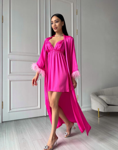 Шовковий комплект (Пеньюар зі зйомним пір'ям+Сорочка рюш)
