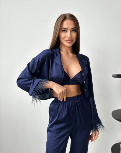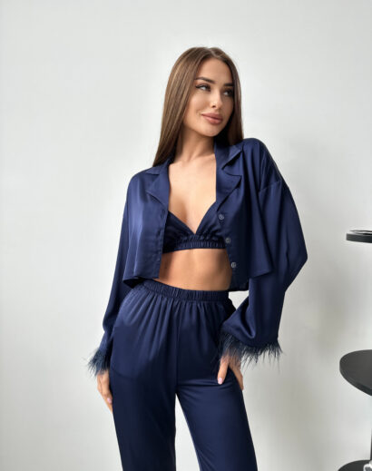 Укорочена сорочка зі зйомним пір'ям+штани+топ