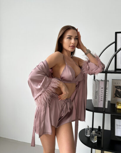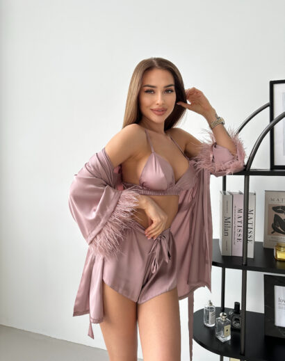 Шовковий комплект (пеньюар з пір’ям +сорочка рюш) пеньюар із розкльошеним рукавом зі зйомним пір’ям , сорочка з рюшами, вікрита спинка, бретелі йдуть навхрест, регулюються Матеріал: шовк з пір’ям Кольори: чорний, молоко, малина Розміри: XS (40-42) S (42-44) M (44-46) L (46-48) Можливо придбати окремо пеньюар або піжаму: Пеньюар з пір’ям