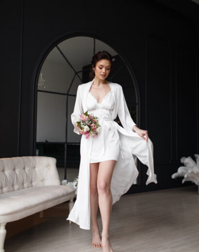 Пеньюар максі з розкльошеним рукавом із мереживом на рукавах, сорочка із мереживом і розрізом на ніжці Матеріал: шовк із мереживом Кольори: чорний, молоко Розміри: XS (40-42) S (42-44) M (44-46) L (46-48) Можливо придбати окремо пеньюар або сорочку: Пеньюар (халат) 1320грн Сорочка 1160грн