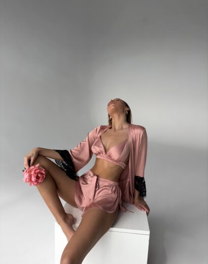 Пеньюар з розкльошеним рукавом, піжама( топ+шорти). Ідеальна посадка за фігурою Матеріал: шовк із мереживом Кольори: чорний, пісочний, молочний, темно-синій, смарагд, шоколад, ліловий, пудра Розміри: XS (40-42) S (42-44) M (44-46) L (46-48) Можливо придбати окремо пеньюар або піжаму: Пеньюар (халат) 1200грн Шорти+топ 1090грн