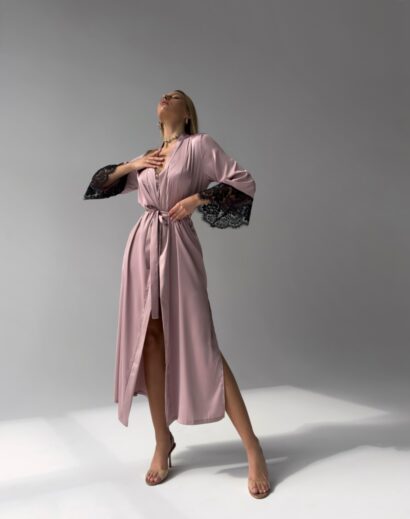 Пеньюар максі з розкльошеним рукавом із мереживом на рукавах, сорочка з V-подібним вирізом на грудях і прямою спинкою, бретелі на регулюванні Матеріал: шовк із мереживом Кольори: чорний, пісочний, молочний, темно-синій, смарагд, шоколад, ліловий, пудра Розміри: XS (40-42) S (42-44) M (44-46) L (46-48) Можливо придбати окремо пеньюар або сорочку: Пеньюар