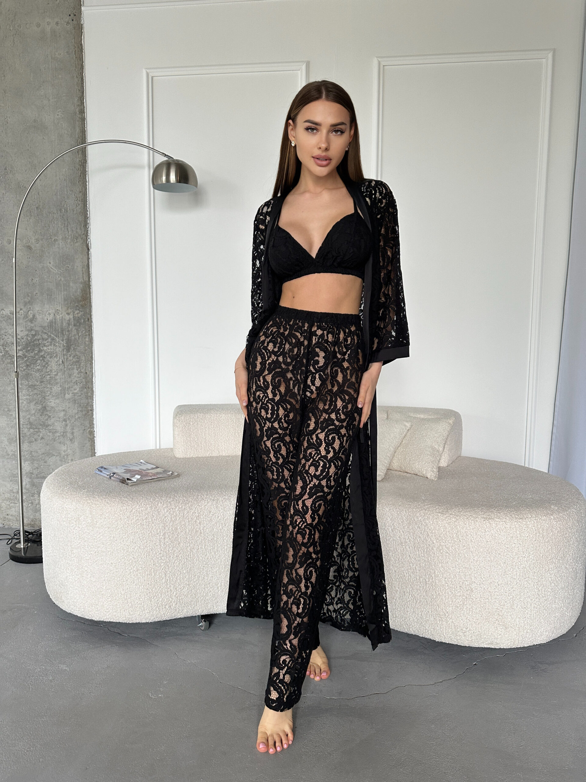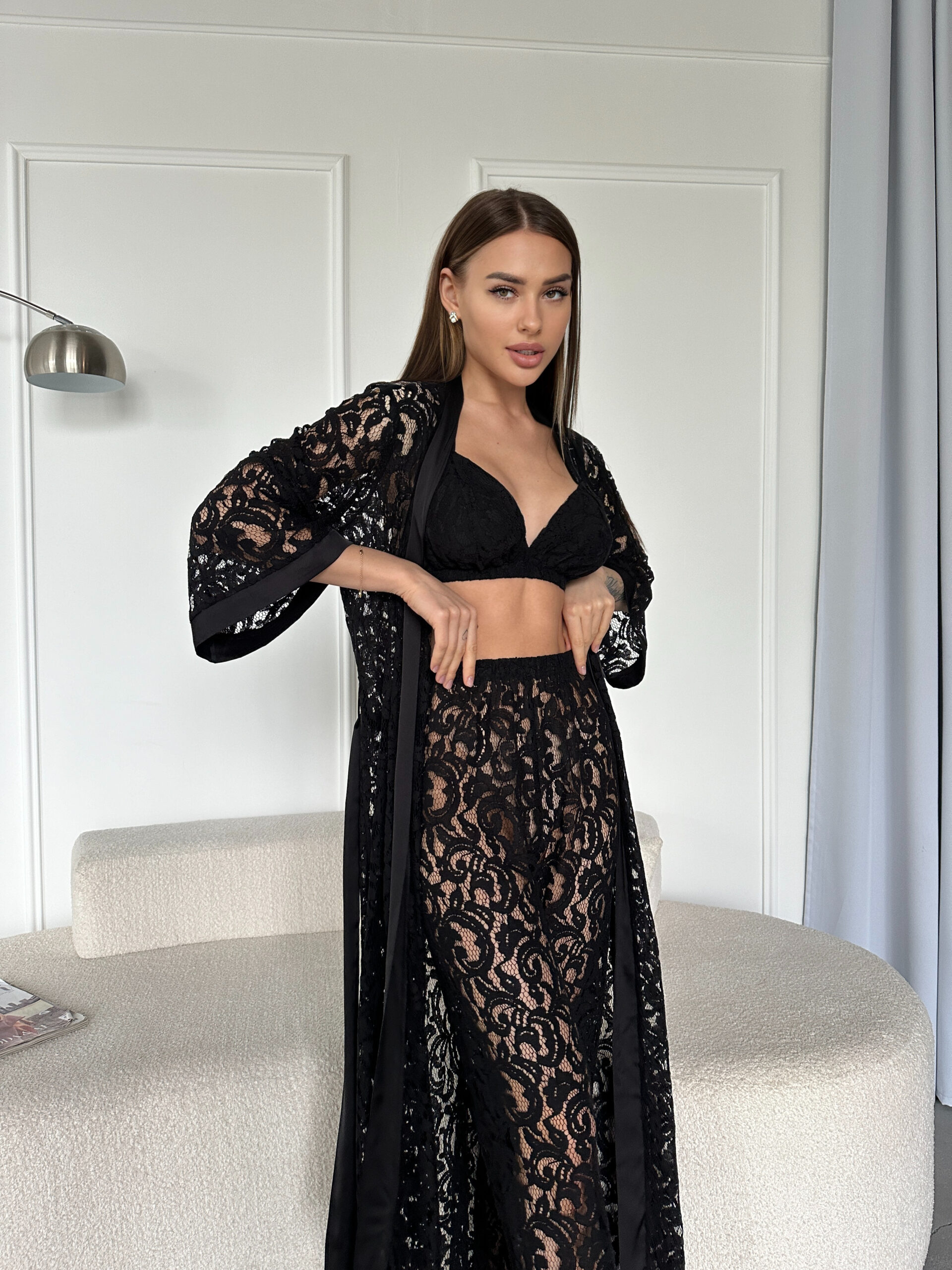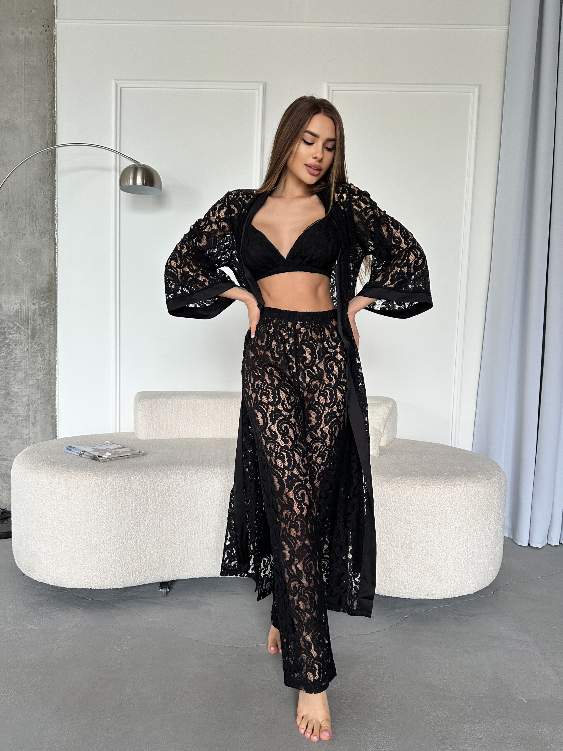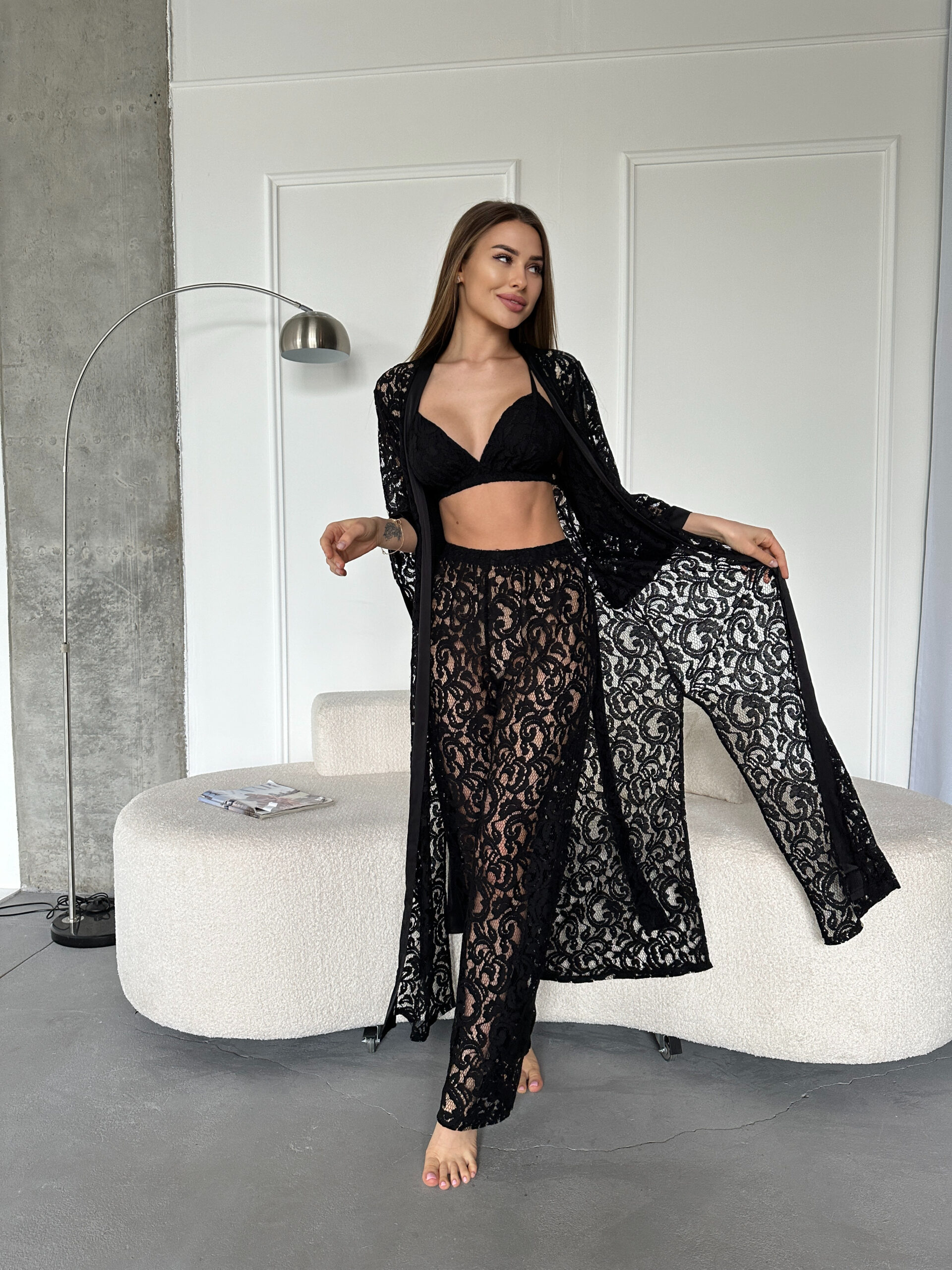 Комплект з гіпюровим мереживом (пеньюар максі+штани+топ)