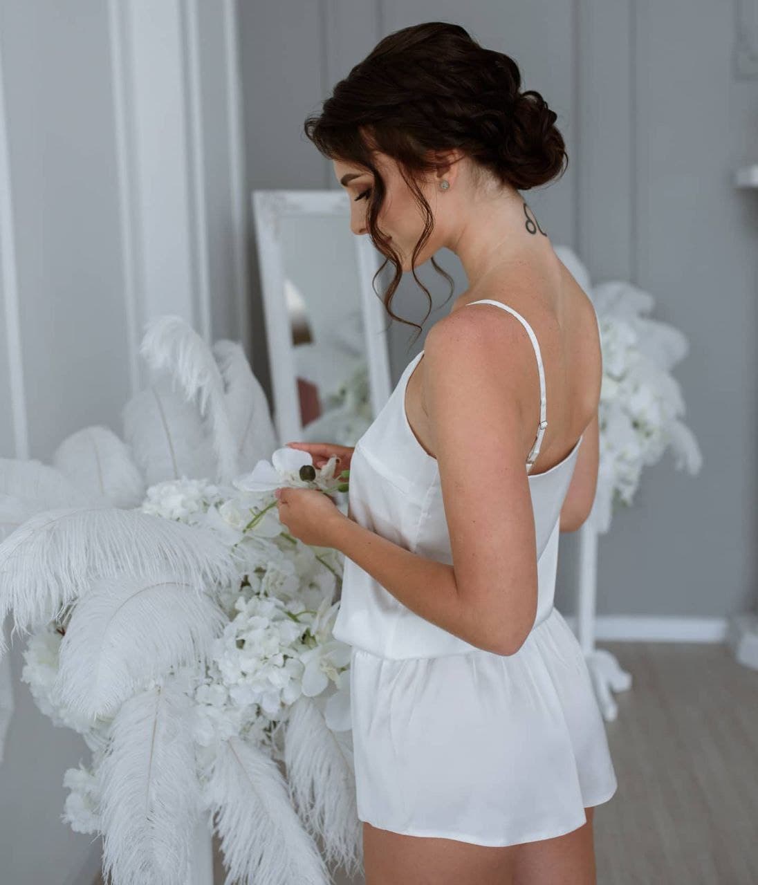 Пеньюар з рукавом 3\4, шортики високої посадки на резинці з декоративними зав’язками+ маєчка з V-подібним вирізом на грудях , бретелі на регулюванні