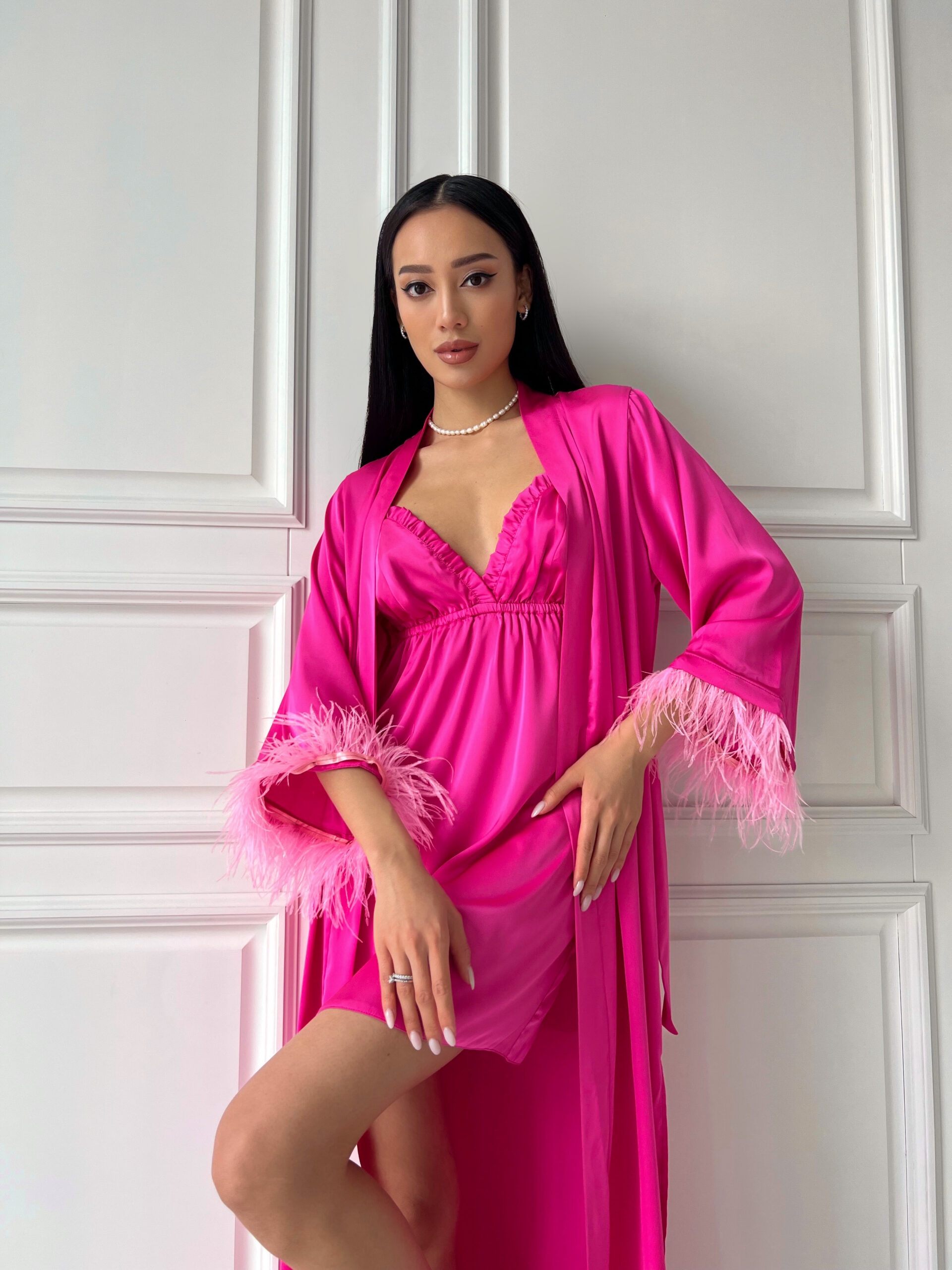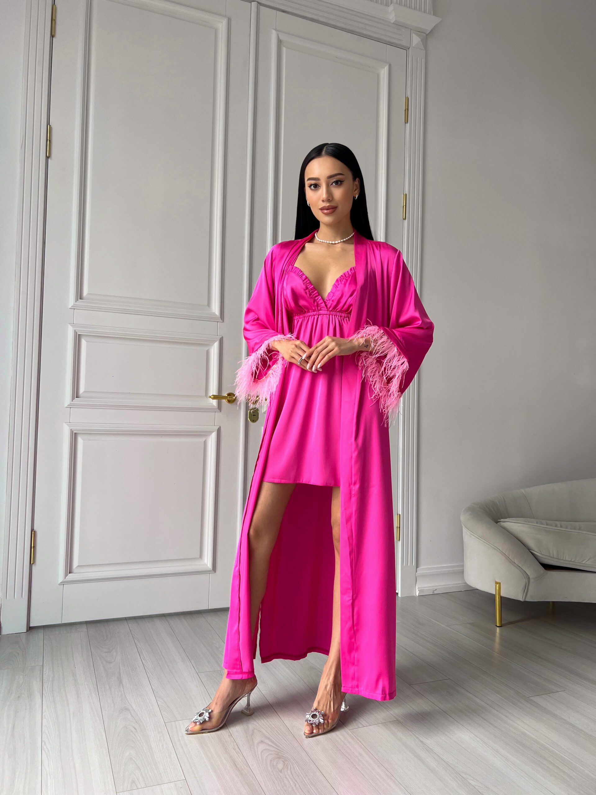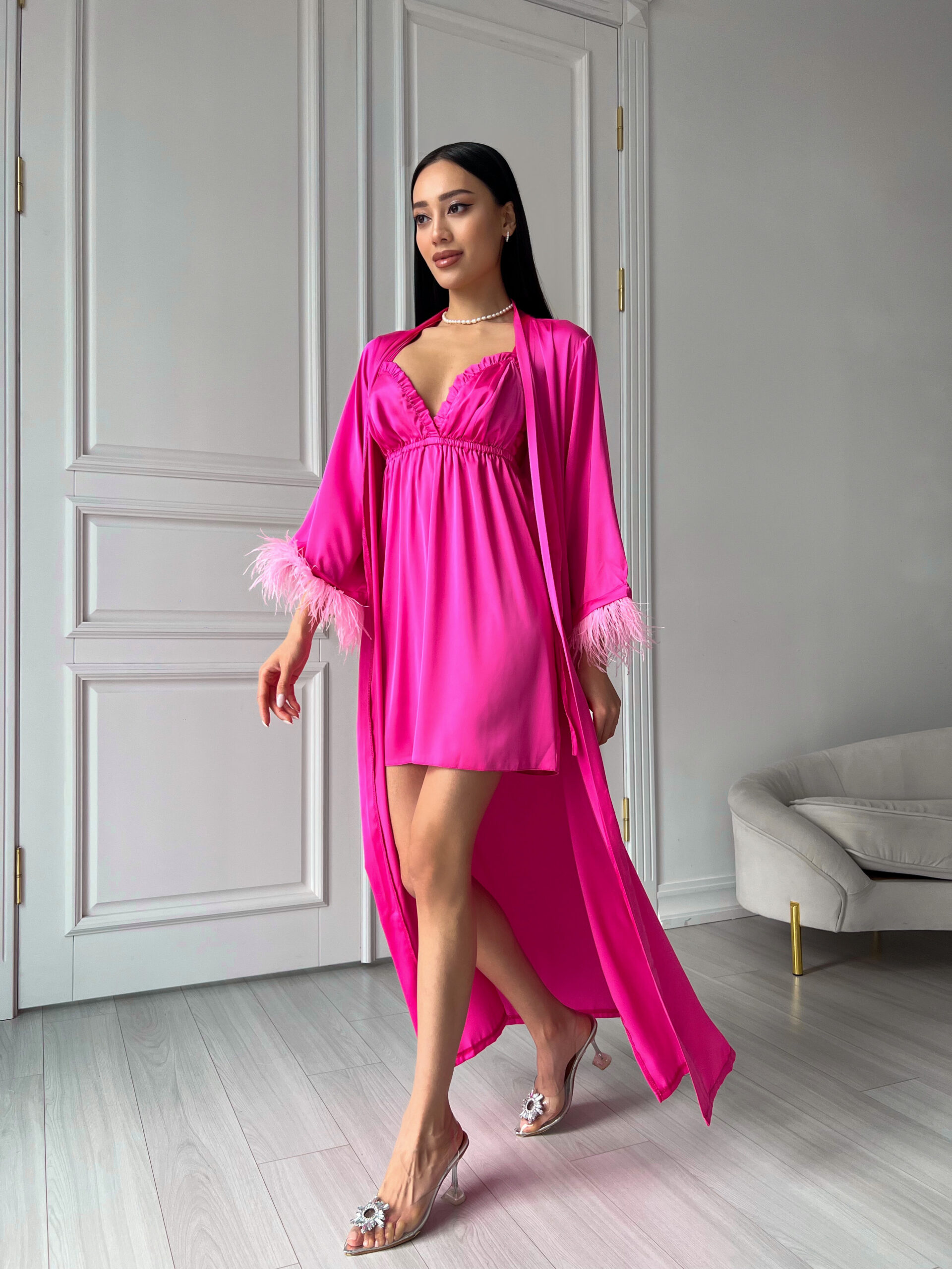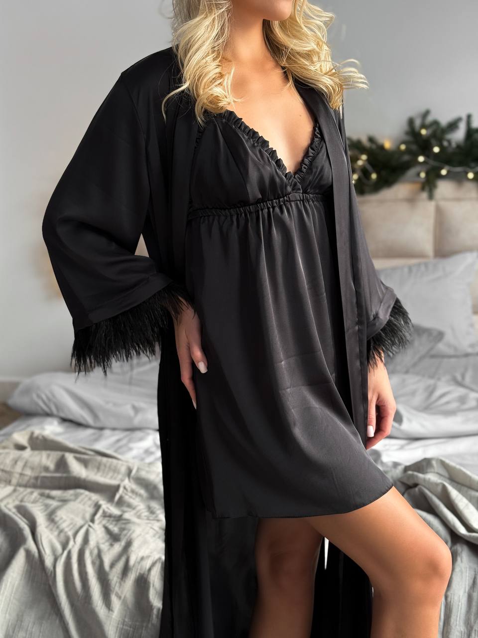 Шовковий комплект (пеньюар максі з пір’ям +сорочка рюш) пеньюар із розкльошеним рукавом зі зйомним пір’ям , сорочка з рюшами, вікрита спинка, бретелі йдуть навхрест, регулюються