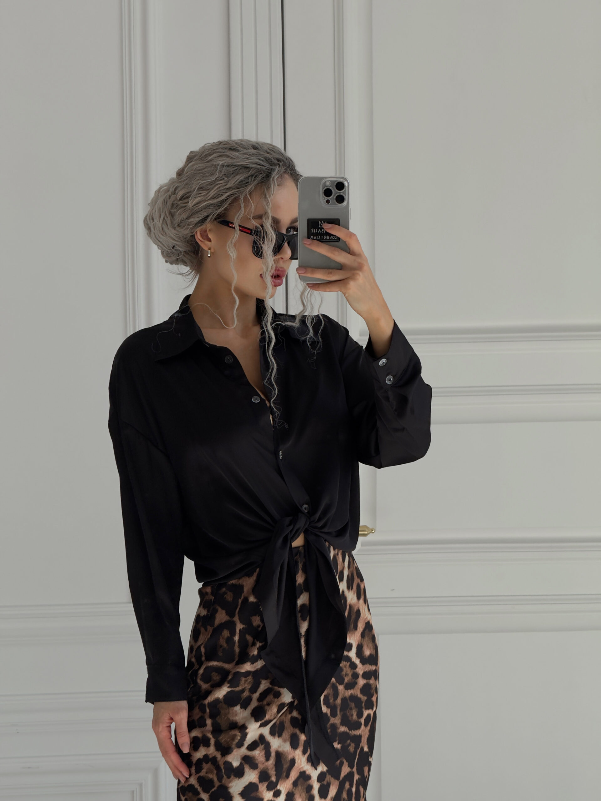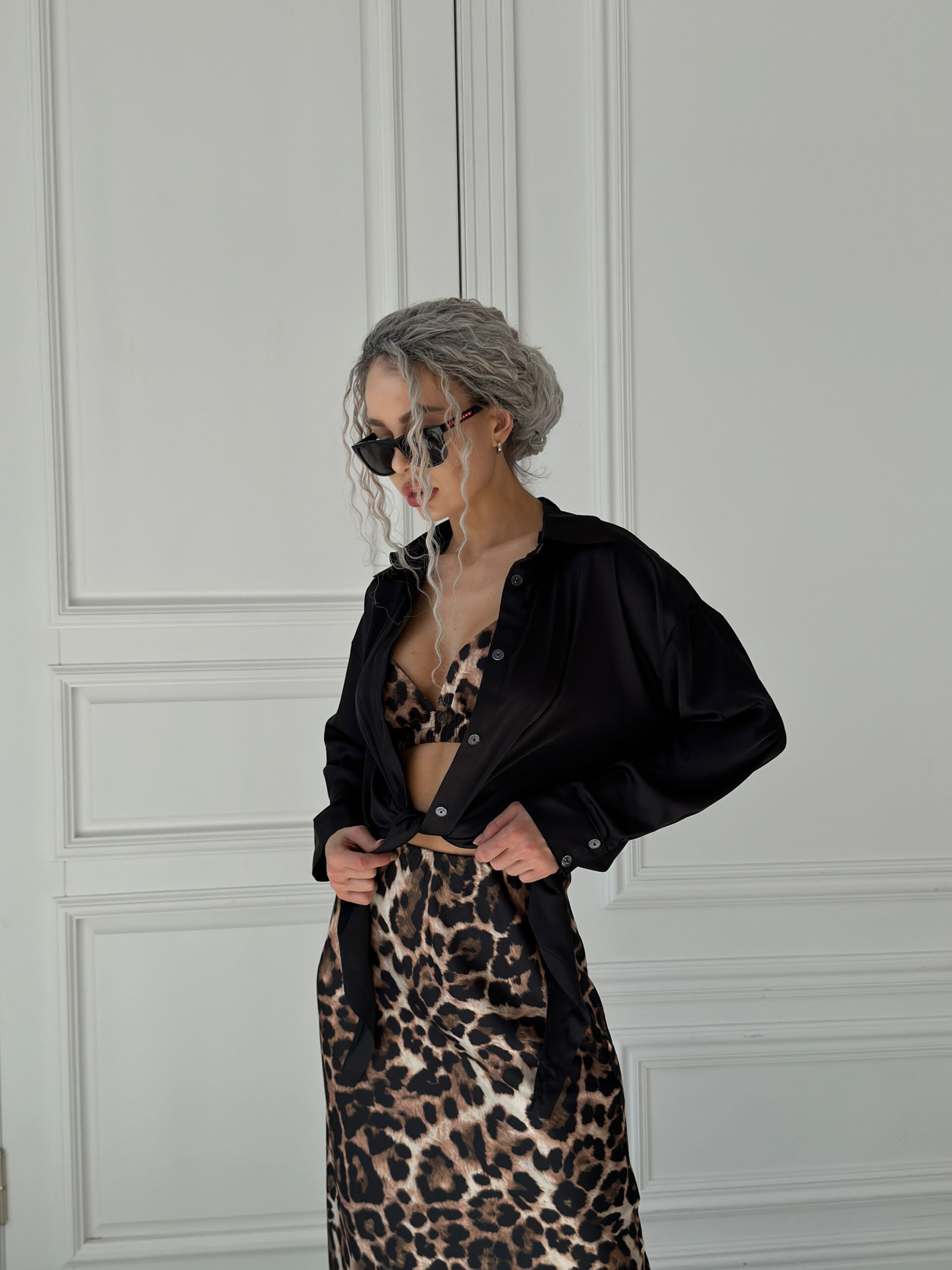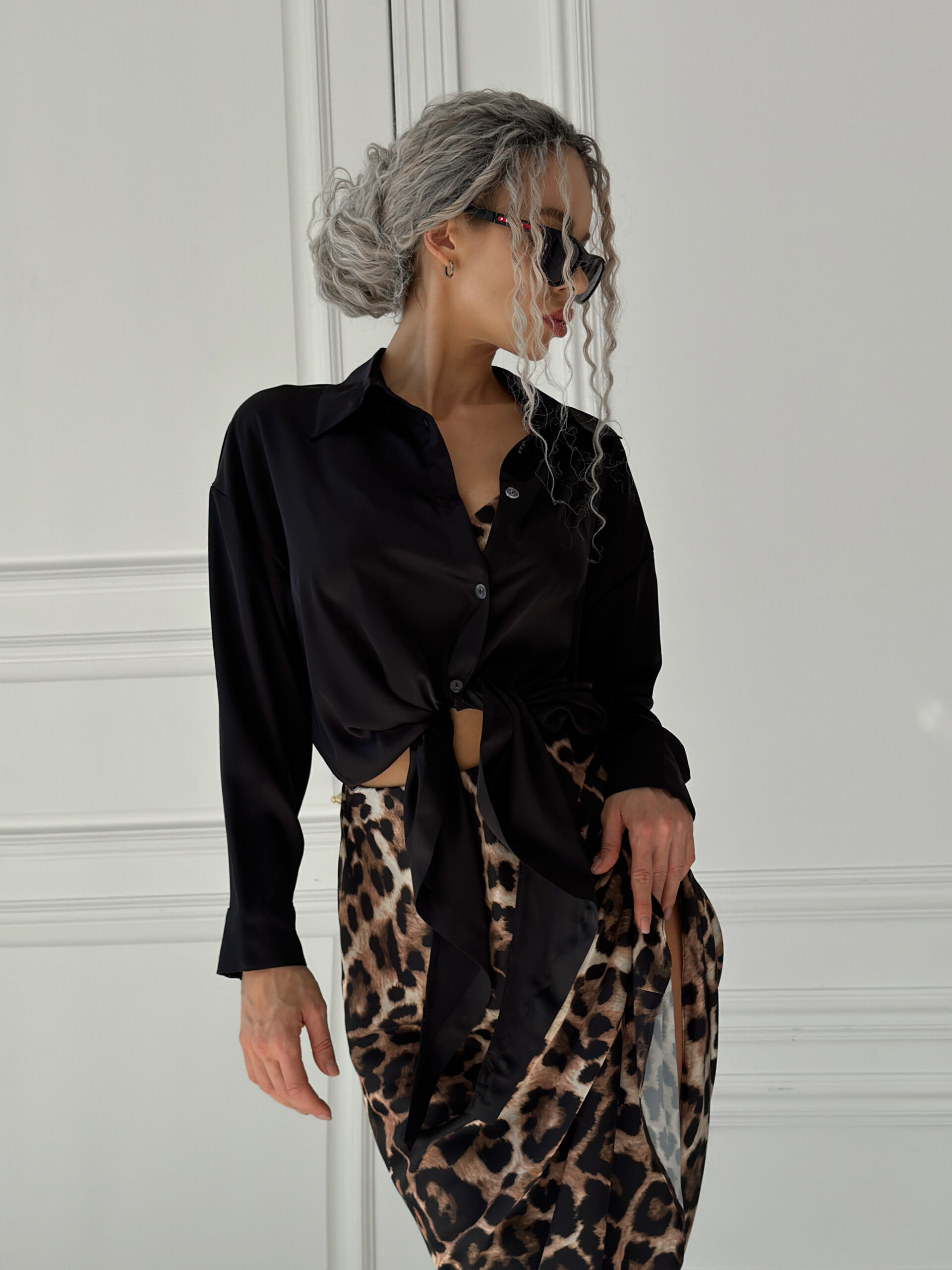 Шовкова сорочка подовжена спереду до низу, шикарно виглядає у зав’язаному вигляді, спідниця міді із топом, неймовірно легкий, приємний до тіла і водночас стильний образ.