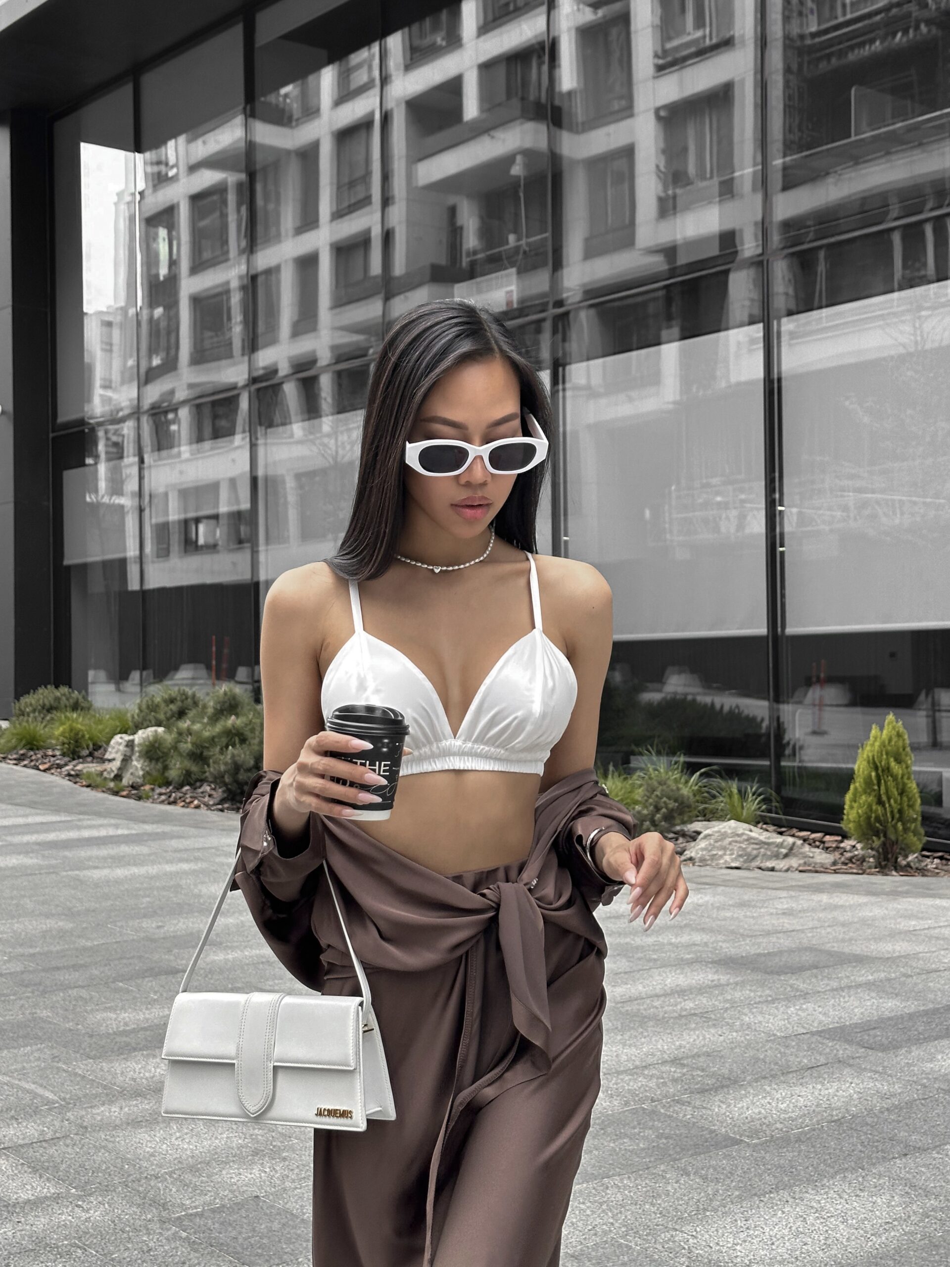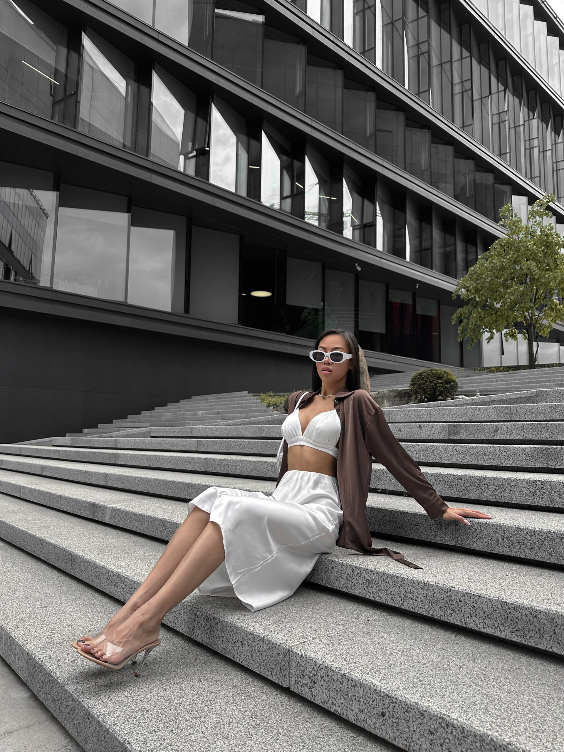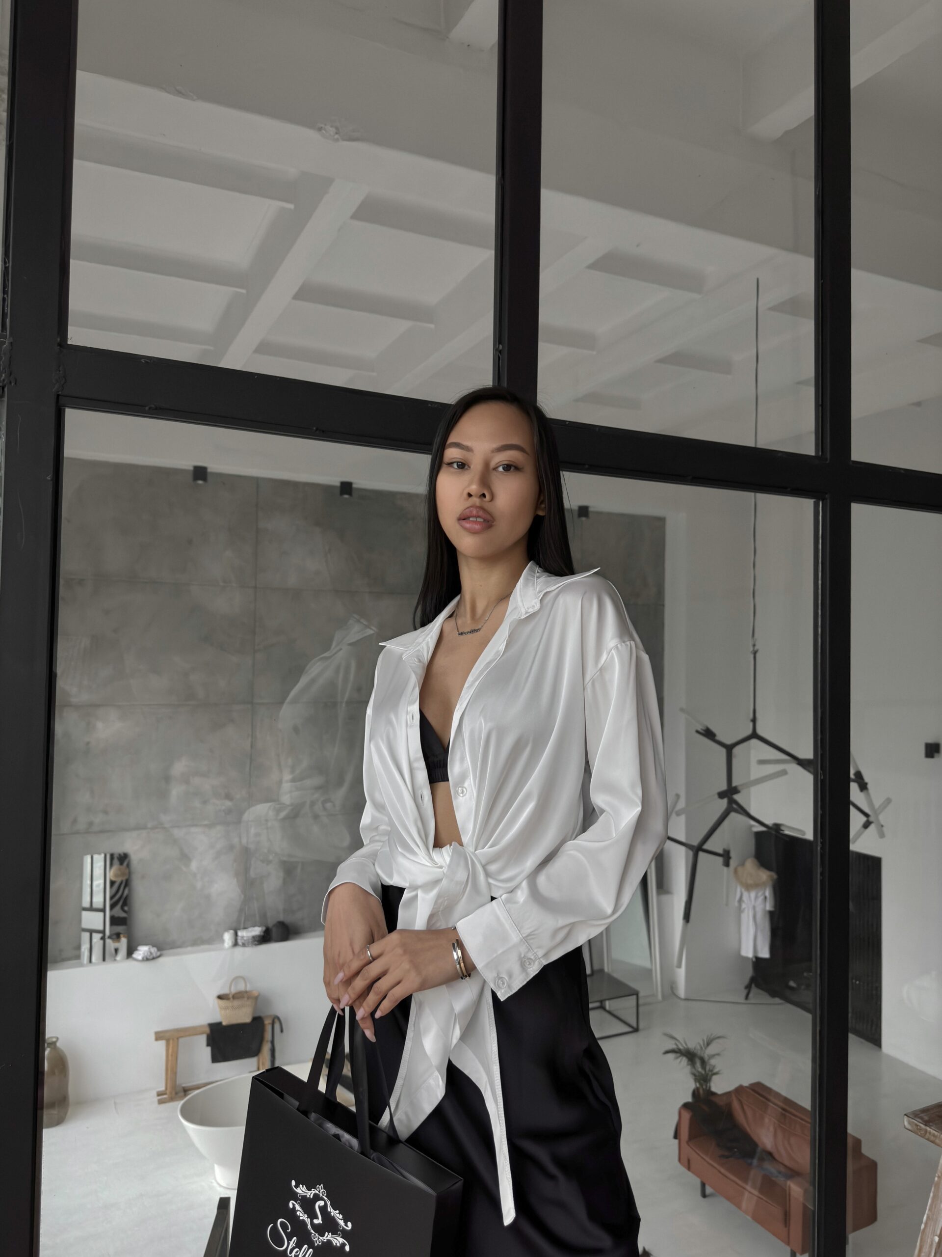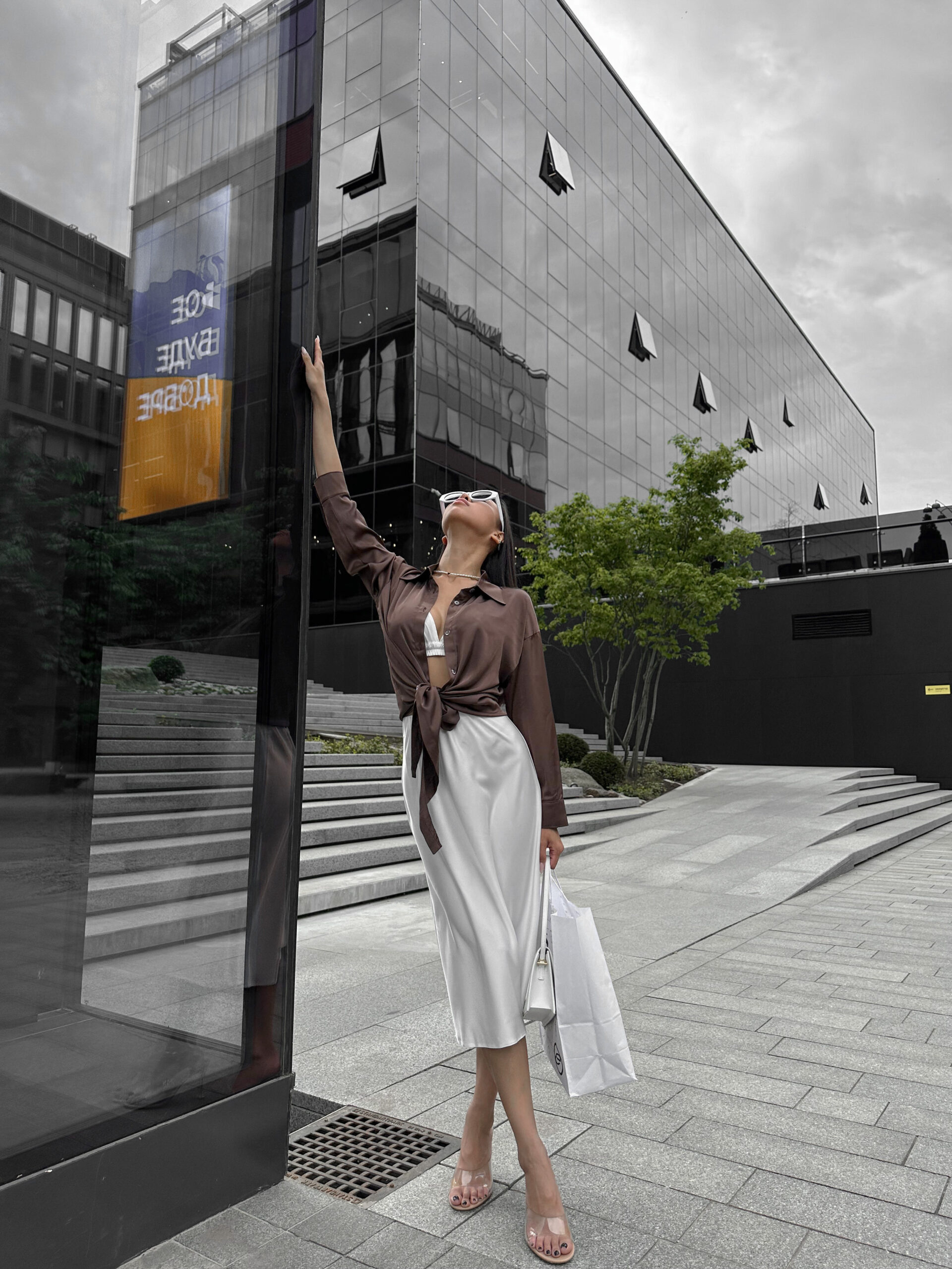 Шовкова сорочка подовжена спереду до низу, шикарно виглядає у зав’язаному вигляді, спідниця міді із топом, неймовірно легкий, приємний до тіла і водночас стильний образ.
