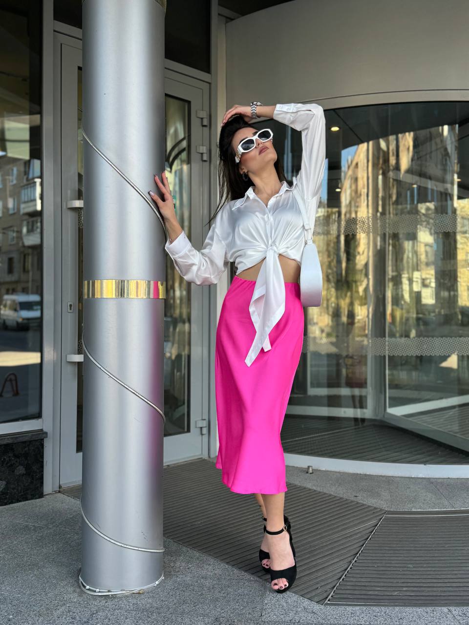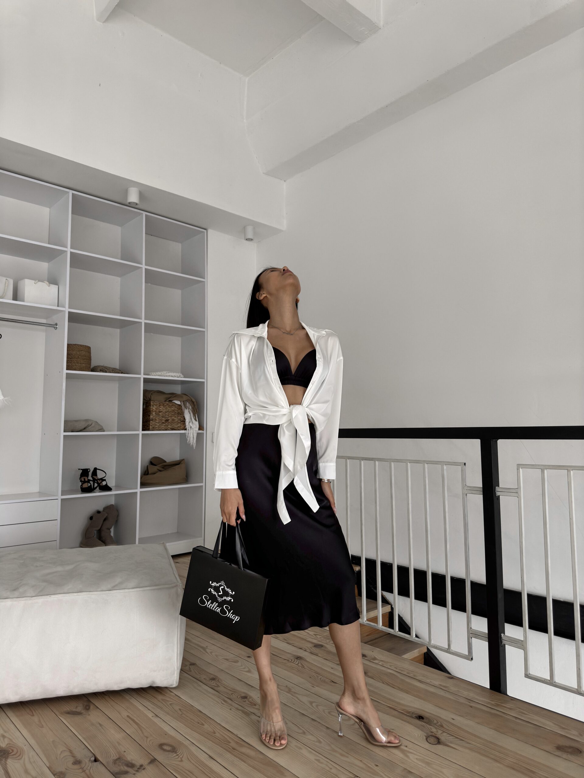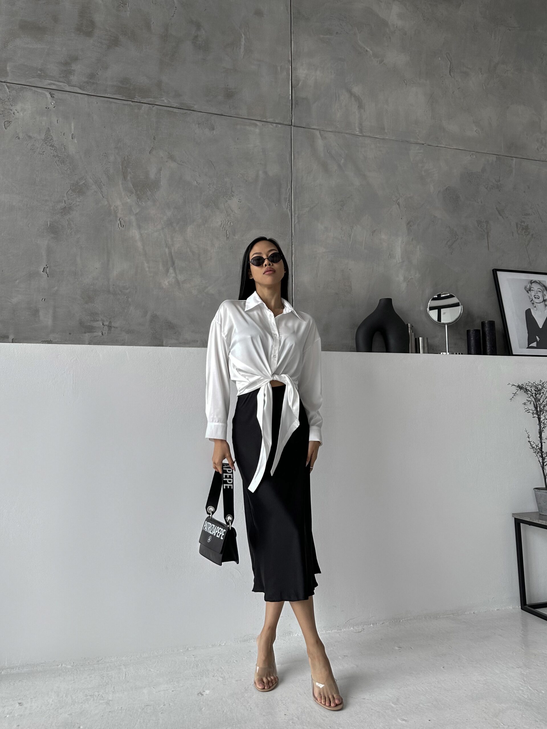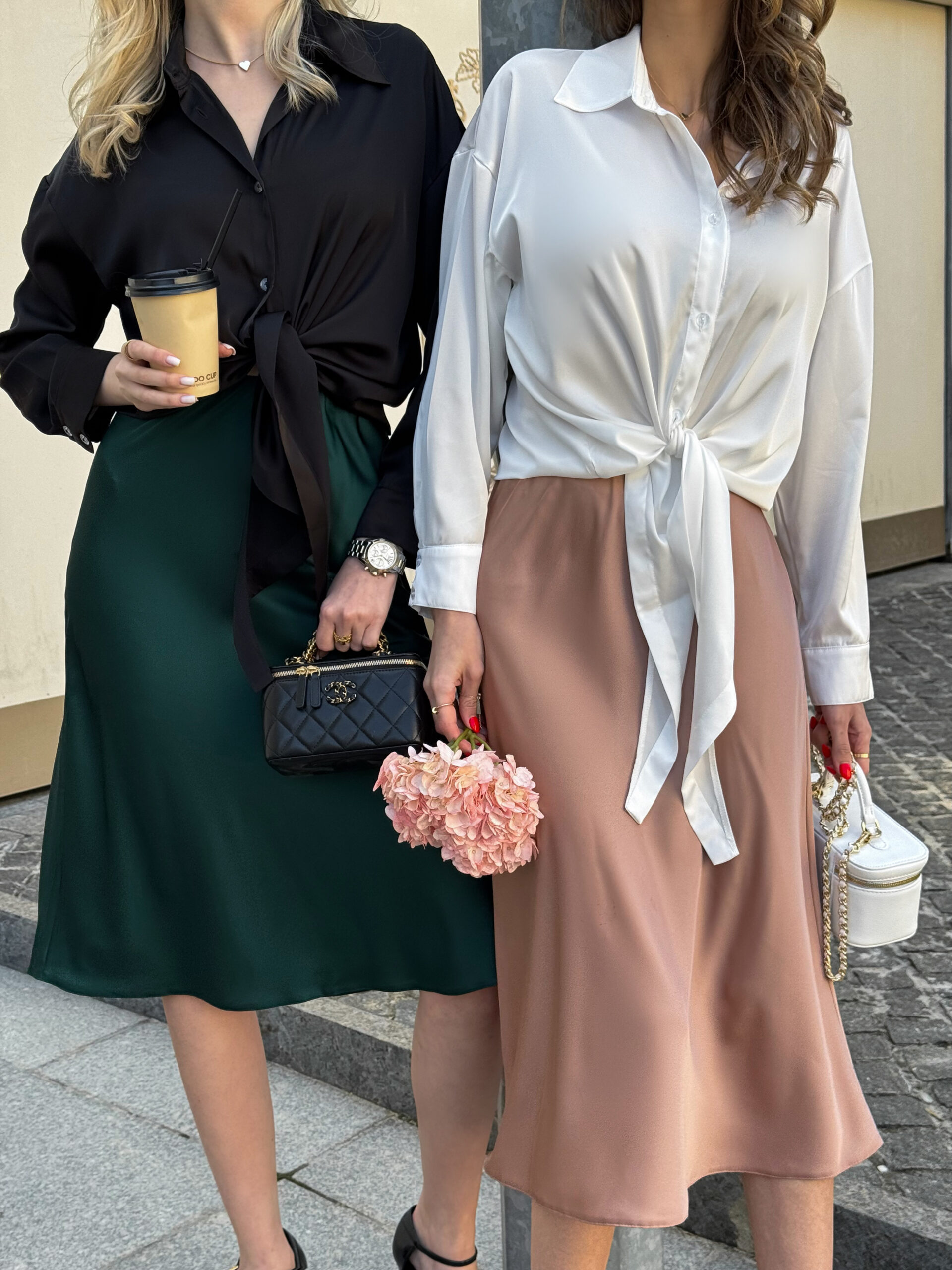 Шовкова сорочка подовжена спереду до низу, шикарно виглядає у зав’язаному вигляді, спідниця міді , неймовірно легкий, приємний до тіла і водночас стильний образ.