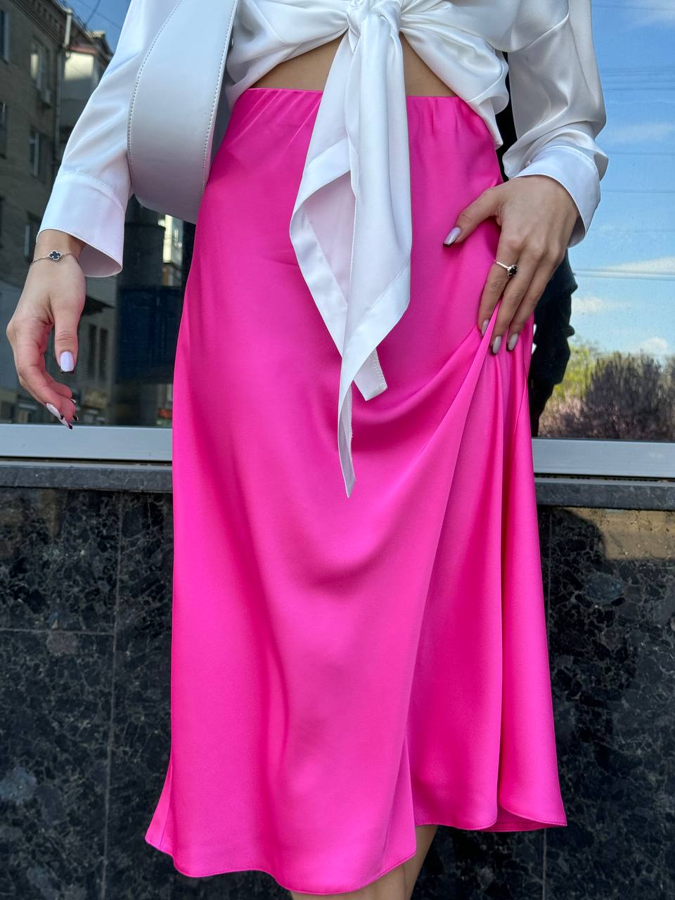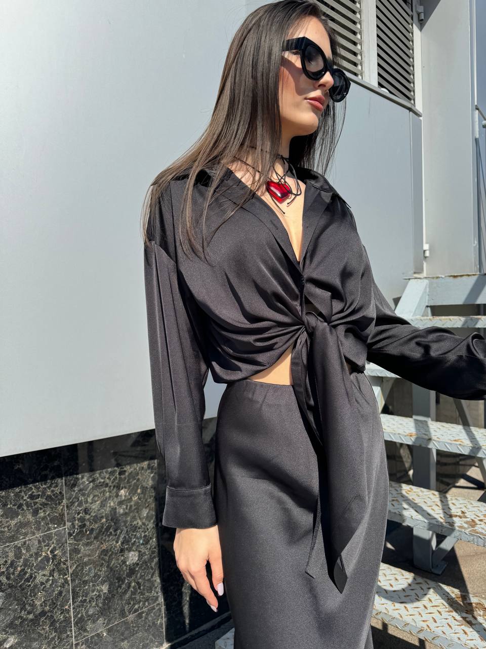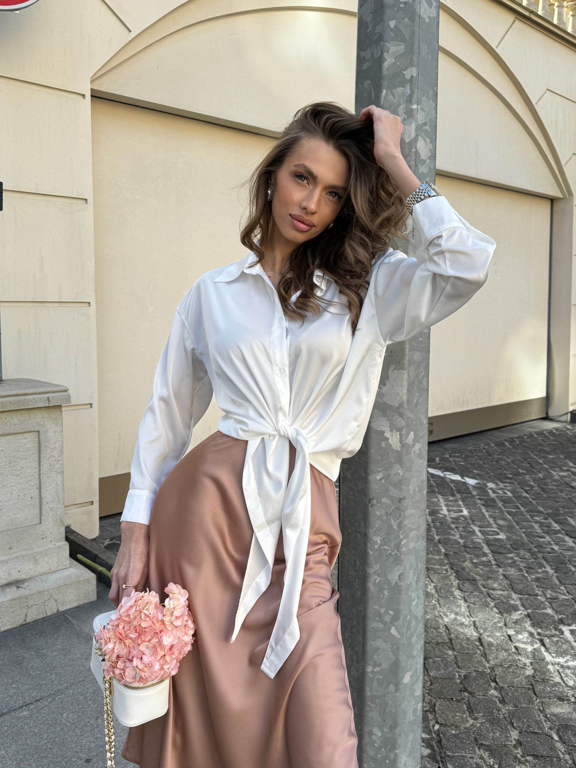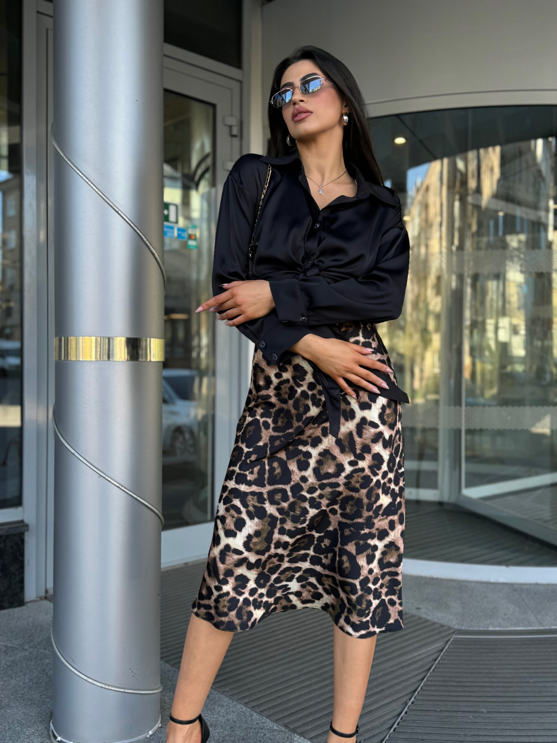 Шовкова сорочка подовжена спереду до низу, шикарно виглядає у зав’язаному вигляді, спідниця міді , неймовірно легкий, приємний до тіла і водночас стильний образ.