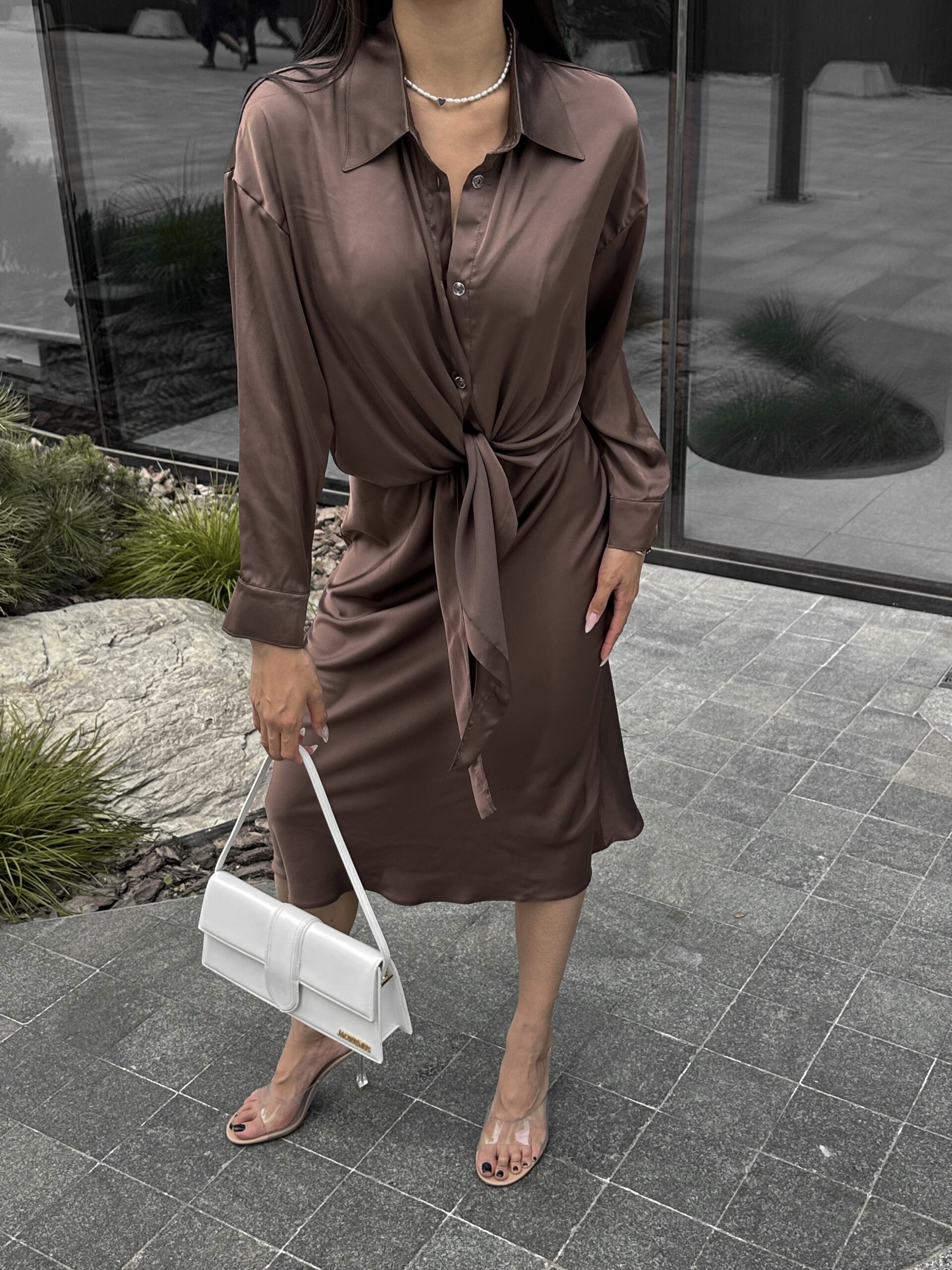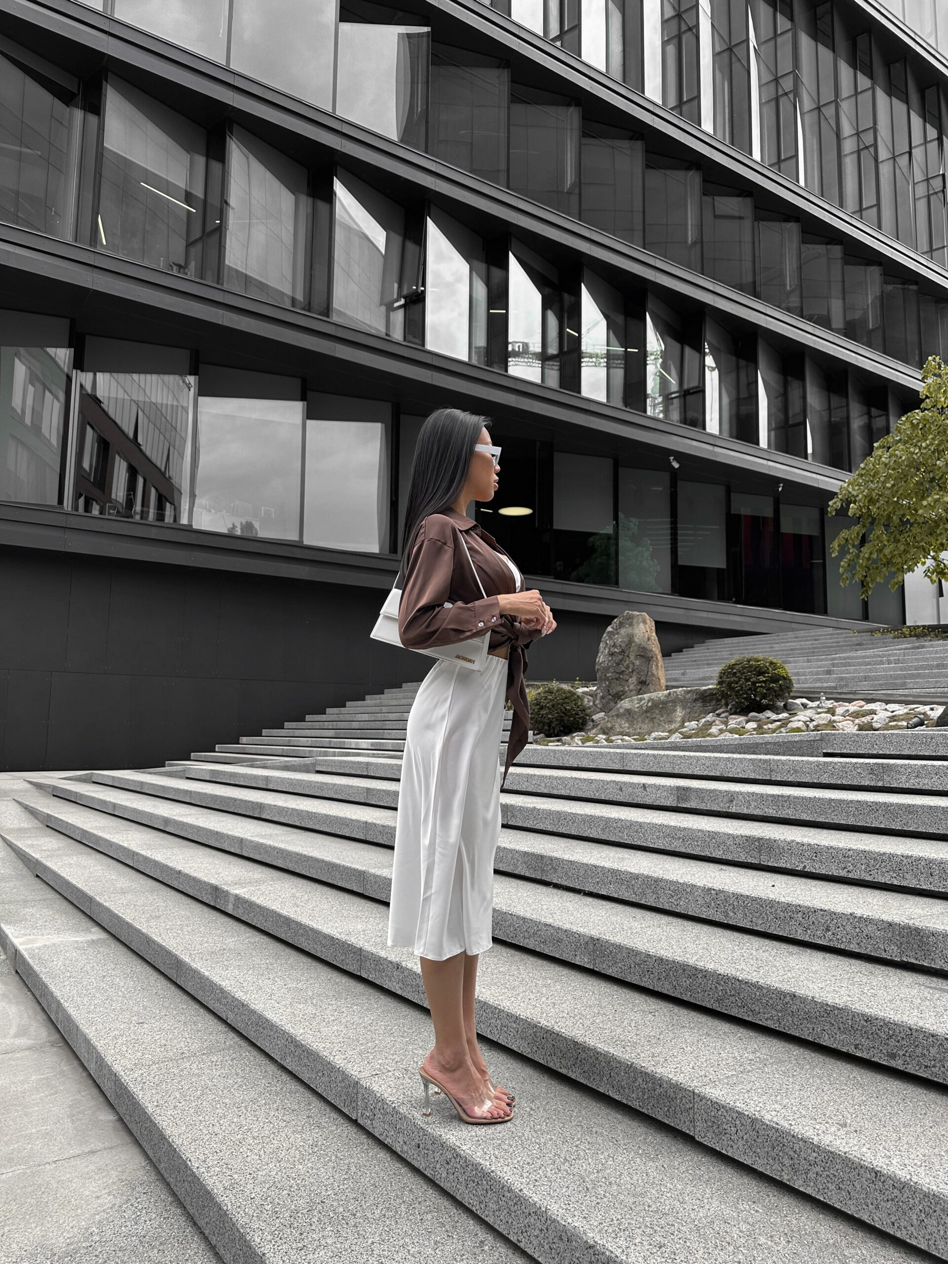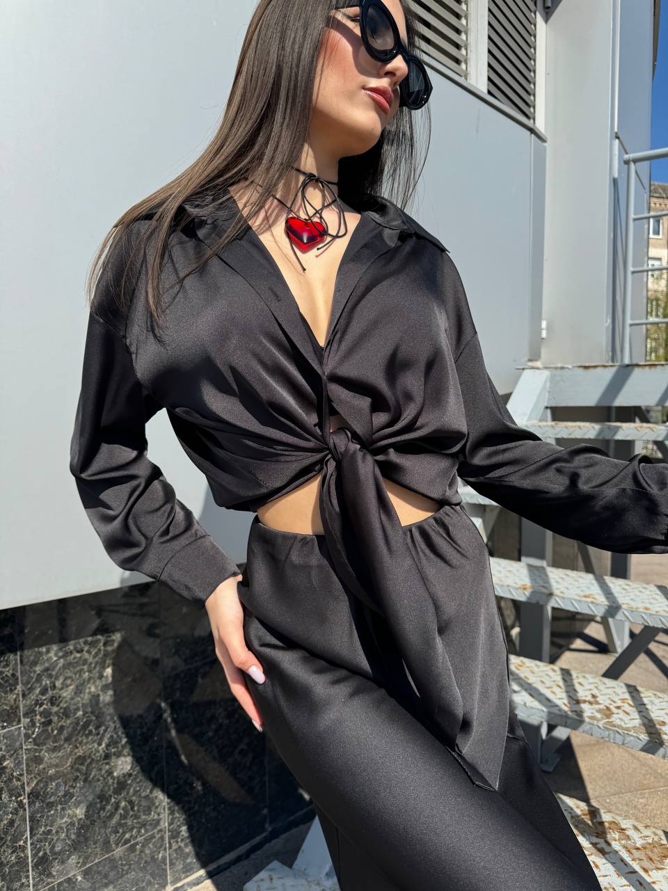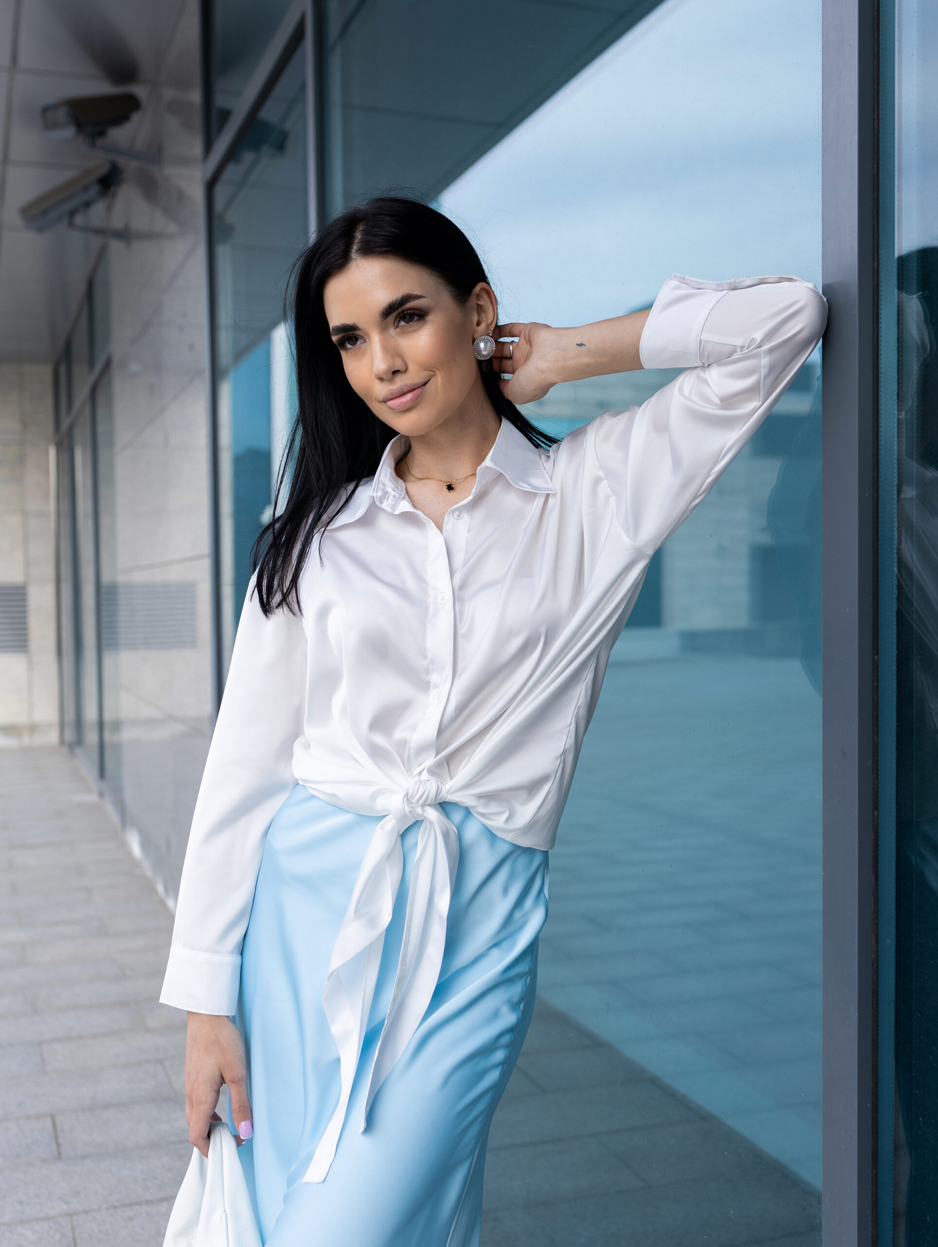 Шовкова сорочка подовжена спереду до низу, шикарно виглядає у зав’язаному вигляді, спідниця міді , неймовірно легкий, приємний до тіла і водночас стильний образ.