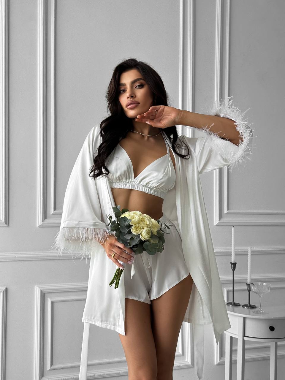 Шовковий комплект (пеньюар з пір’ям +шорти+топ) пеньюар із розкльошеним рукавом зі зйомним пір’ям, топ з відкритою спинкою, бретелі йдуть навхрест, регулюються