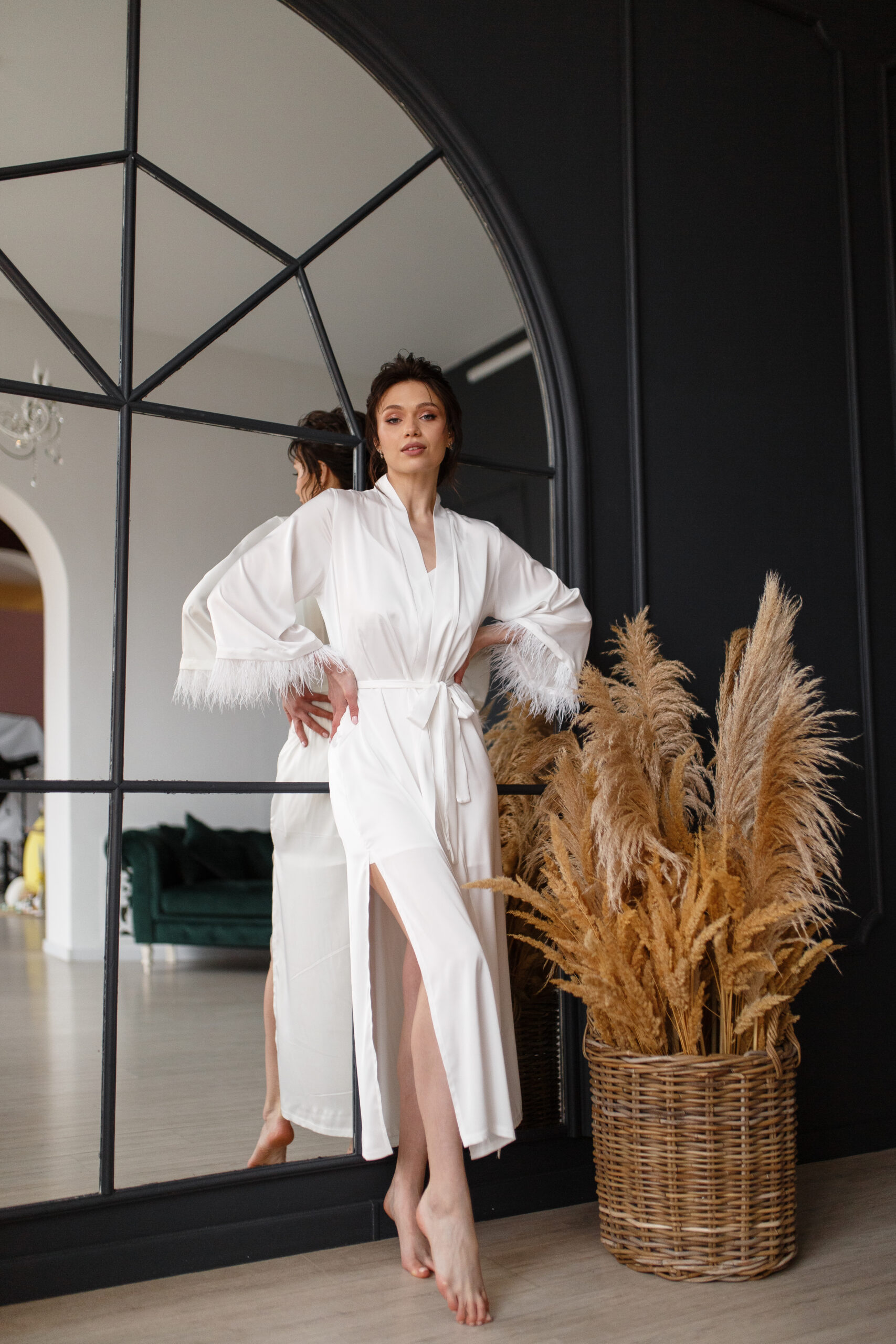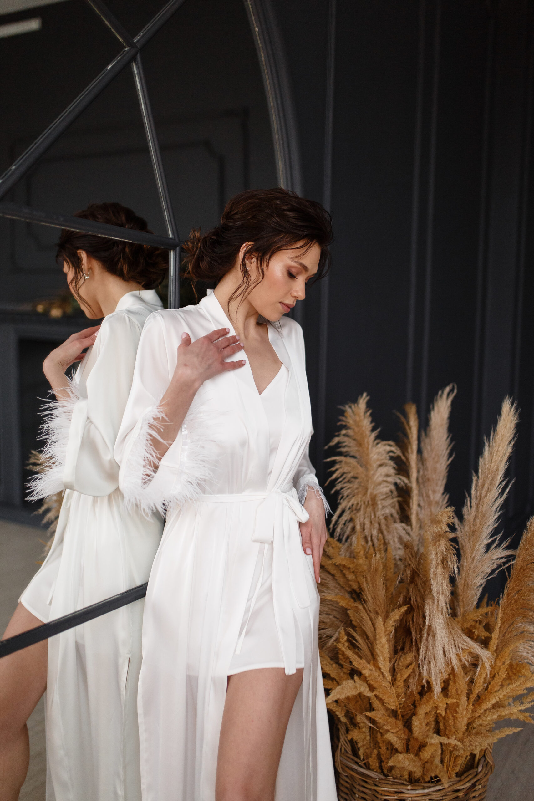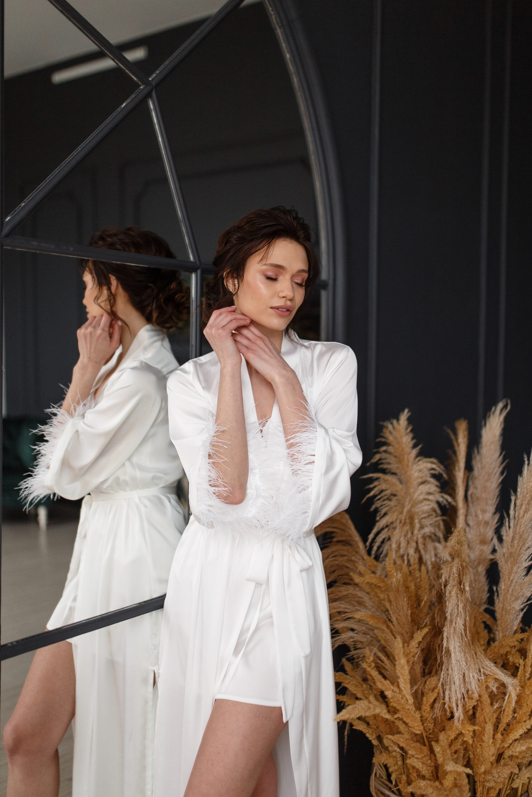 Шовковий комплект (пеньюар максі з пір’ям +сорочка) пеньюар із розкльошеним рукавом зі зйомним пір’ям, Сорочка з V-подібним вирізом на грудях і прямою спинкою, бретелі на регулюванні