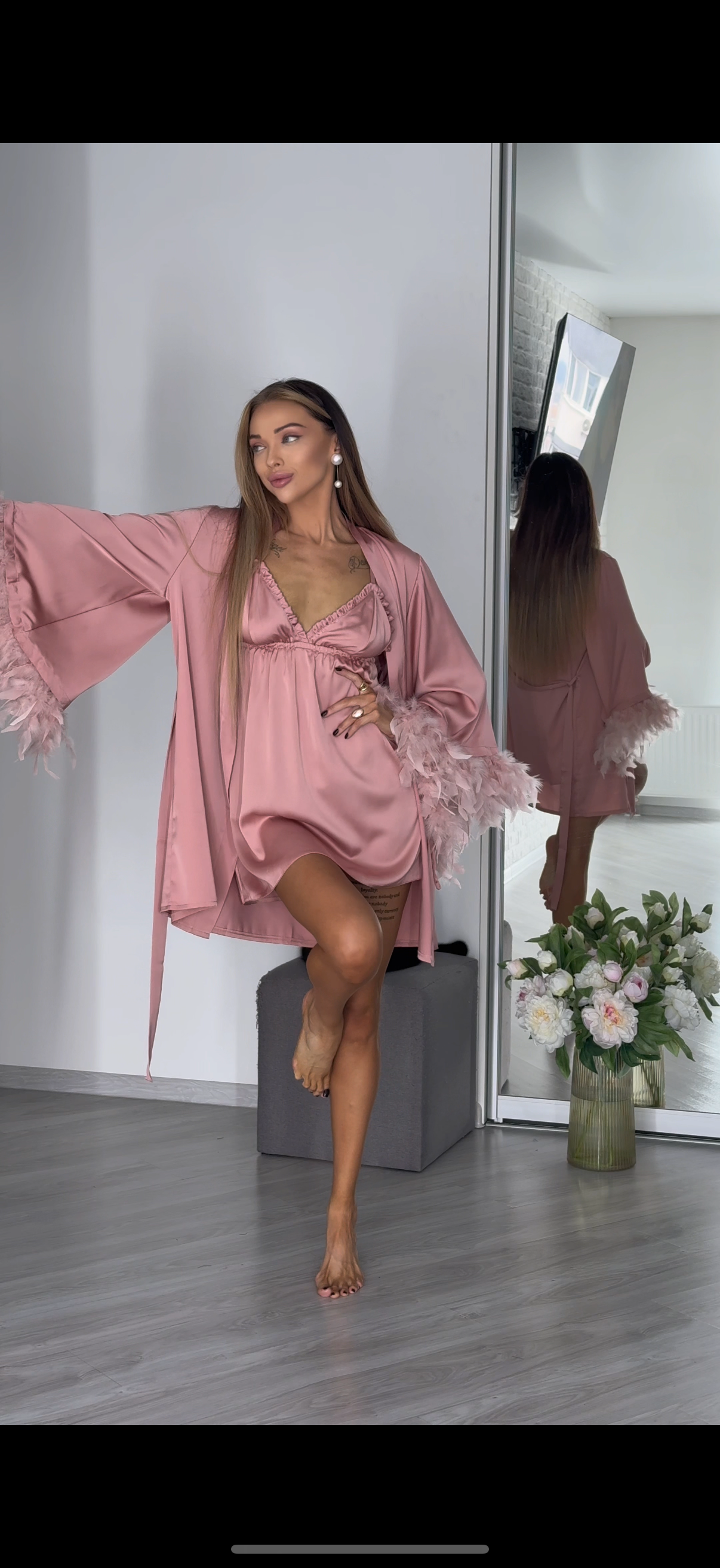 Ніжний і надзвичайно ефектний пеньюар міні зі зйомним пір’ям та сорочка рюш, бретелі йдуть навхрест, регулюються