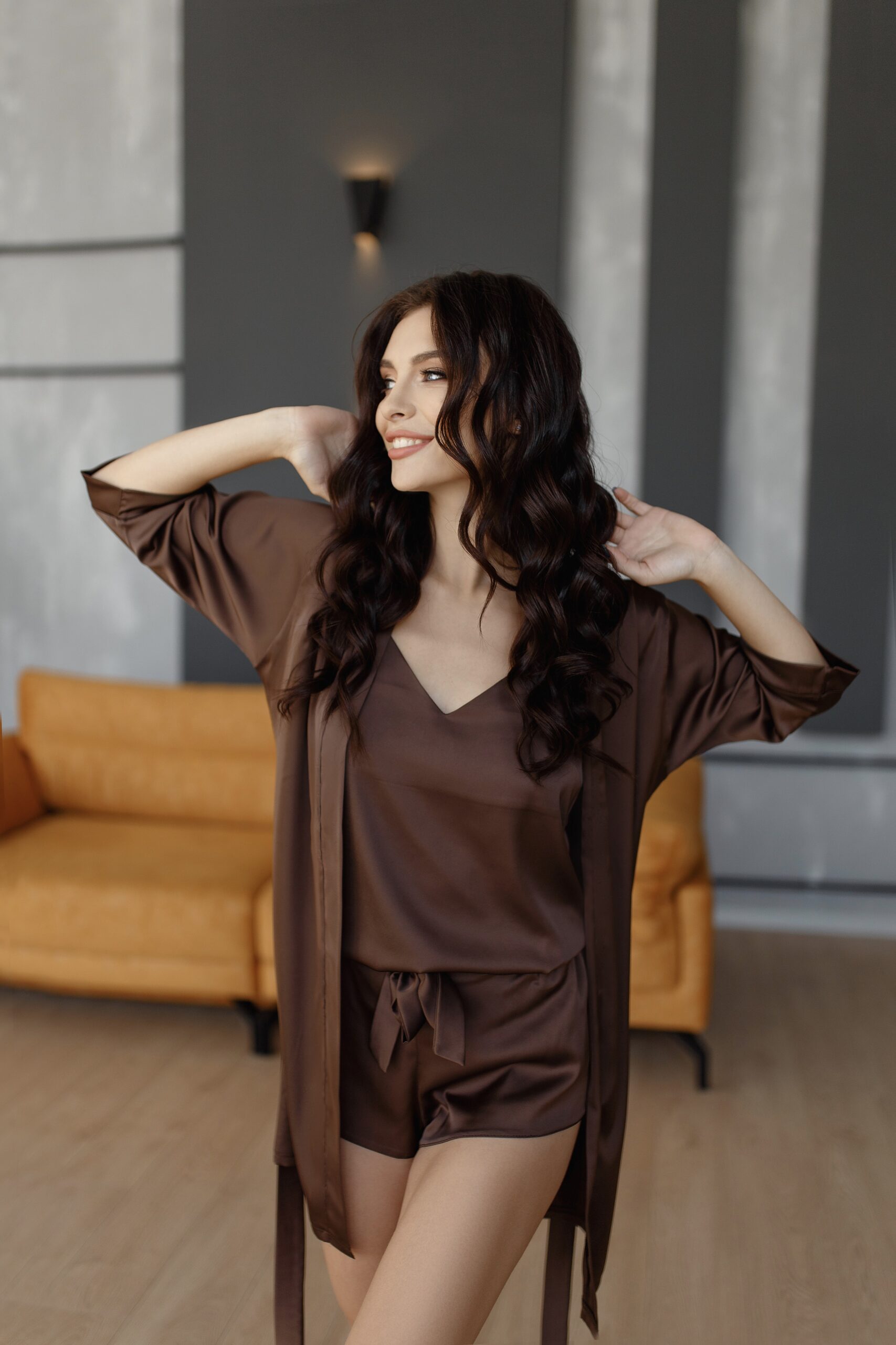 Пеньюар з рукавом 3/4, шортики високої посадки на резинці з декоративними зав’язками+ маєчка з V-подібним вирізом на грудях , бретелі на регулюванні