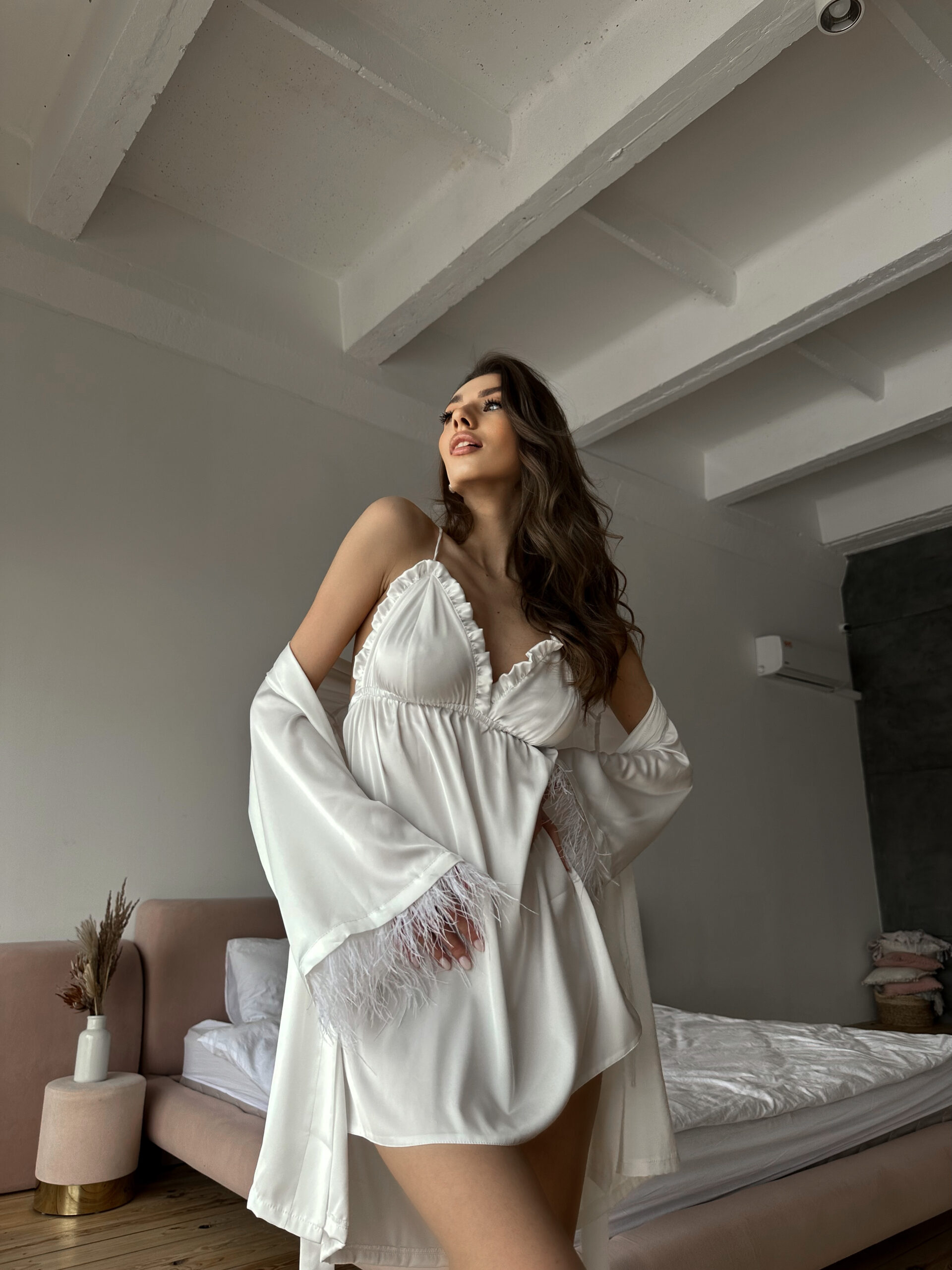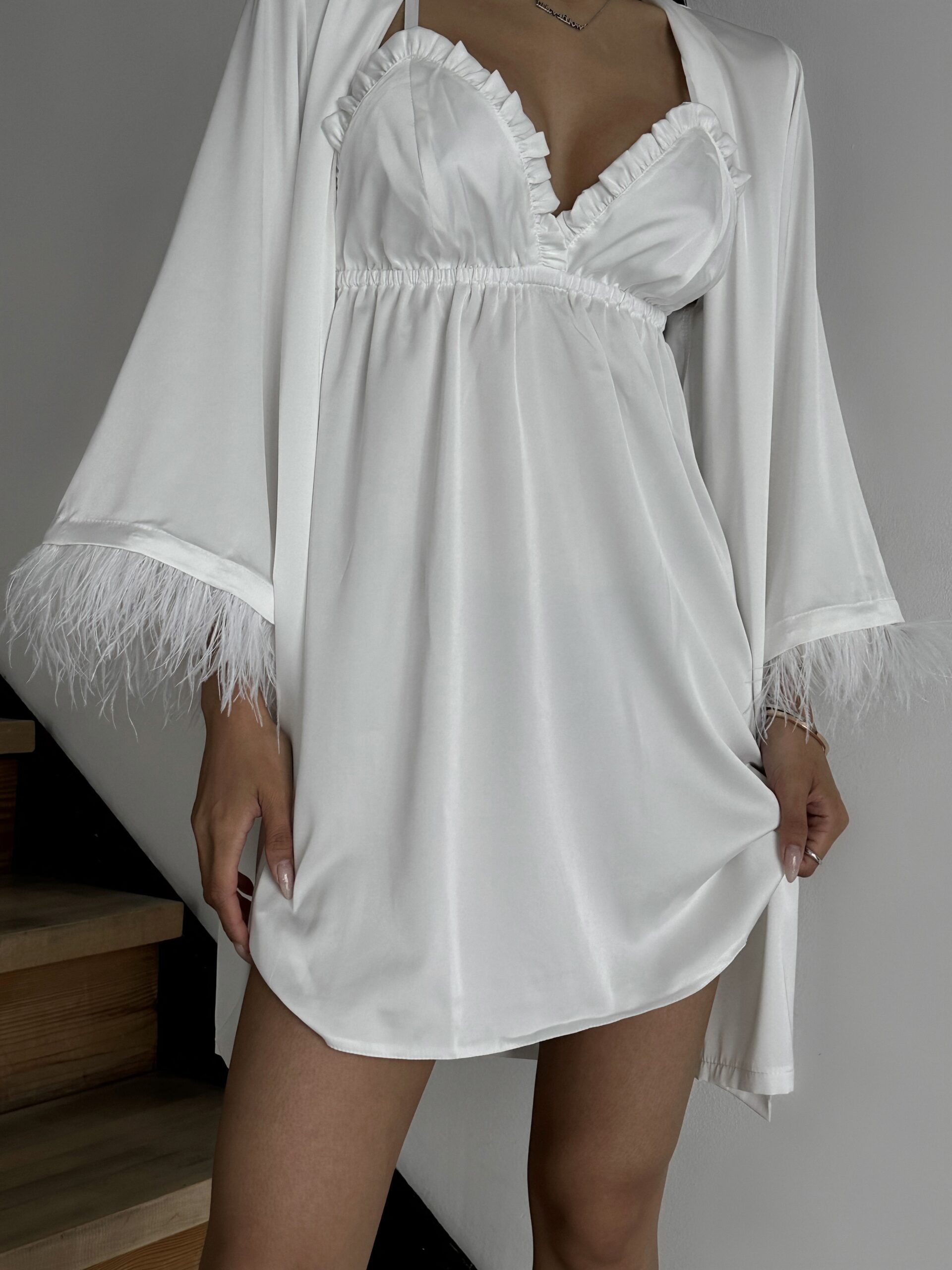 Шовковий комплект (пеньюар з пір’ям +сорочка рюш) пеньюар із розкльошеним рукавом зі зйомним пір’ям , сорочка з рюшами, вікрита спинка, бретелі йдуть навхрест, регулюються