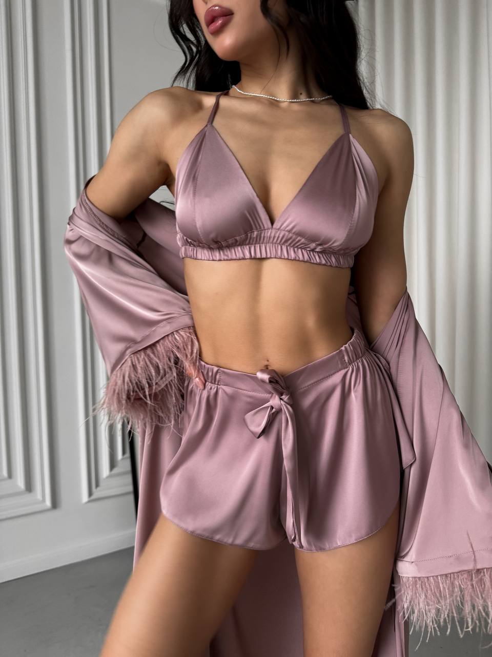 Шовковий комплект (пеньюар максі зі зйомним пір’ям +шорти+топ)