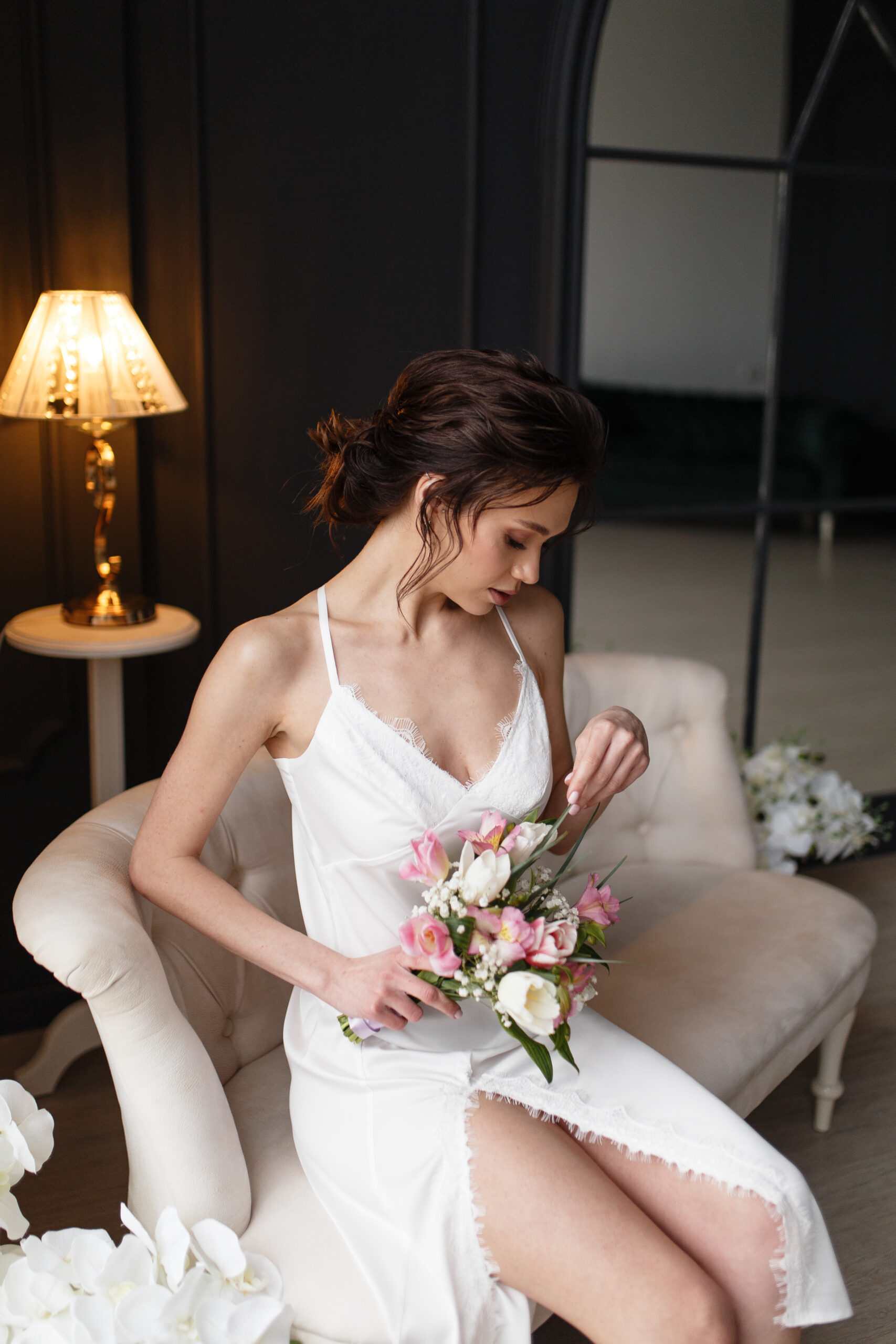 Шовкова сорочка міді із мереживом і розрізом на ніжці повсякденного використання.