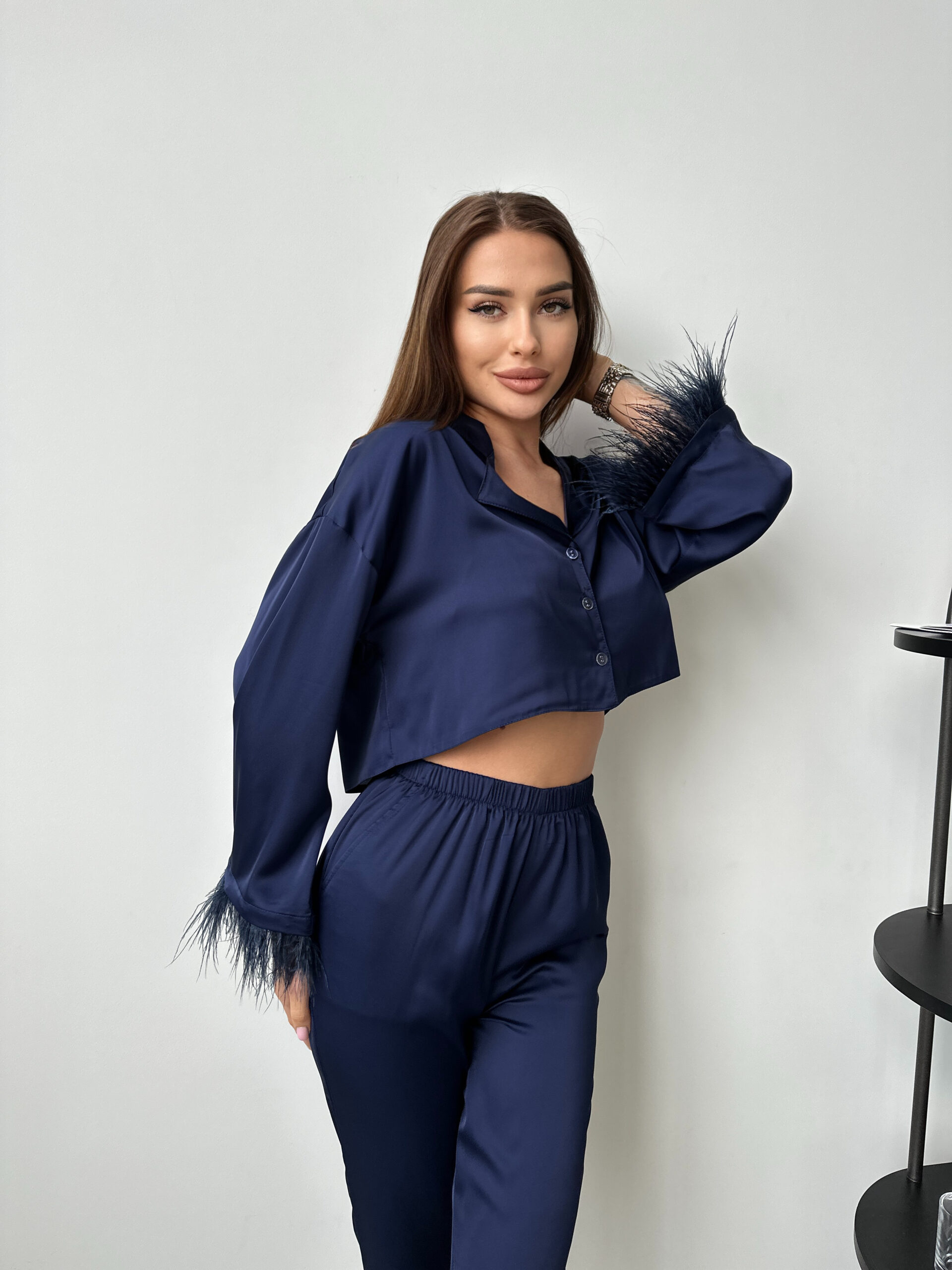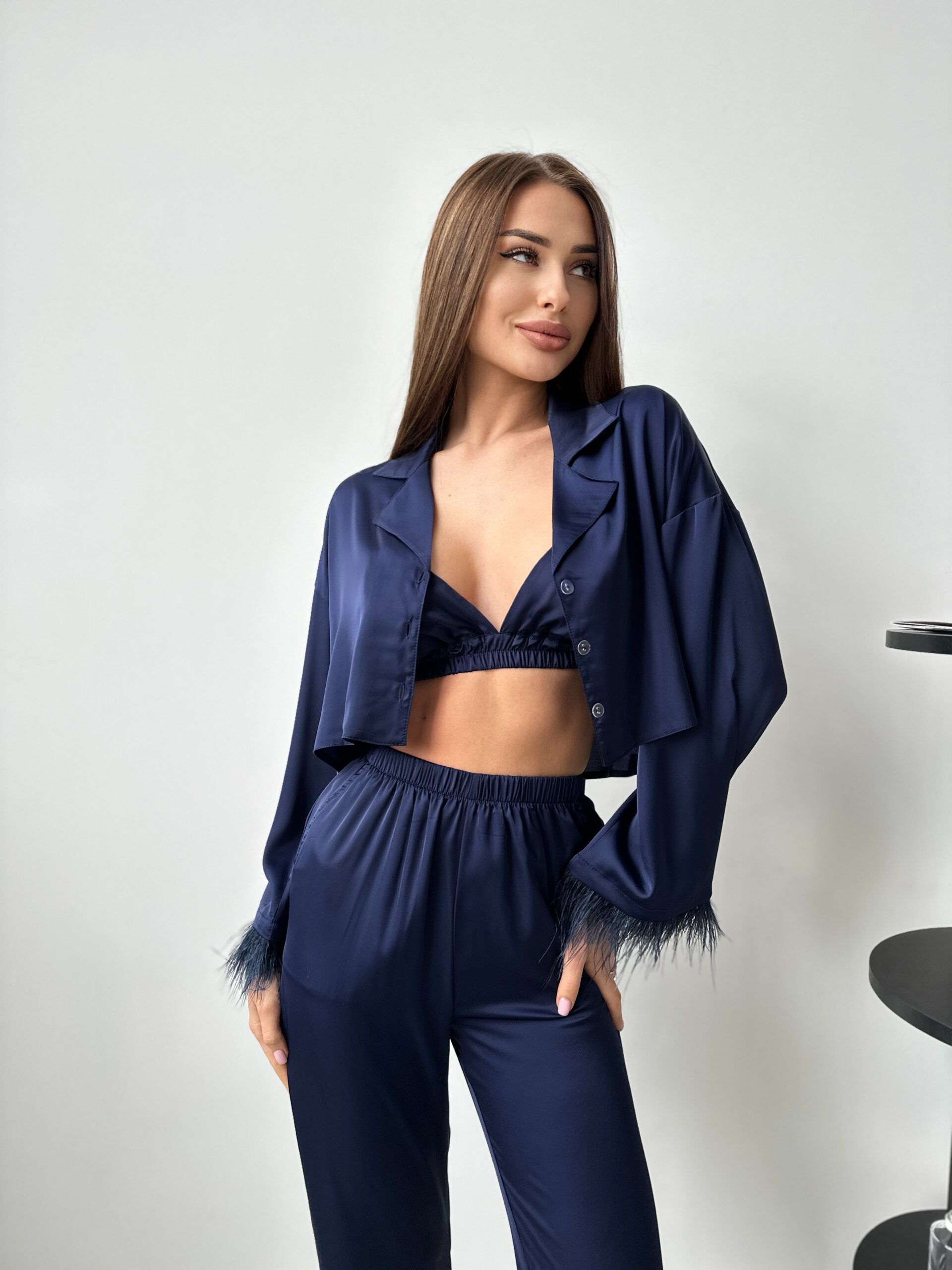Шовковий комплект з укороченою сорочкою зі зйомним пір’ям, штанами і топом
