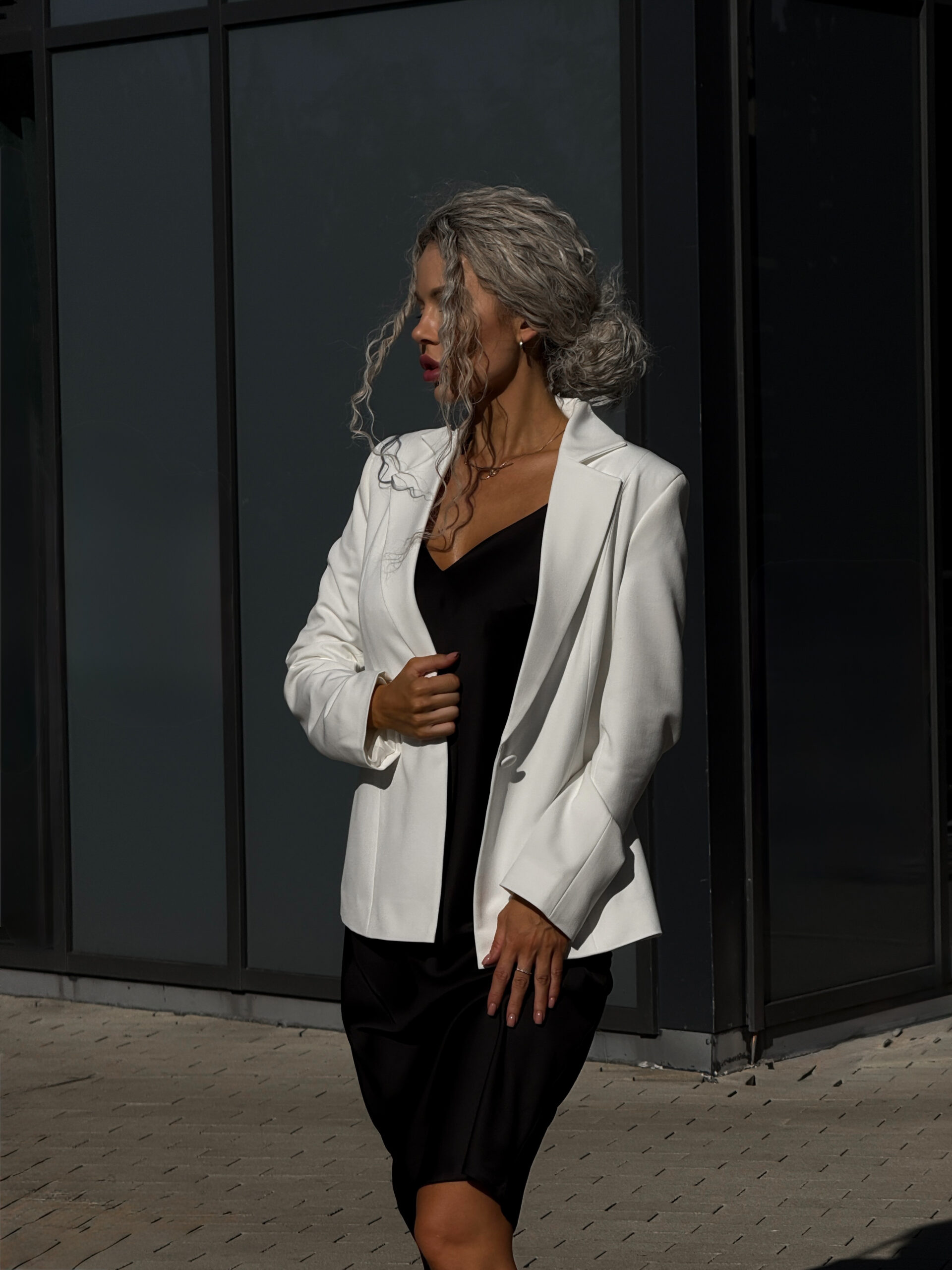 Приталений жакет виконаний з костюмної тканини. Легка підклада забезпечує комфорт. Застібається на ґудзик, додаючи класичного шарму, а приталений крій підкреслює фігуру, додаючи образу жіночності та елегантності. Ідеально поєднується як із сукнею, так і з класичними брюками чи спідницею — універсальний варіант для ділового або вечірнього образу.