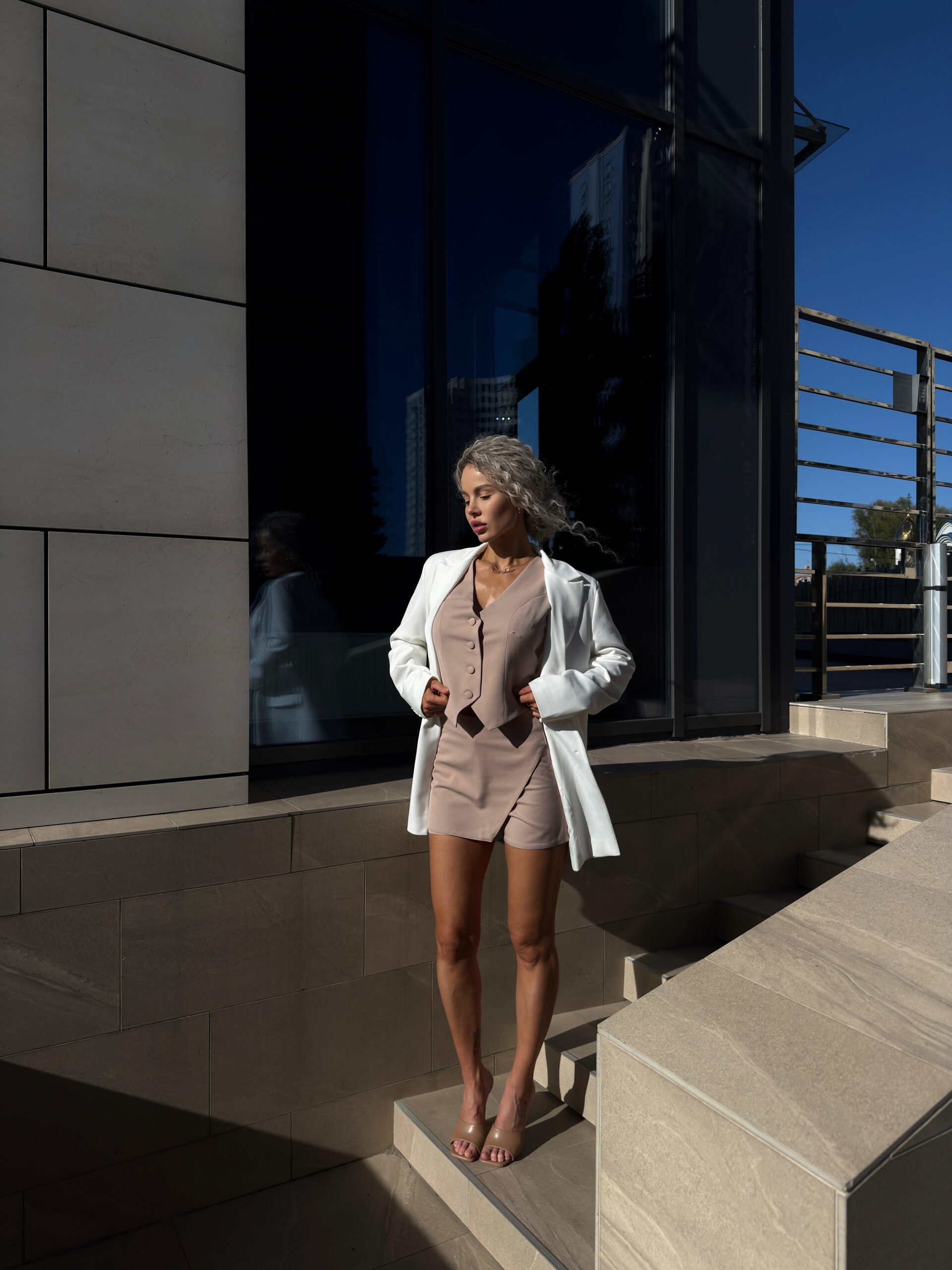 Жакет вільного крою виконаний з костюмної тканини. Легка підклада забезпечує комфорт. Застібається на ґудзики, додаючи класичного шарму, а функціональні кармани роблять жакет не тільки стильним, а й практичним, у жакету є підплічники, які роблять гарний силует, також у комплекті до жакету є пояс, щоб підкреслити талію.