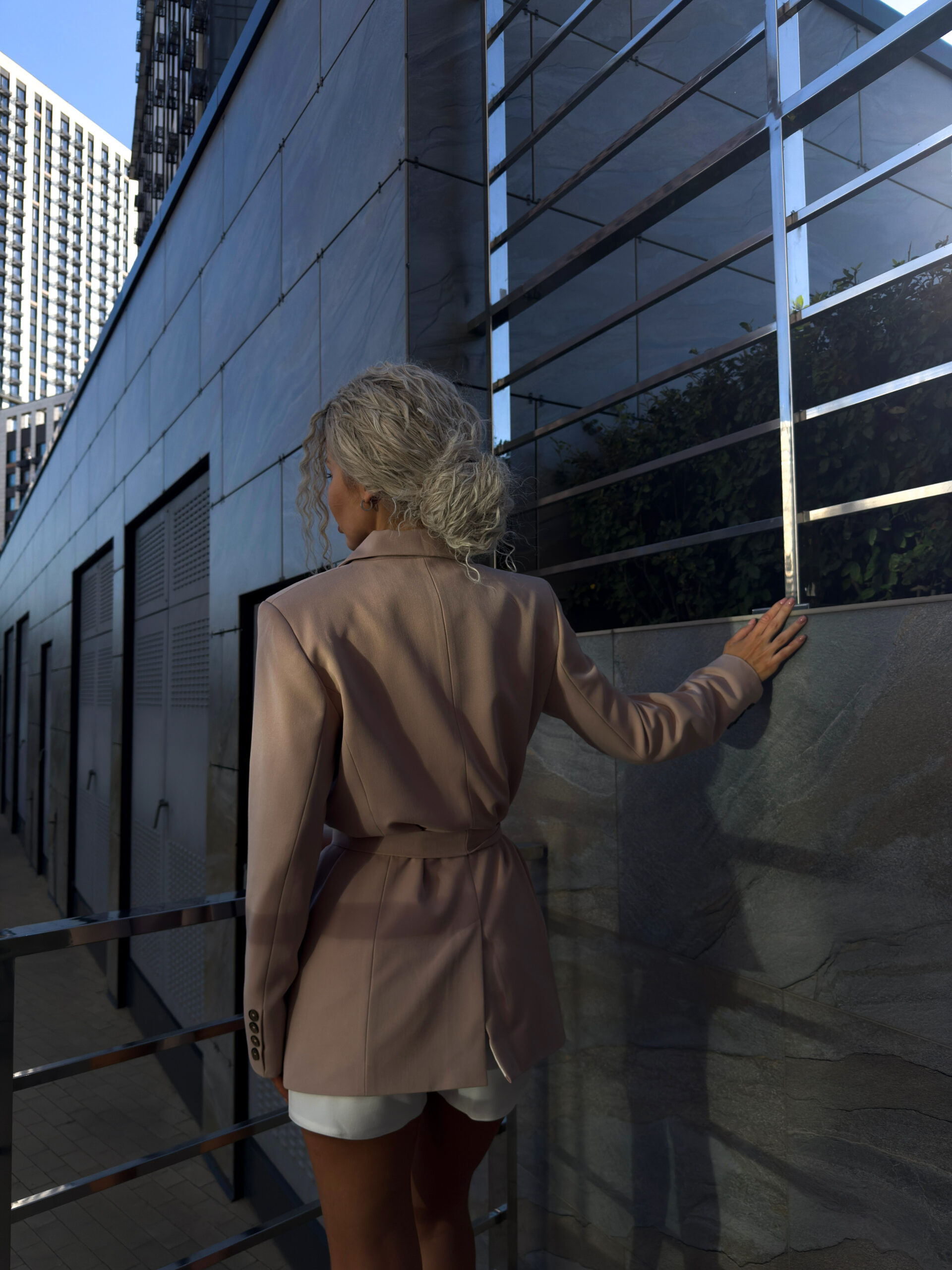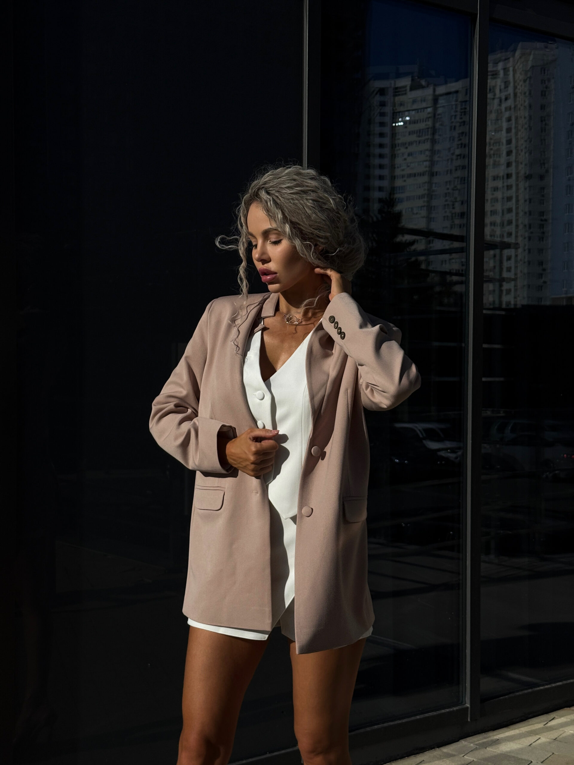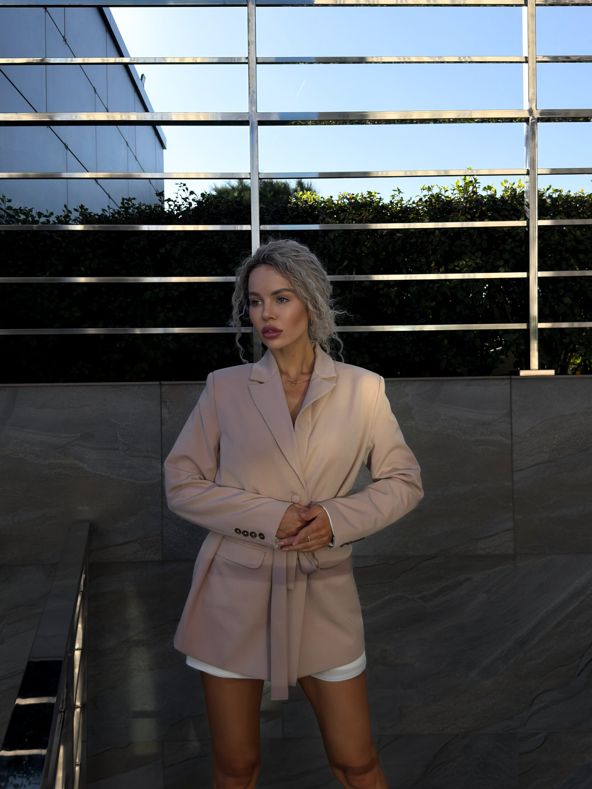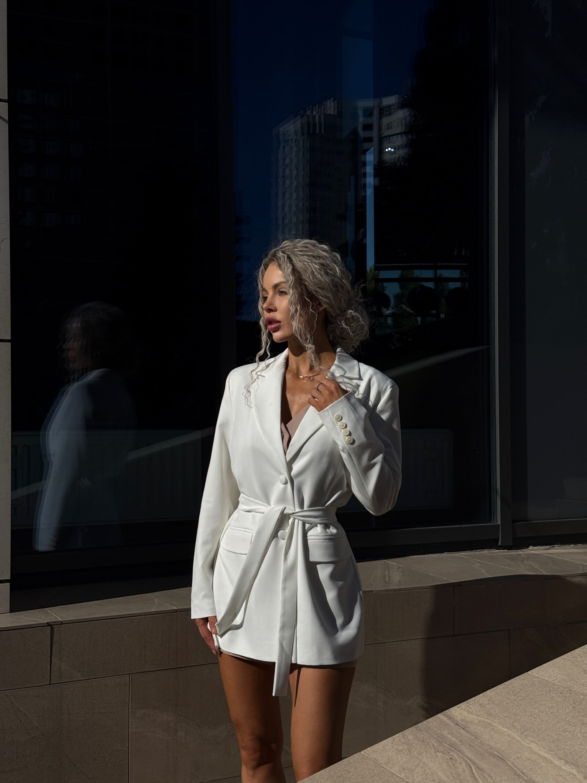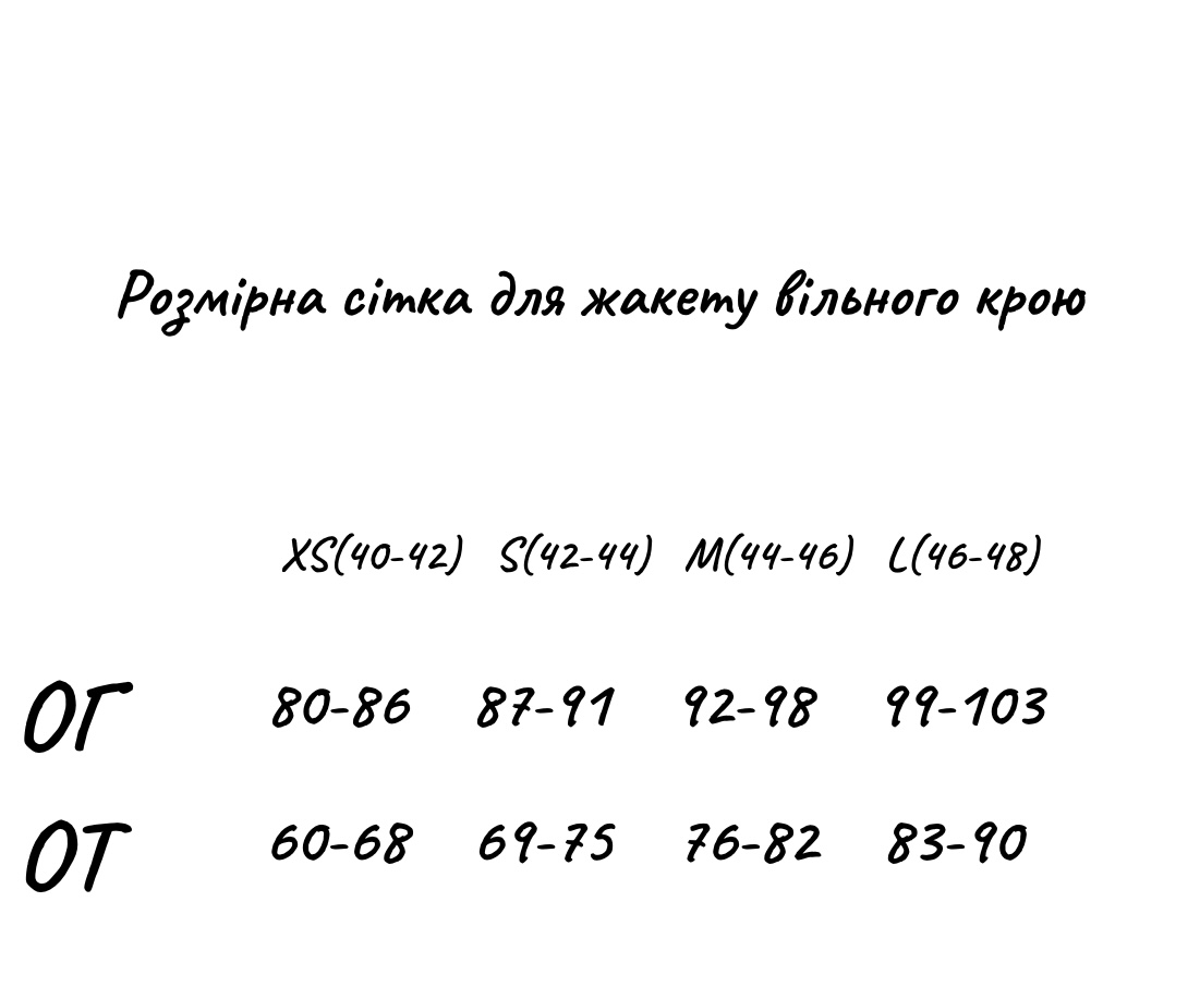 Жакет вільного крою виконаний з костюмної тканини. Легка підклада забезпечує комфорт. Застібається на ґудзики, додаючи класичного шарму, а функціональні кармани роблять жакет не тільки стильним, а й практичним, у жакету є підплічники, які роблять гарний силует, також у комплекті до жакету є пояс, щоб підкреслити талію.