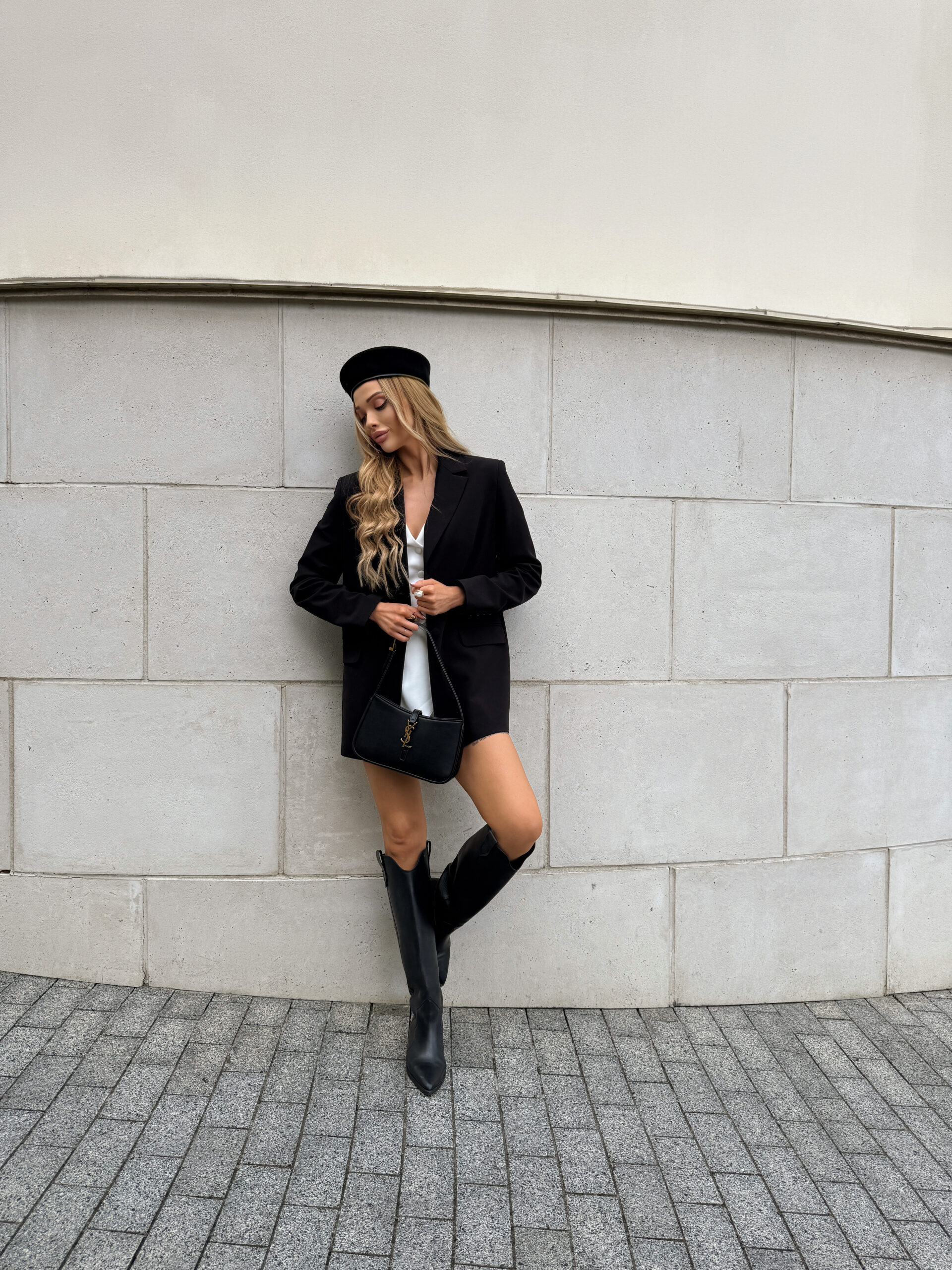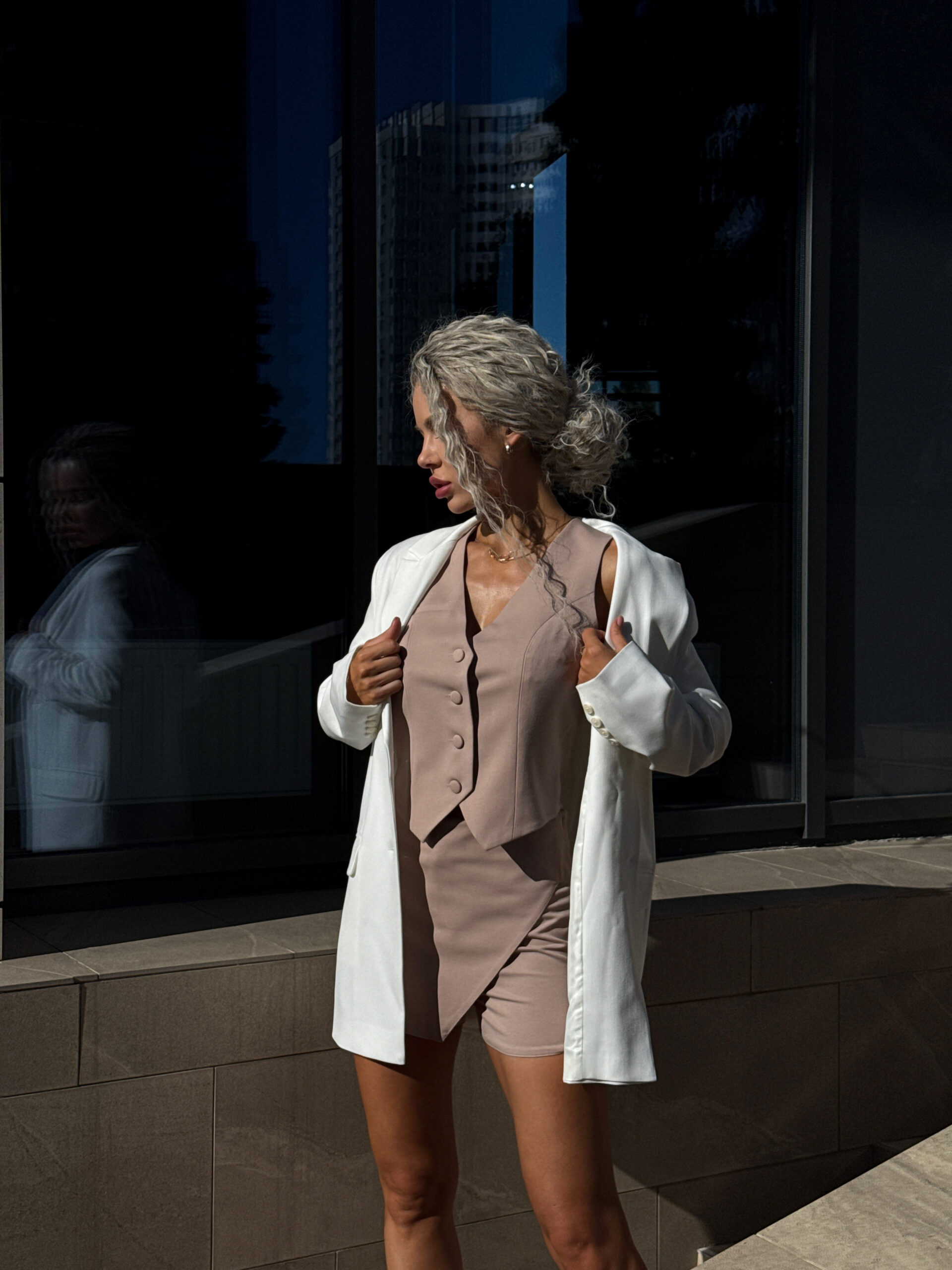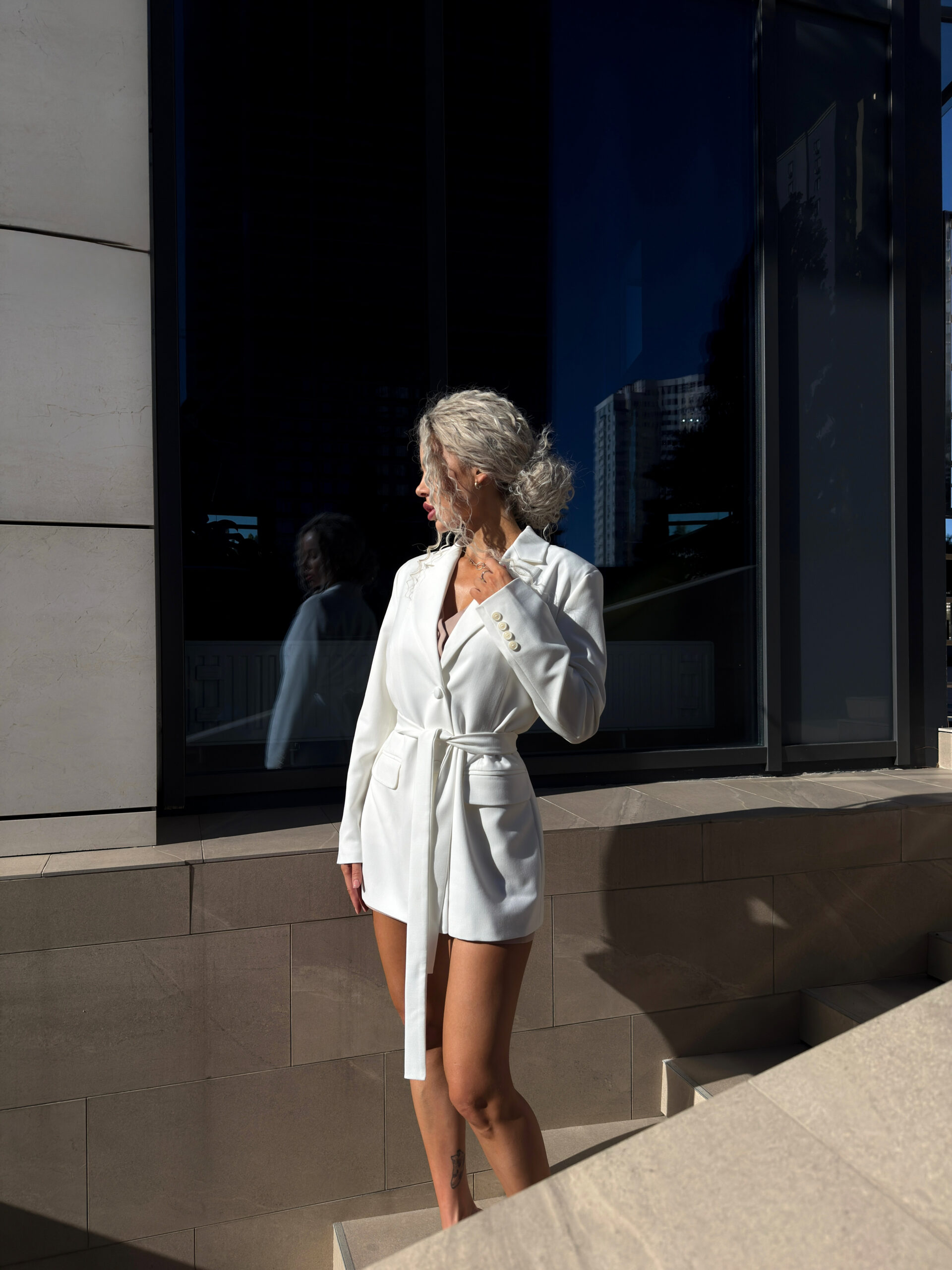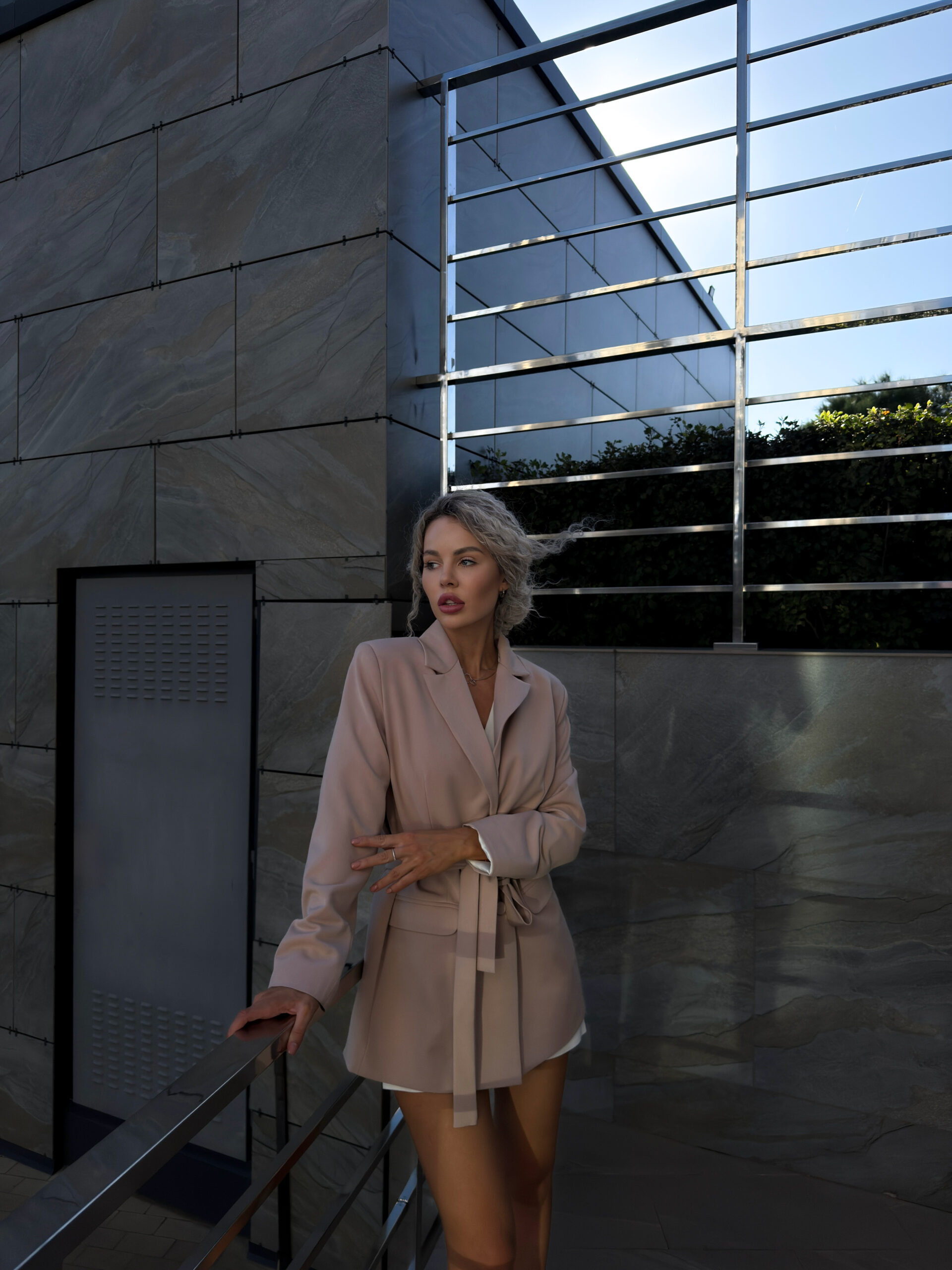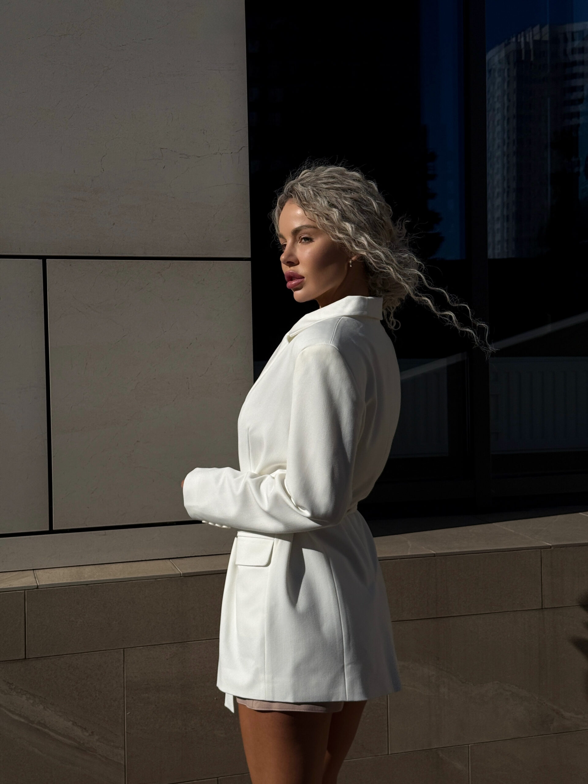 Жакет вільного крою виконаний з костюмної тканини. Легка підклада забезпечує комфорт. Застібається на ґудзики, додаючи класичного шарму, а функціональні кармани роблять жакет не тільки стильним, а й практичним, у жакету є підплічники, які роблять гарний силует, також у комплекті до жакету є пояс, щоб підкреслити талію.