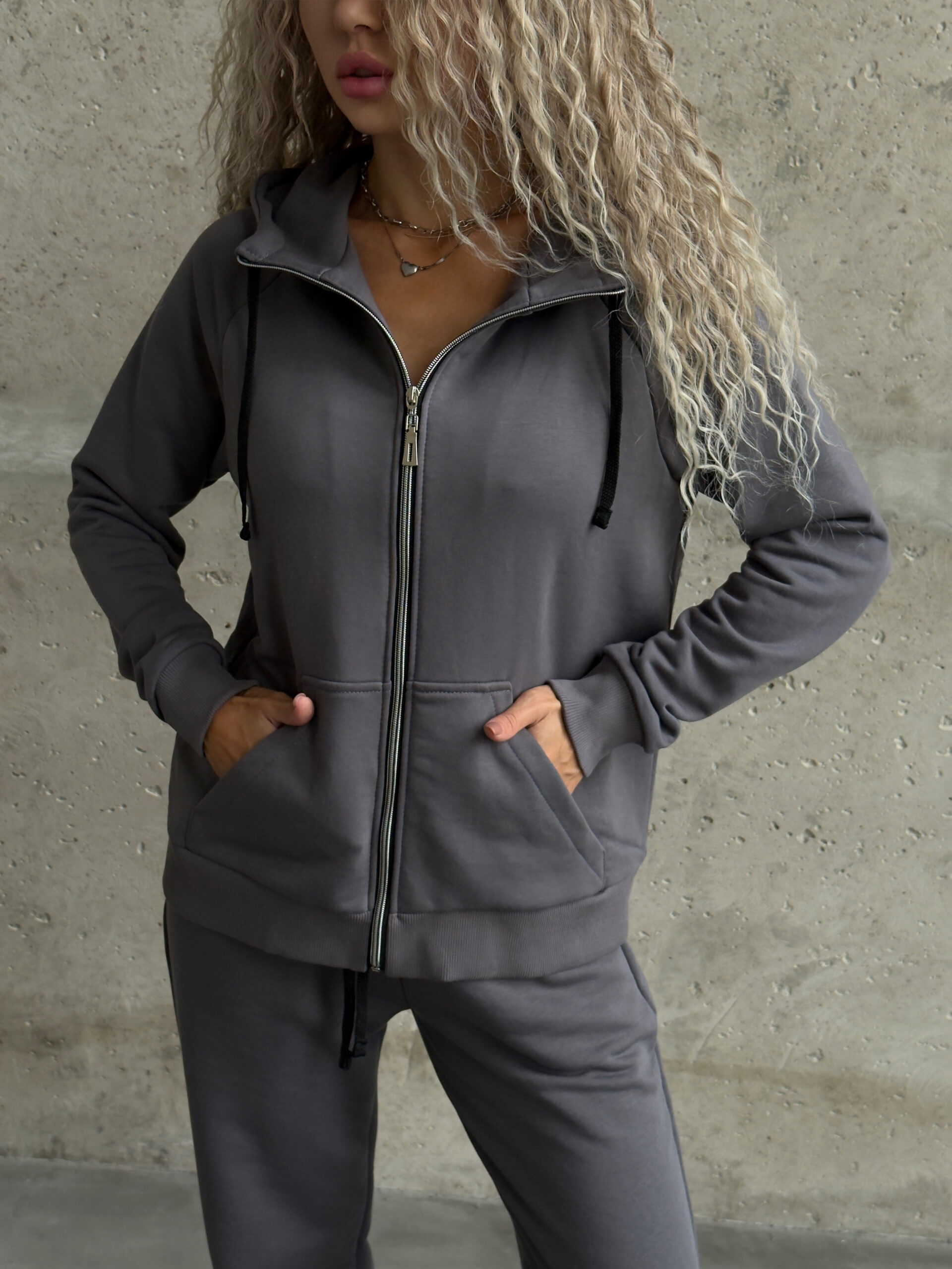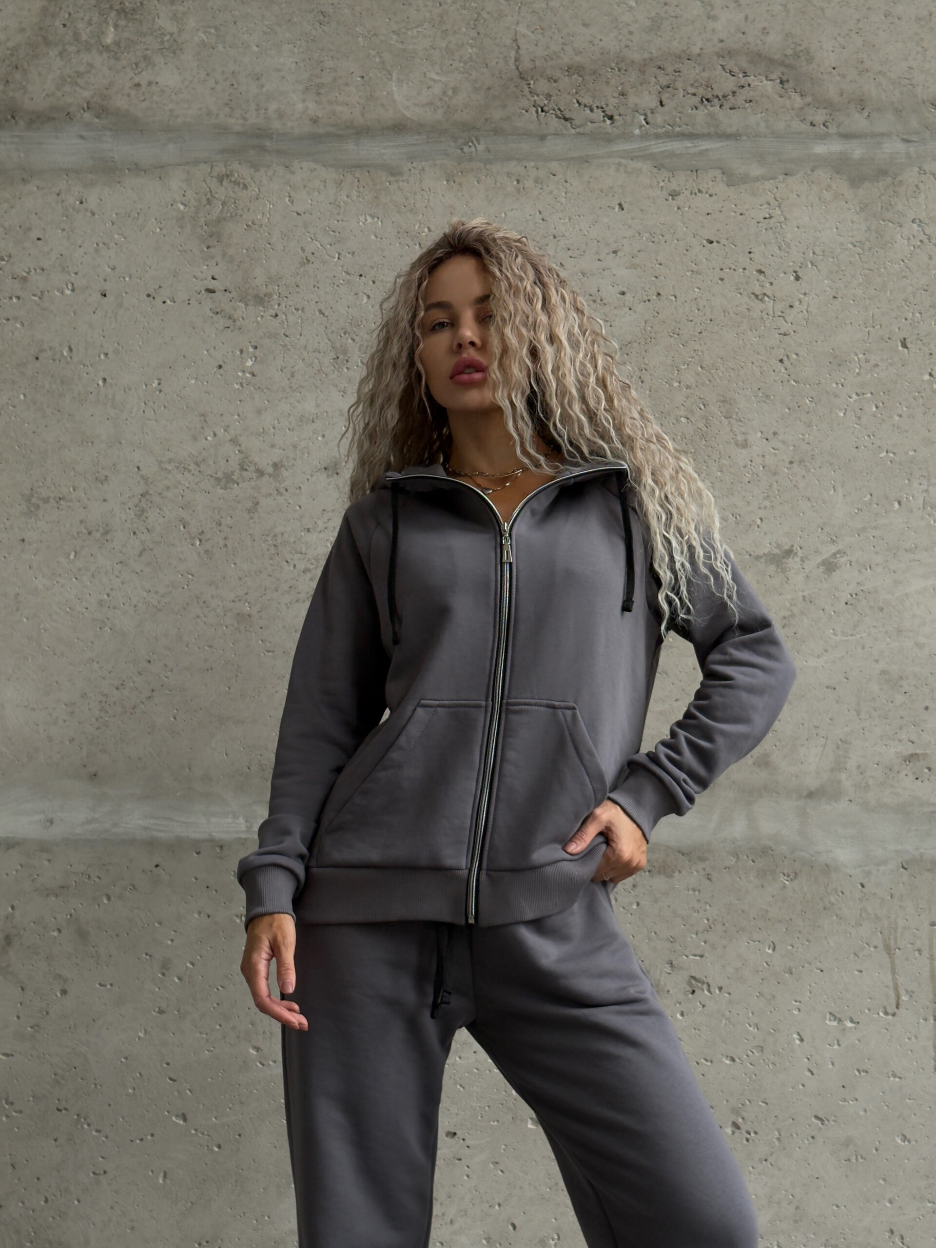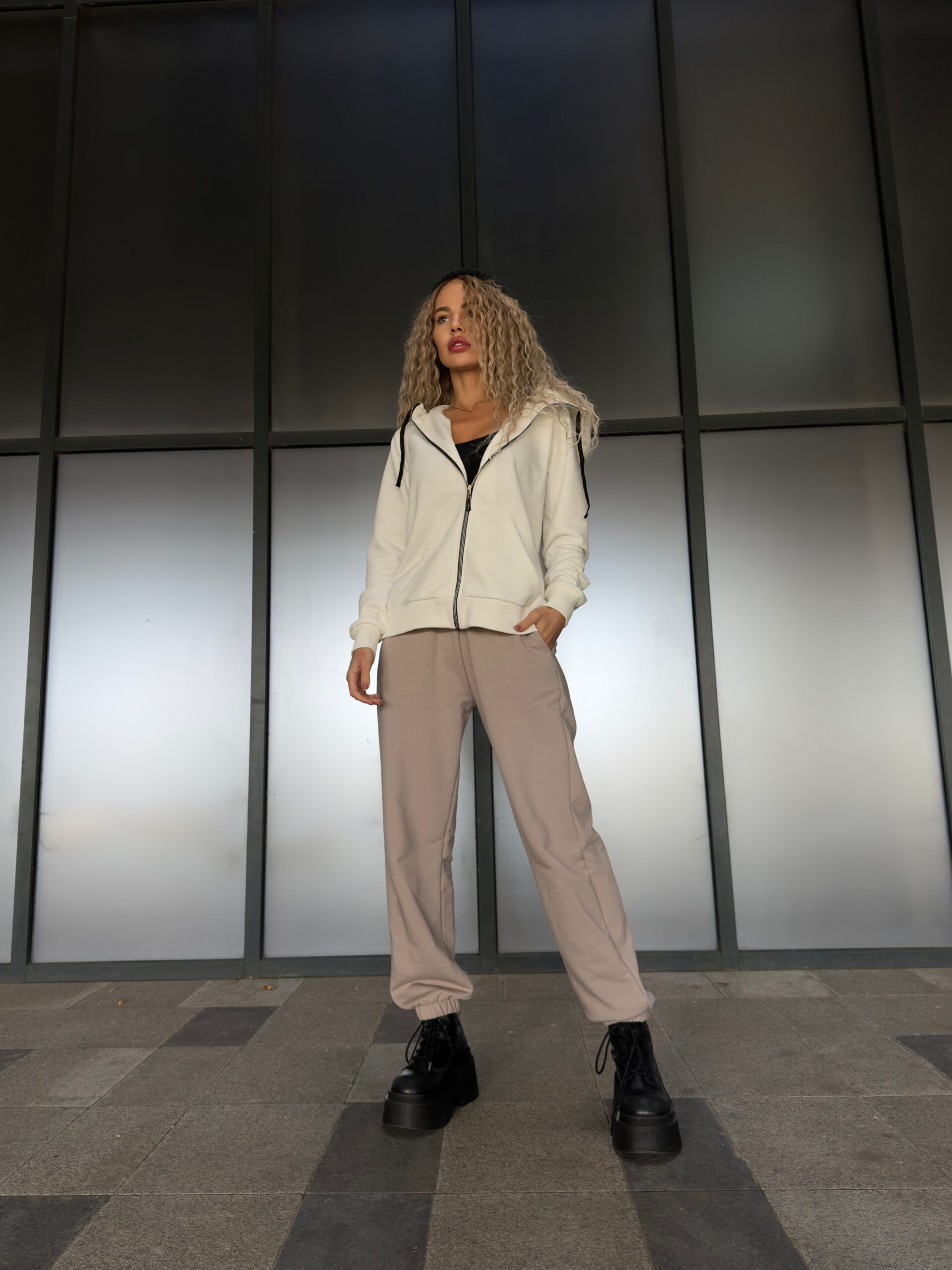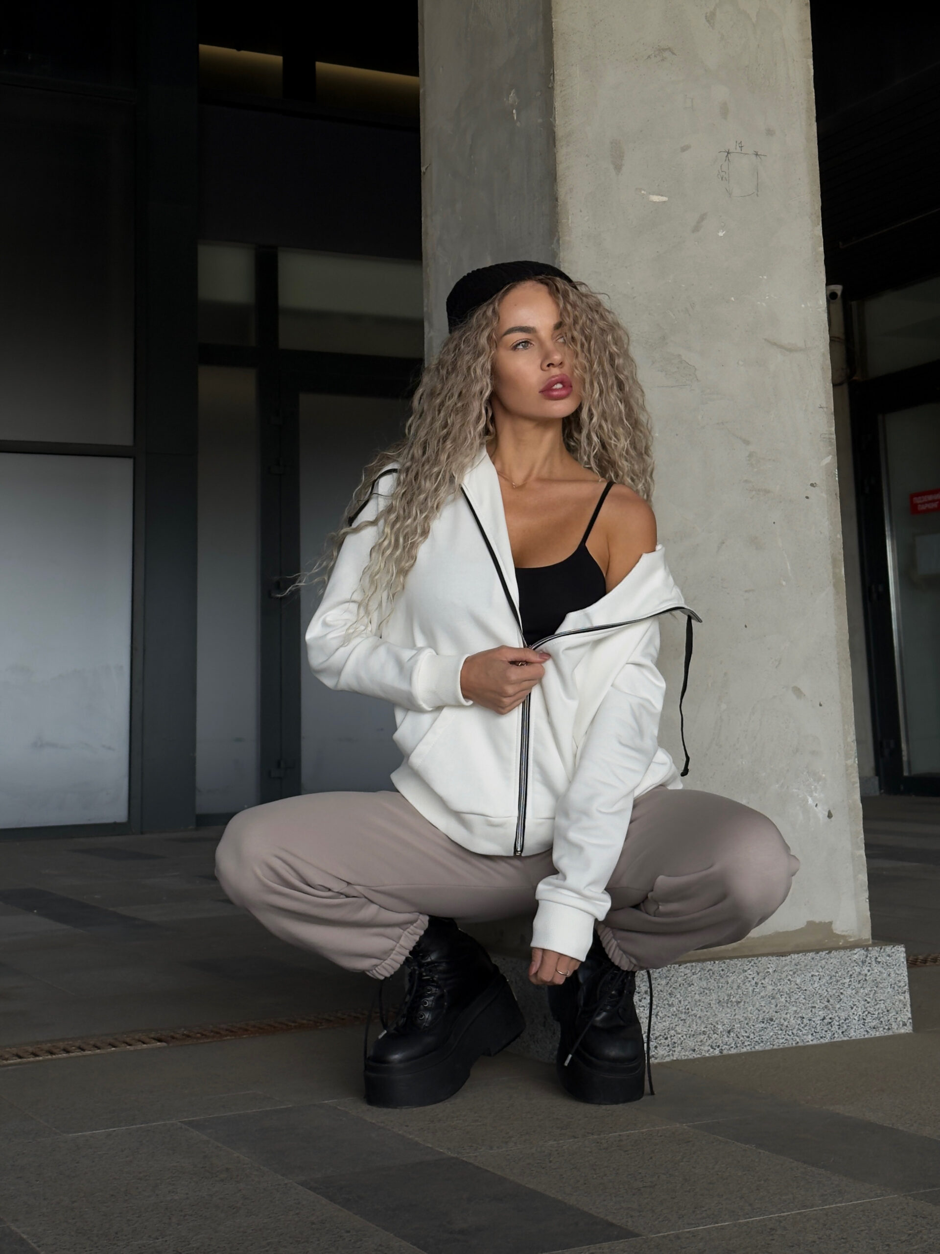 Жіночий костюм (худі на блискавці+джогери) виконаний з тканини преміум якості із турецької трьохнитки (пеньє), не кашлатиться та не линяє. Худі на блискавці з об’ємним, подвійним капюшоном. Джогери з кишенями, високої посадки та м’якою резиночкою, зі шнурками на поясі