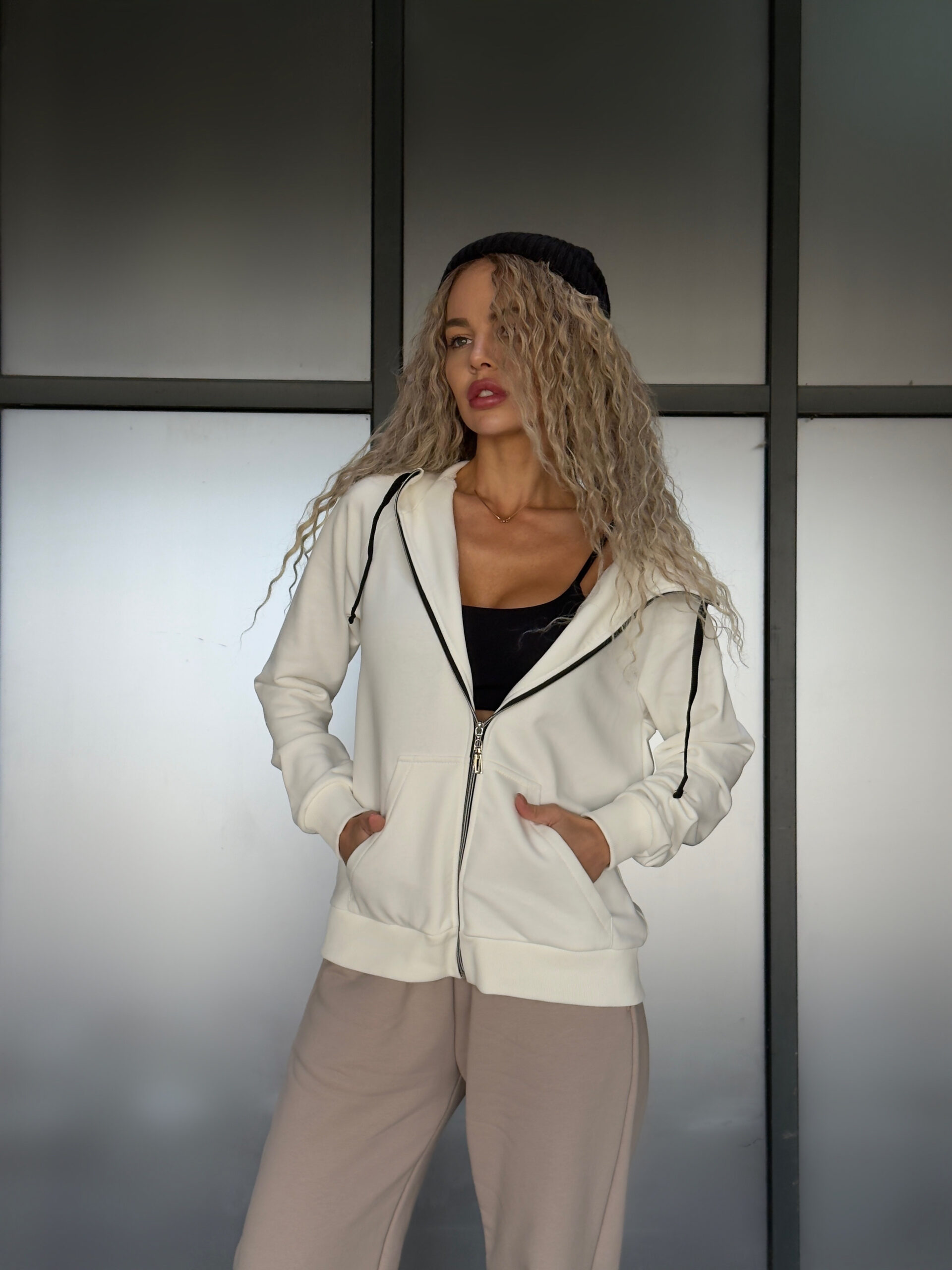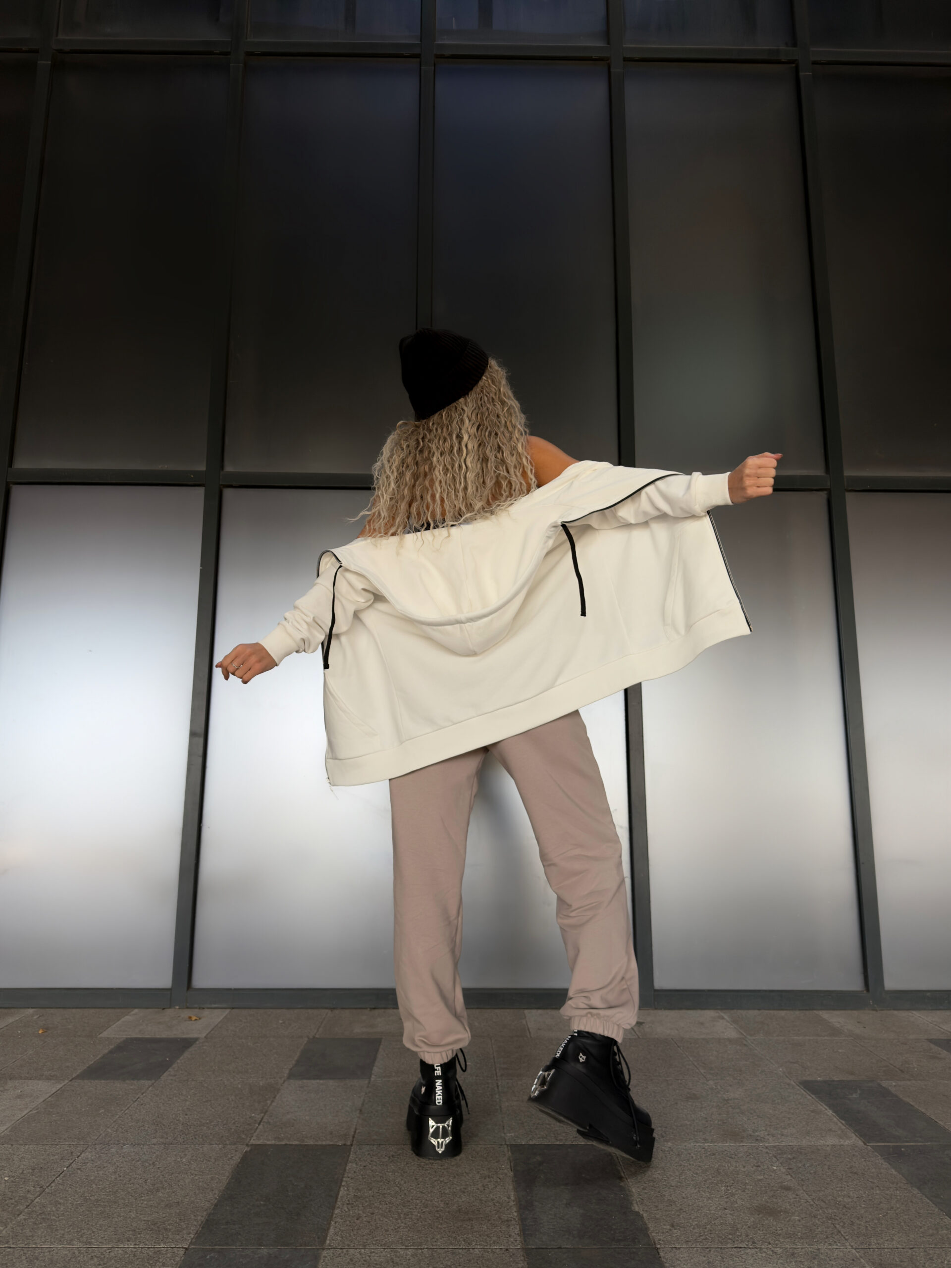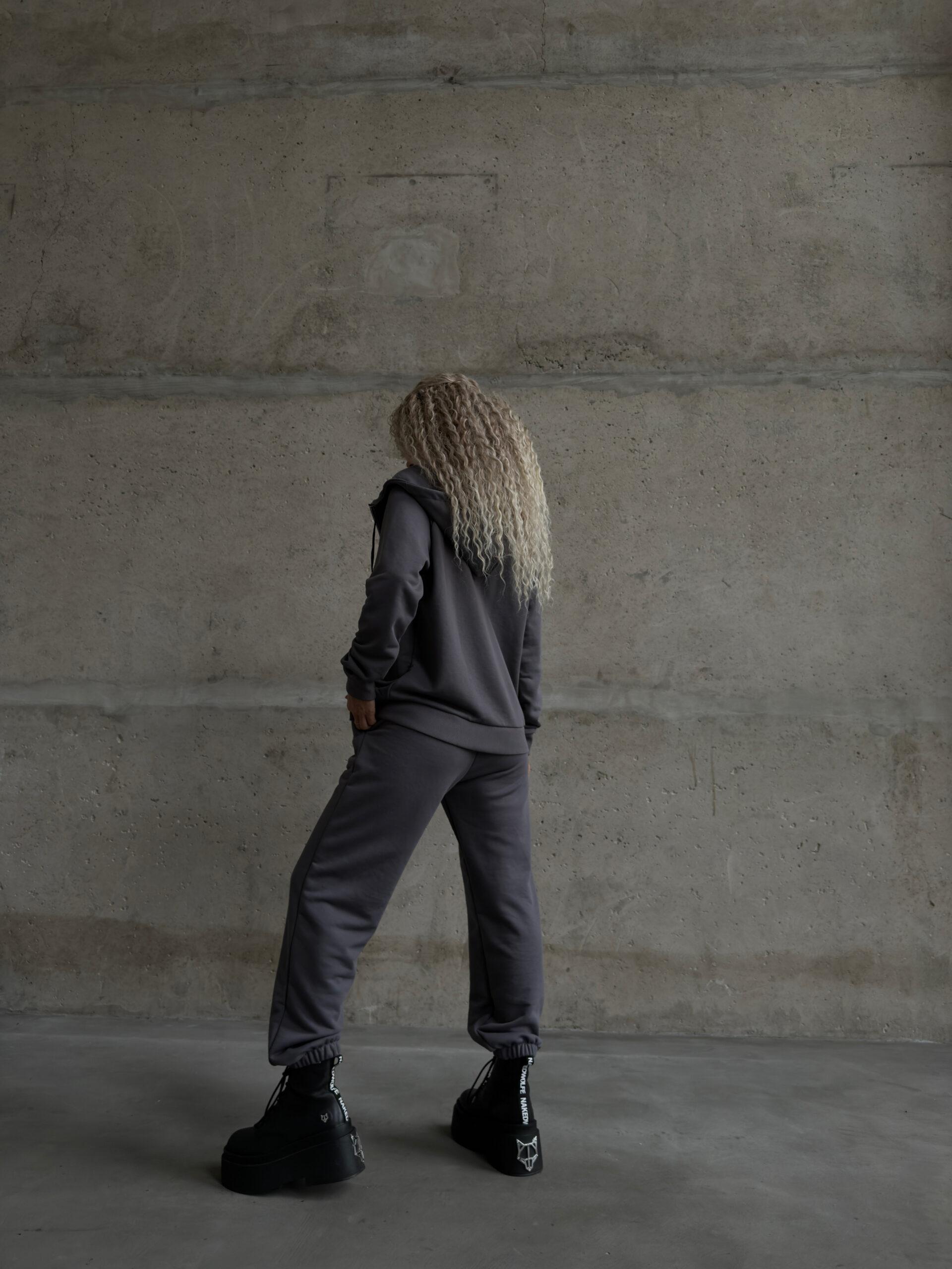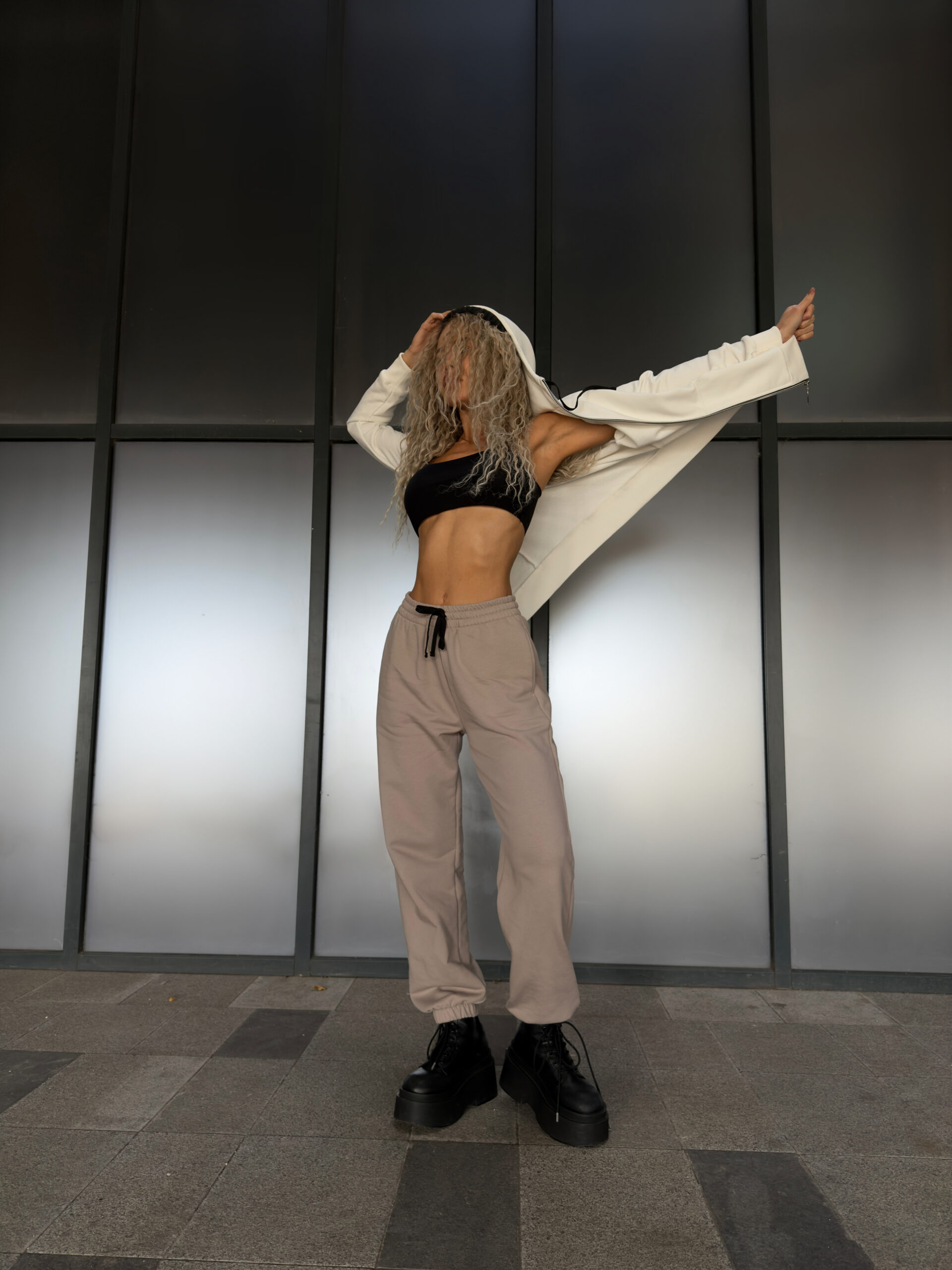 Жіночий костюм (худі на блискавці+джогери) виконаний з тканини преміум якості із турецької трьохнитки (пеньє), не кашлатиться та не линяє. Худі на блискавці з об’ємним, подвійним капюшоном. Джогери з кишенями, високої посадки та м’якою резиночкою, зі шнурками на поясі