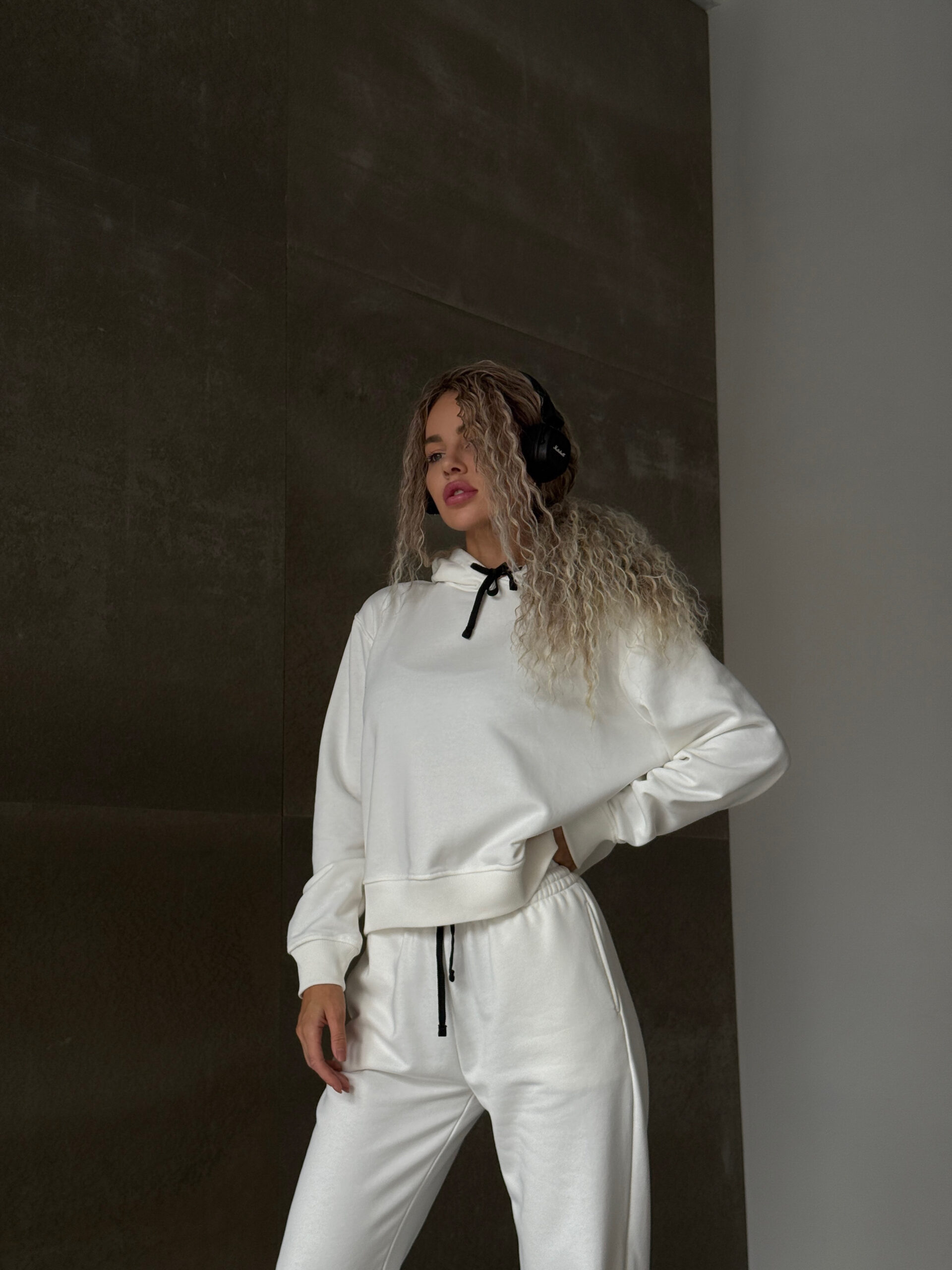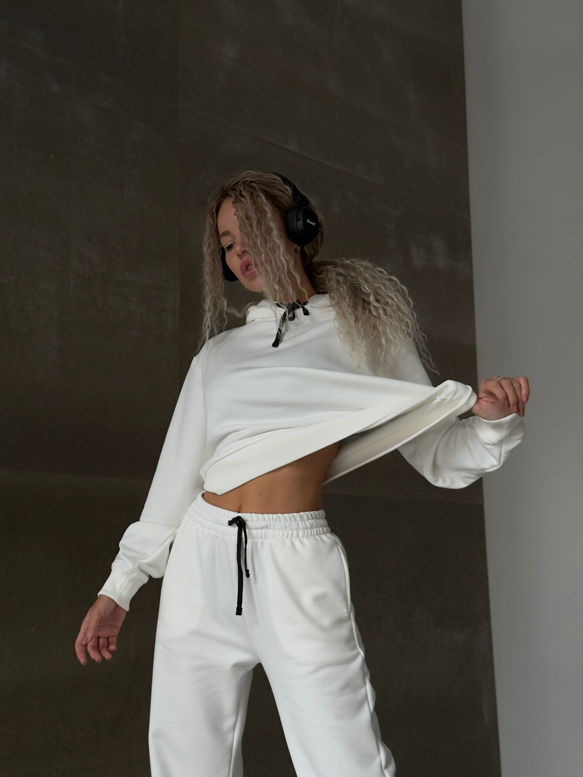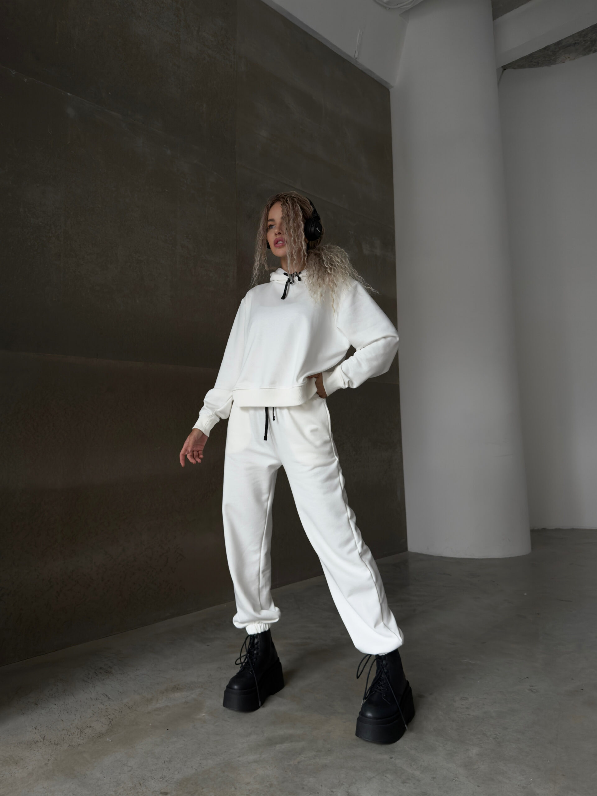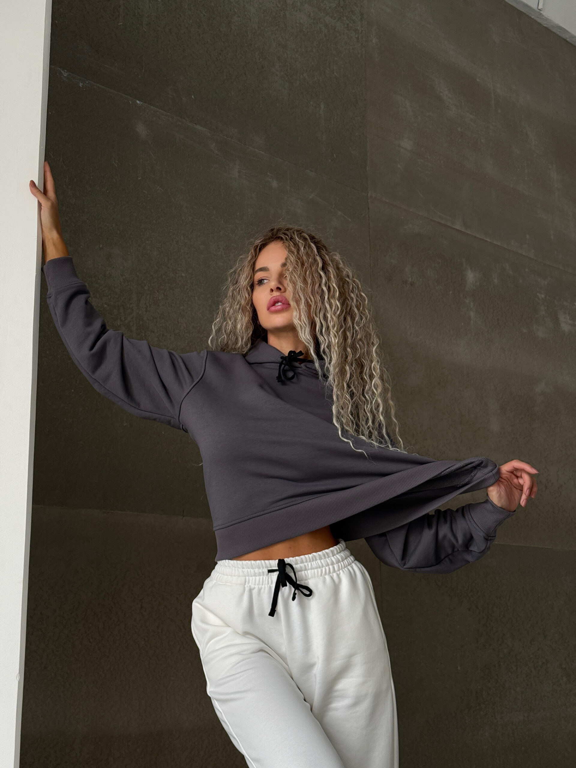 Жіночий костюм ( вкорочене худі+джогери) виконаний з тканини преміум якості із турецької трьохнитки (пеньє), не кашлатиться та не линяє. Худі на блискавці з об’ємним, подвійним капюшоном. Джогери з кишенями, високої посадки та м’якою резиночкою, зі шнурками на поясі
