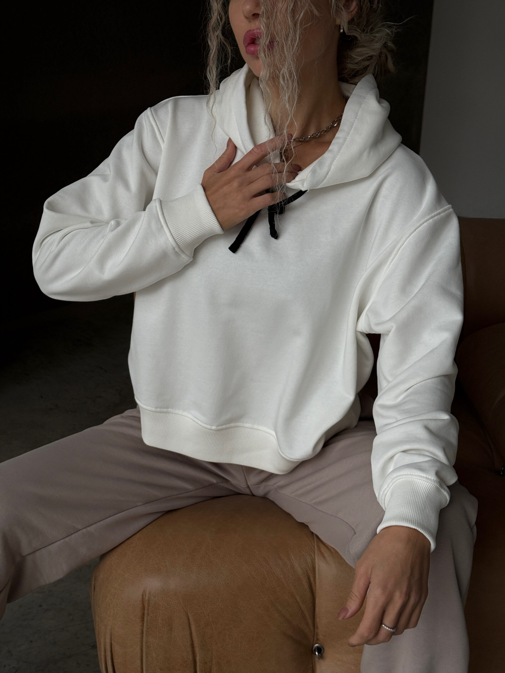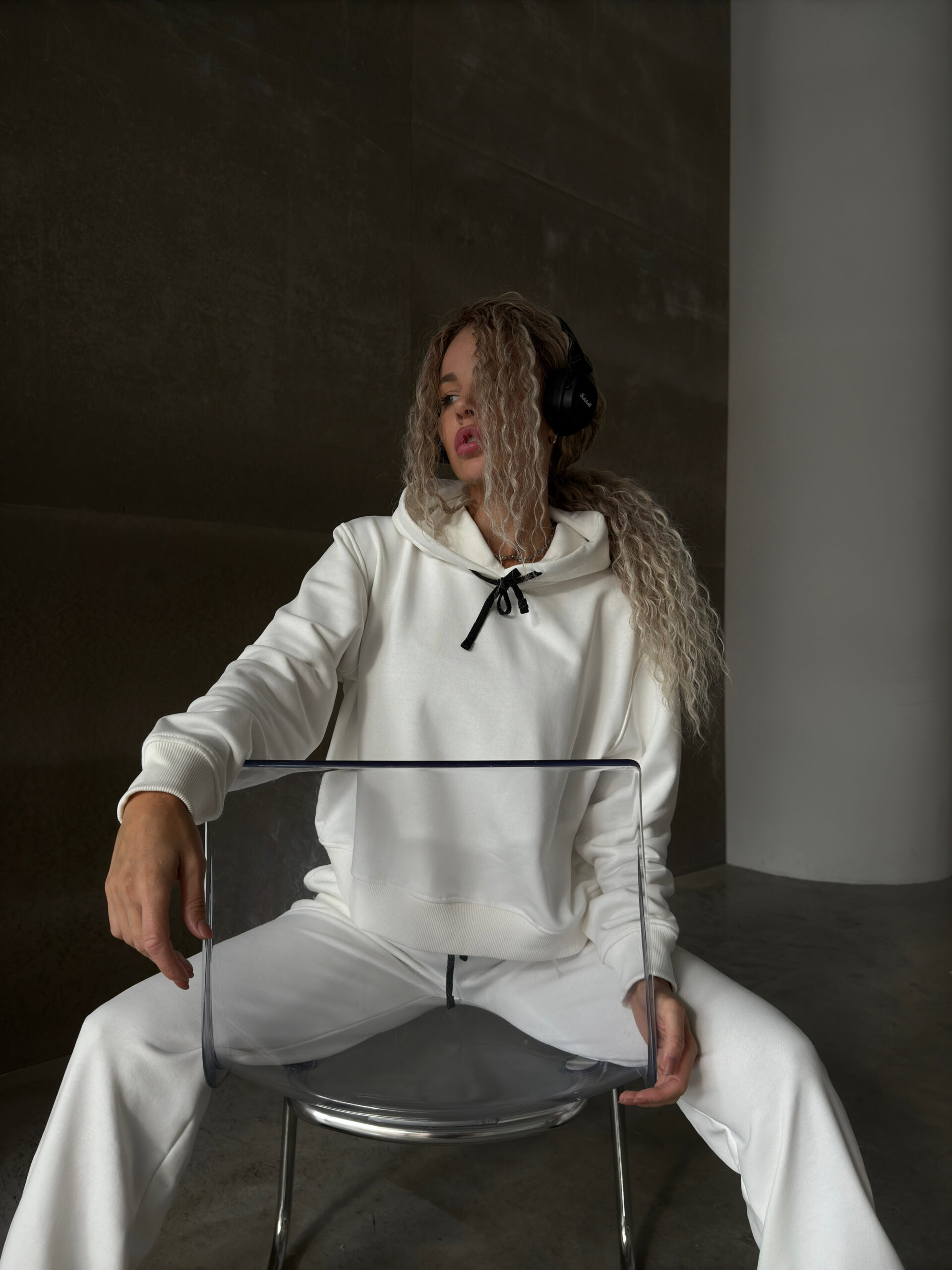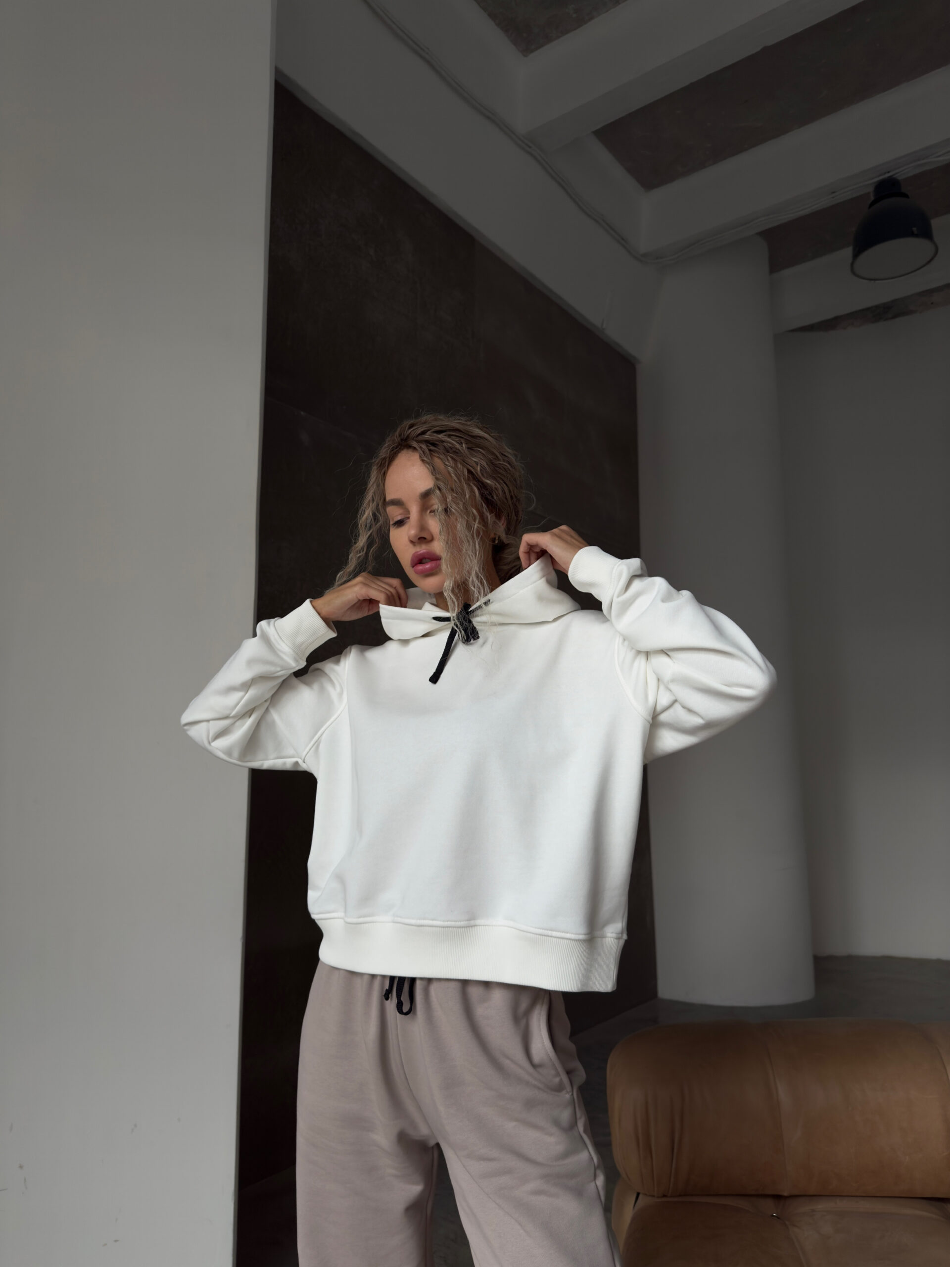 Жіночий костюм ( вкорочене худі+джогери) виконаний з тканини преміум якості із турецької трьохнитки (пеньє), не кашлатиться та не линяє. Худі на блискавці з об’ємним, подвійним капюшоном. Джогери з кишенями, високої посадки та м’якою резиночкою, зі шнурками на поясі