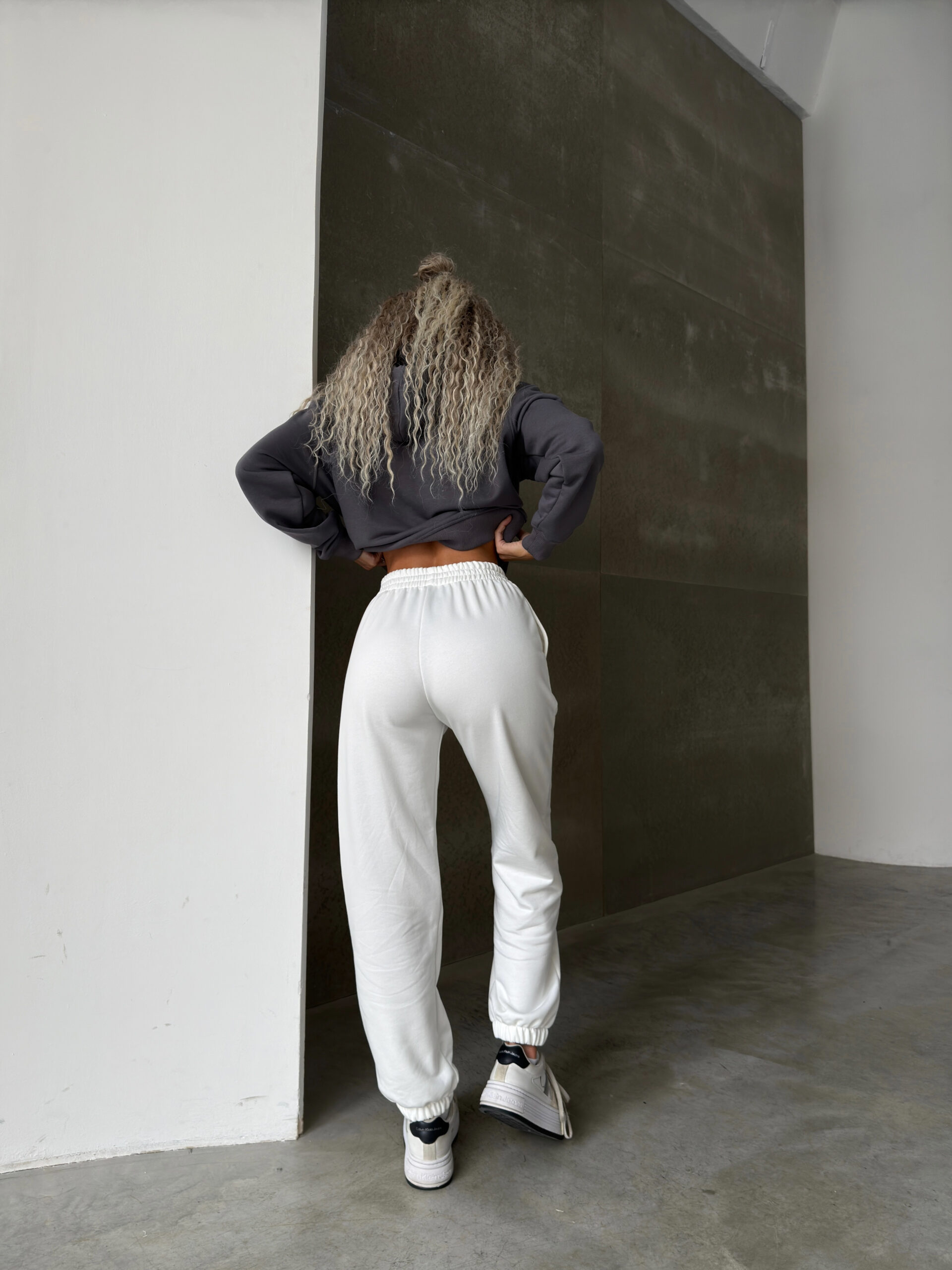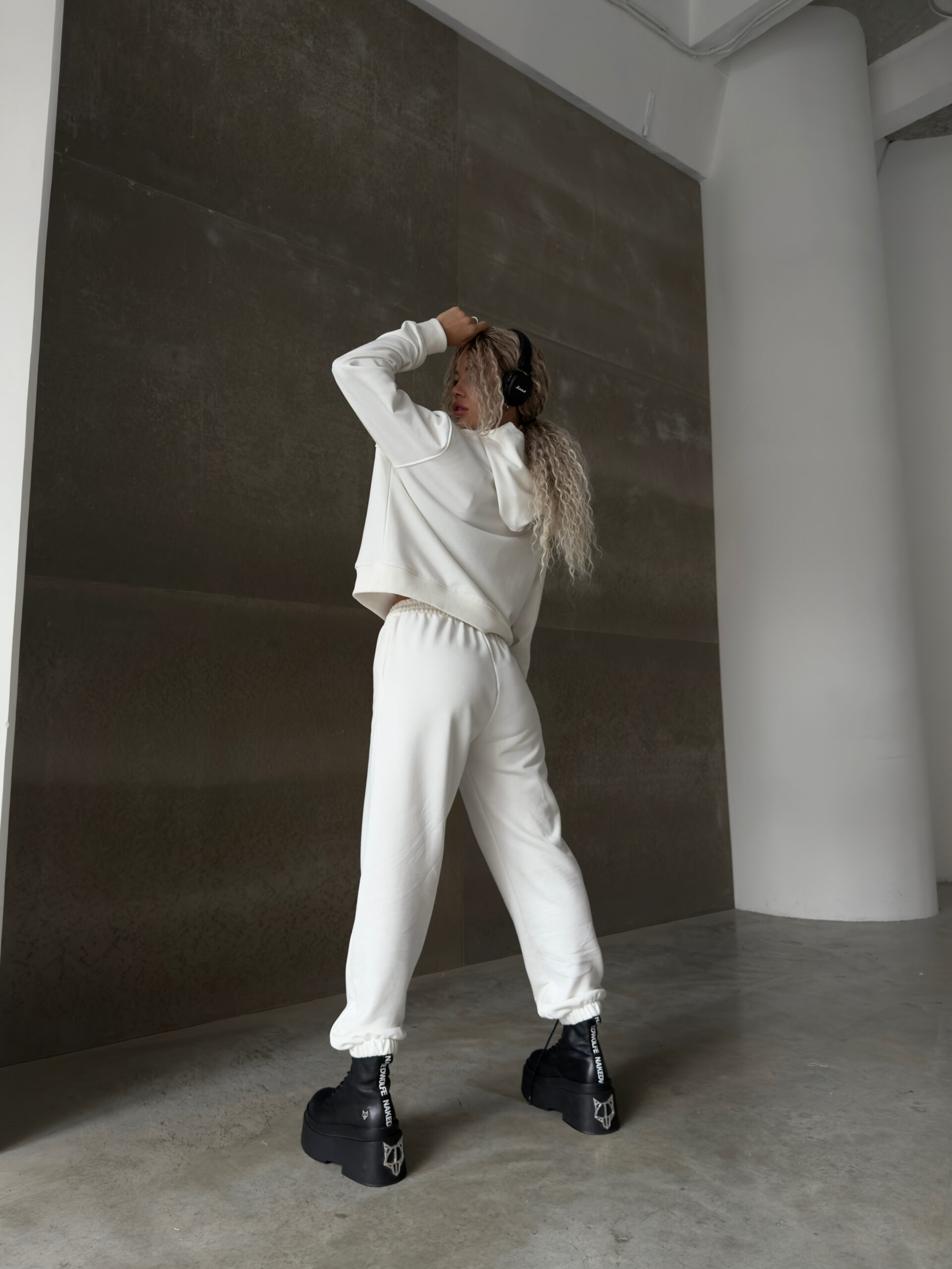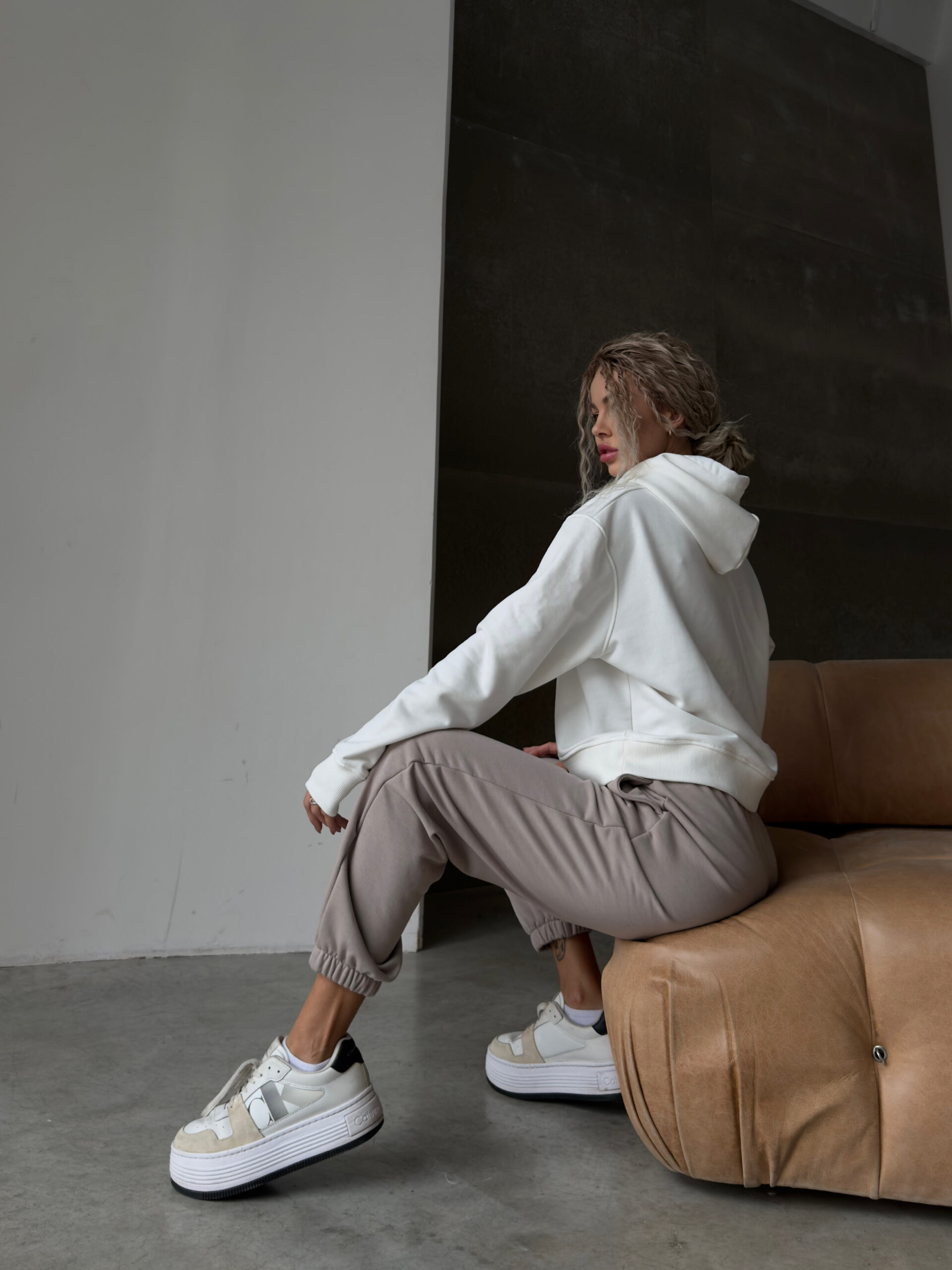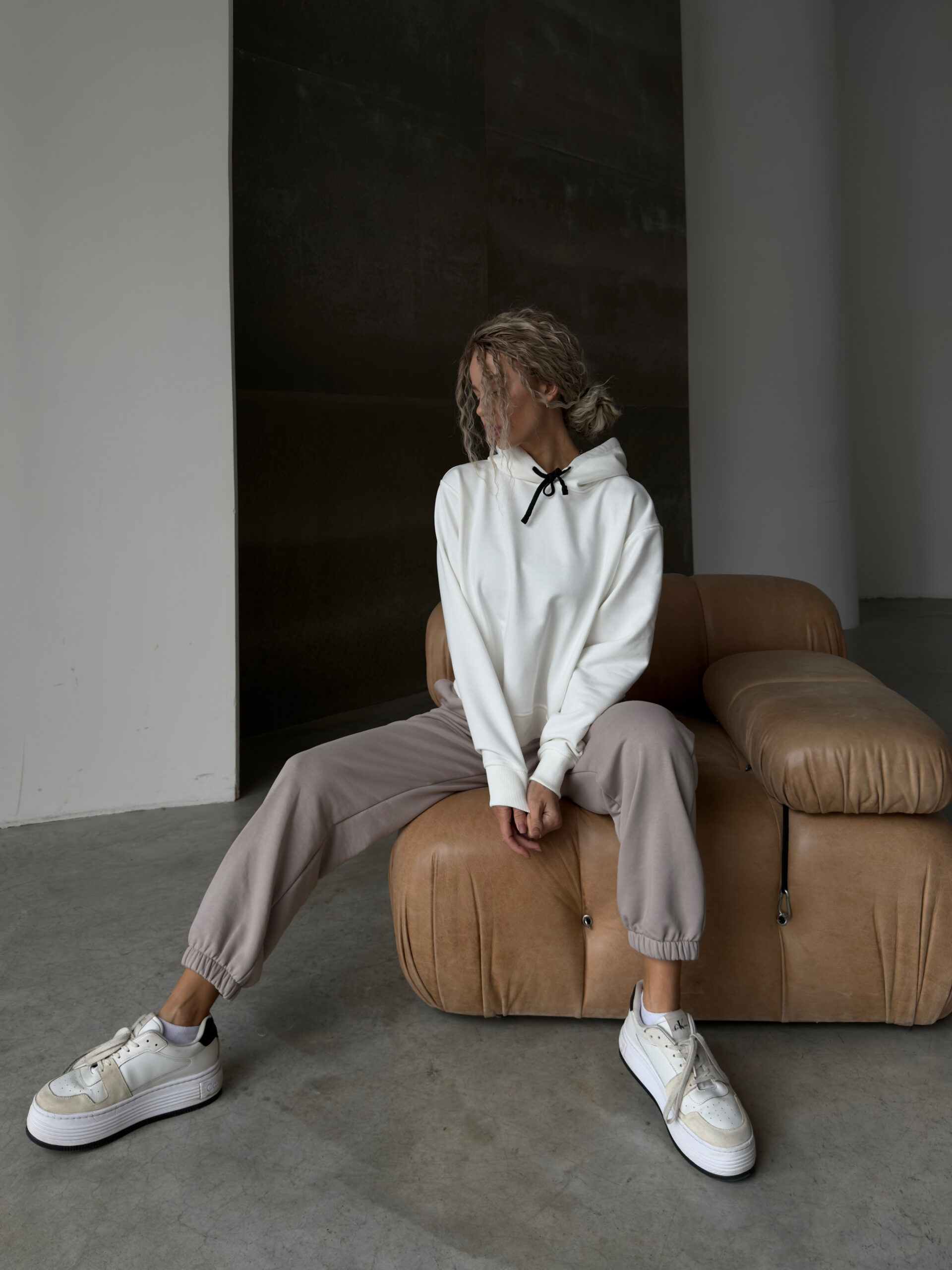 Жіночий костюм ( вкорочене худі+джогери) виконаний з тканини преміум якості із турецької трьохнитки (пеньє), не кашлатиться та не линяє. Худі на блискавці з об’ємним, подвійним капюшоном. Джогери з кишенями, високої посадки та м’якою резиночкою, зі шнурками на поясі