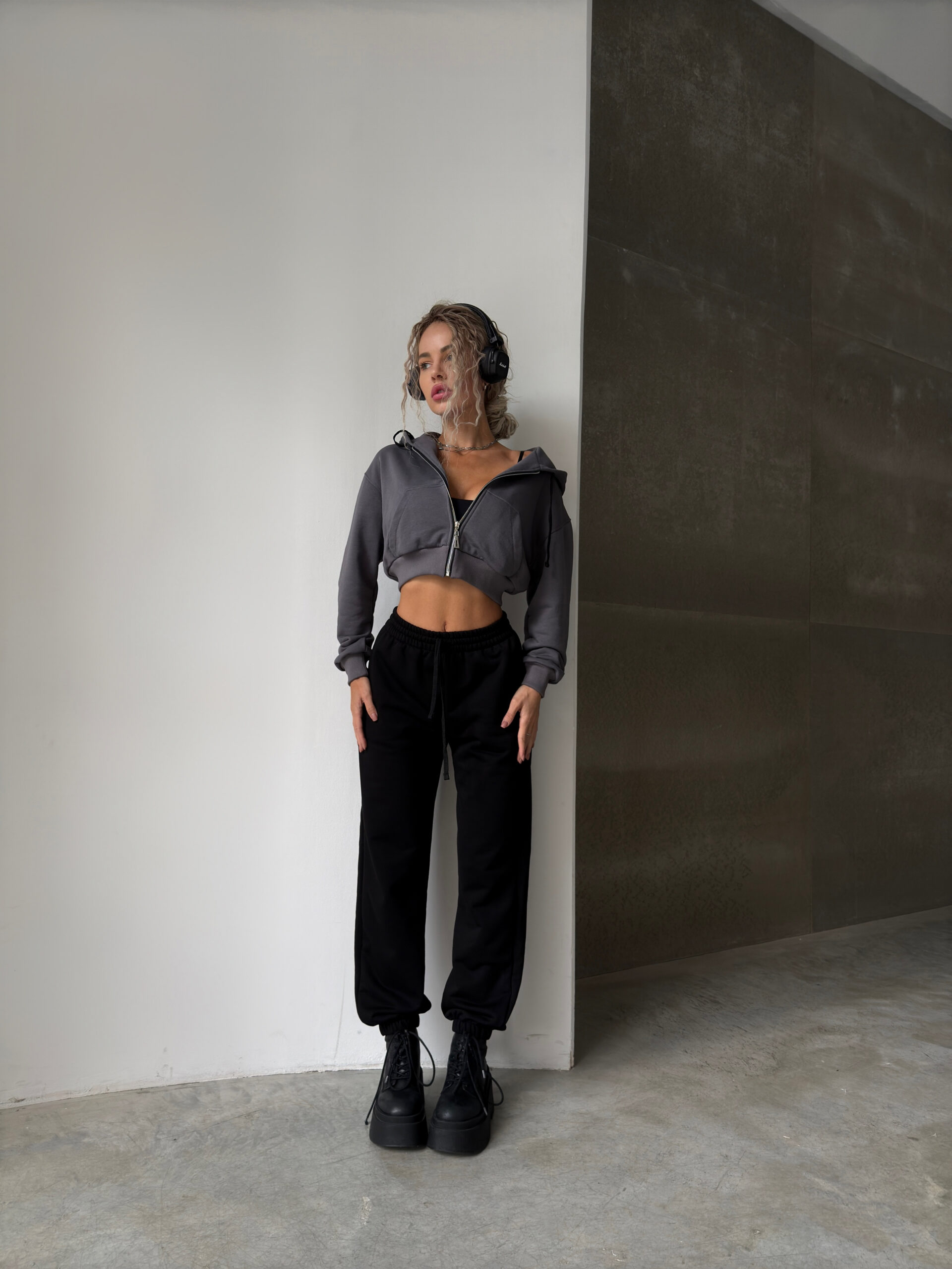 Жіночий костюм (вкорочене худі на блискавці+палаццо) виконаний з тканини преміум якості із турецької трьохнитки (пеньє), не кашлатиться та не линяє. Вкорочене худі на блискавці з об’ємним, подвійним капюшоном. Палаццо з кишенями, високої посадки та м’якою резиночкою, зі шнурками на поясі
