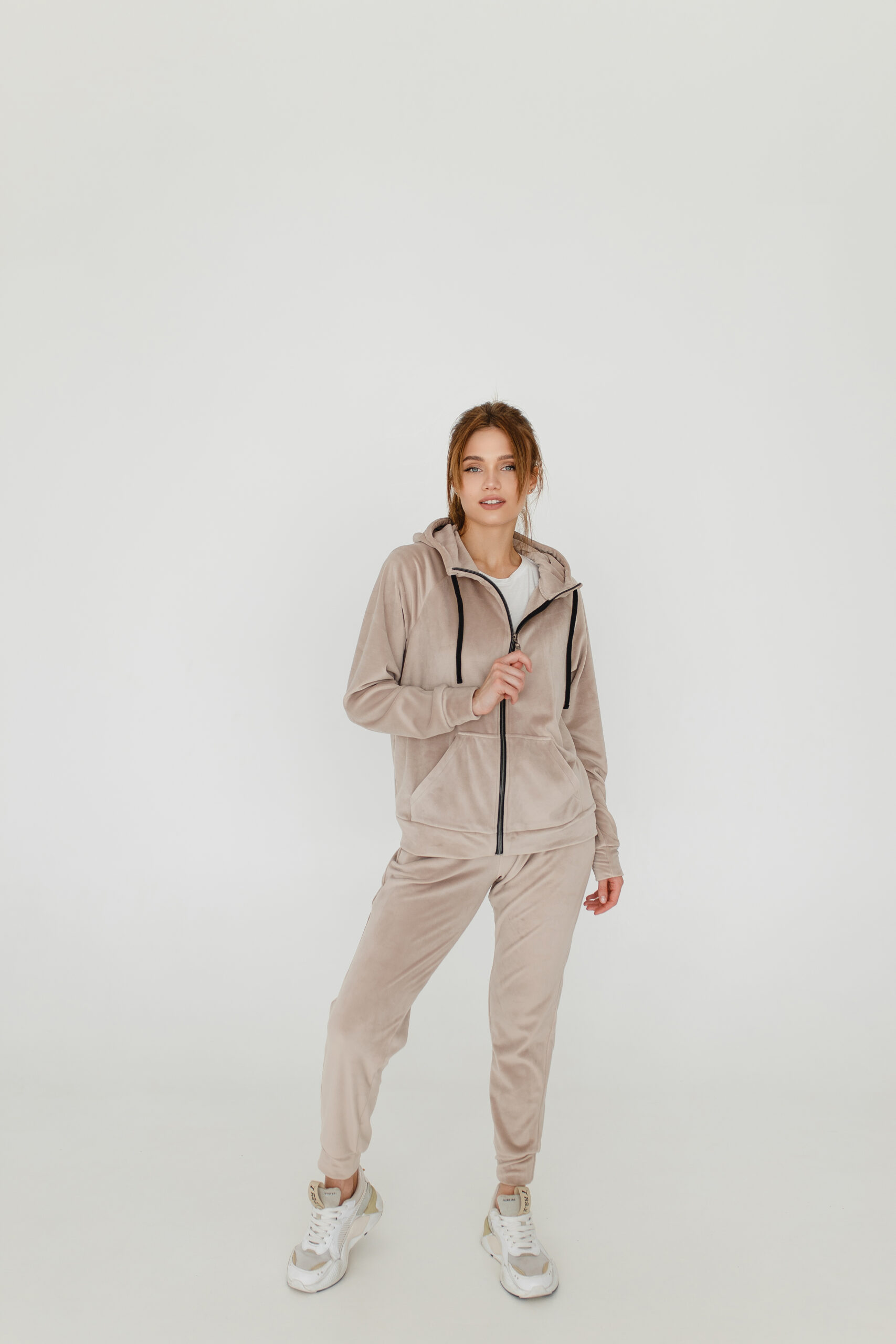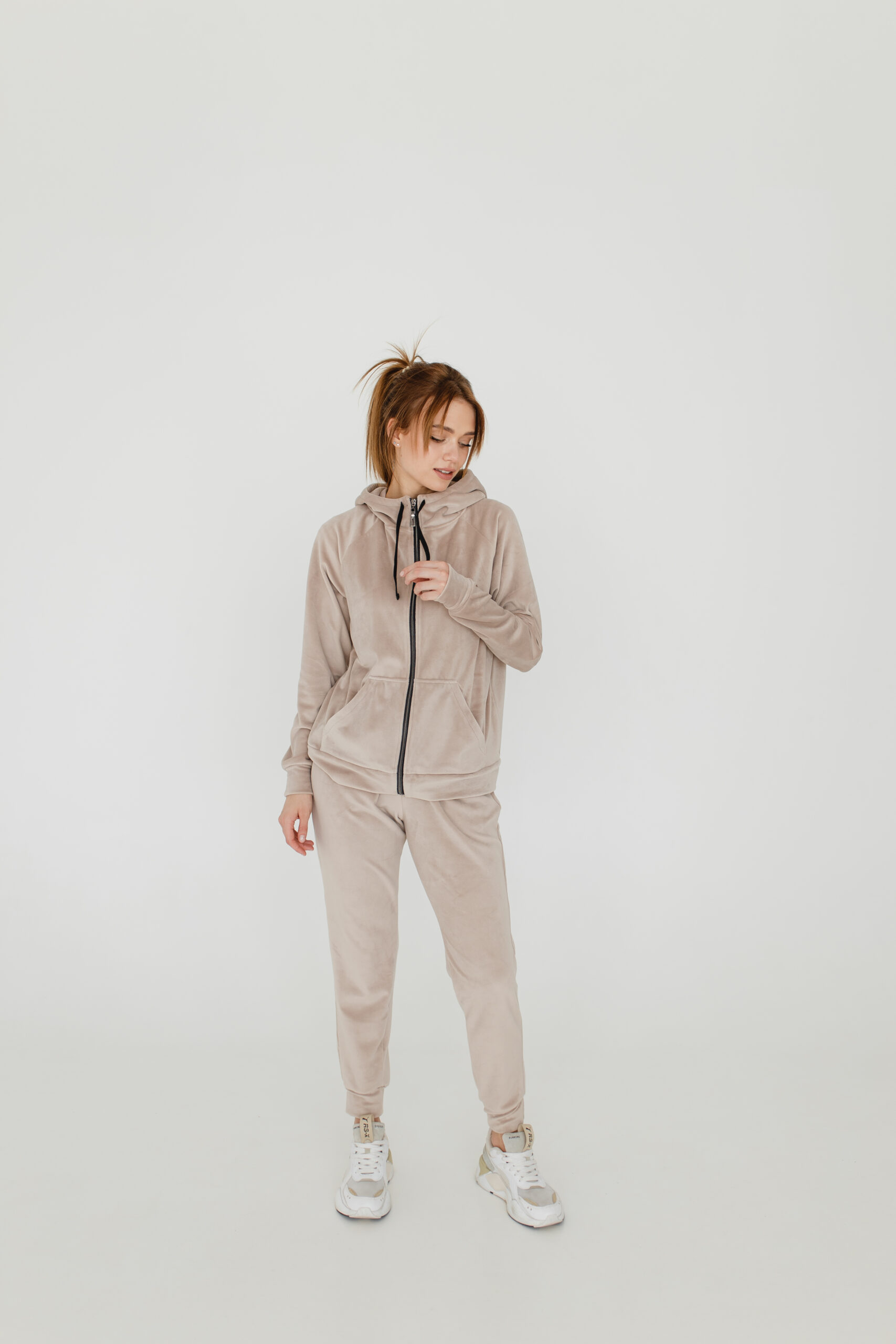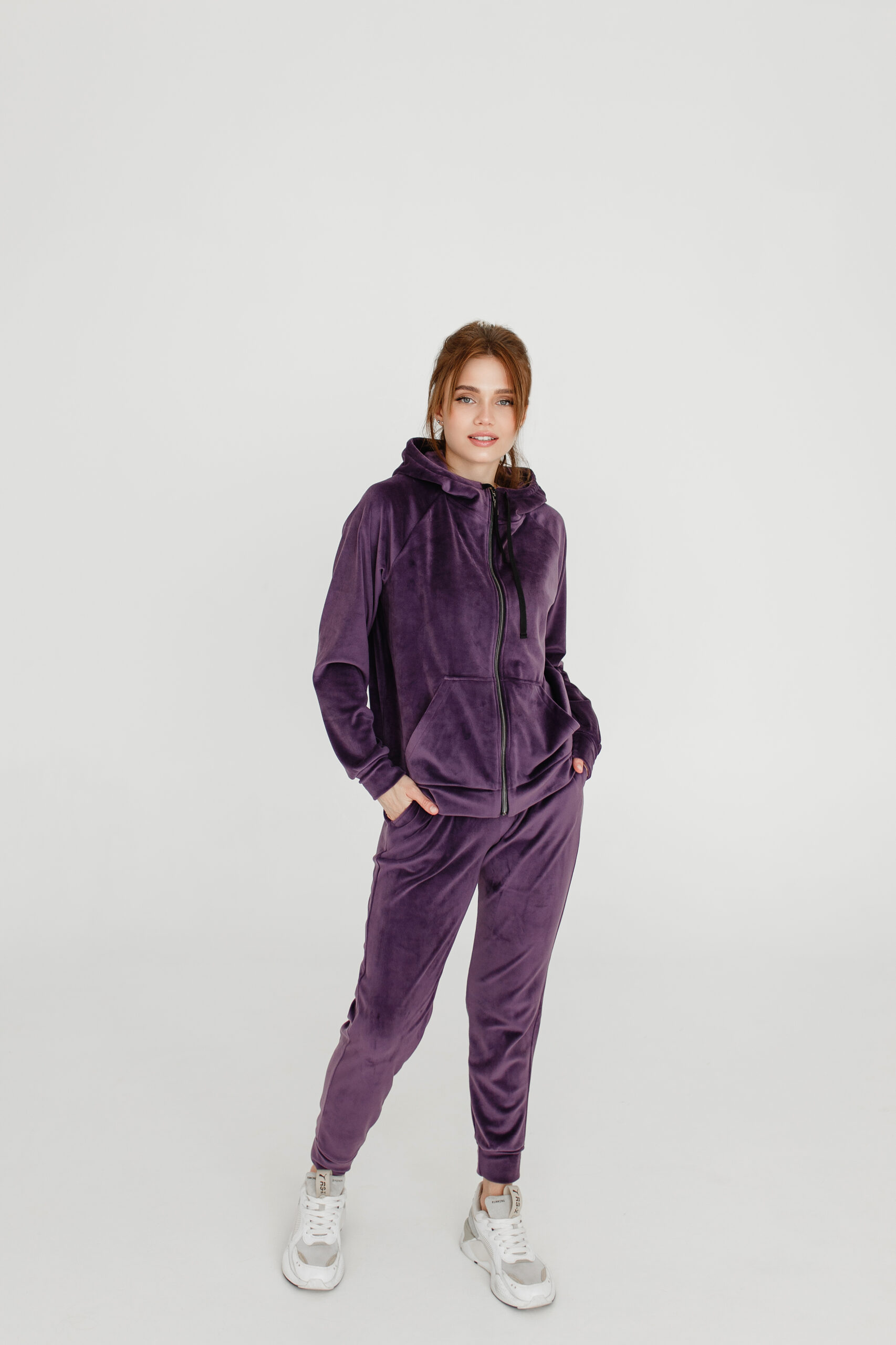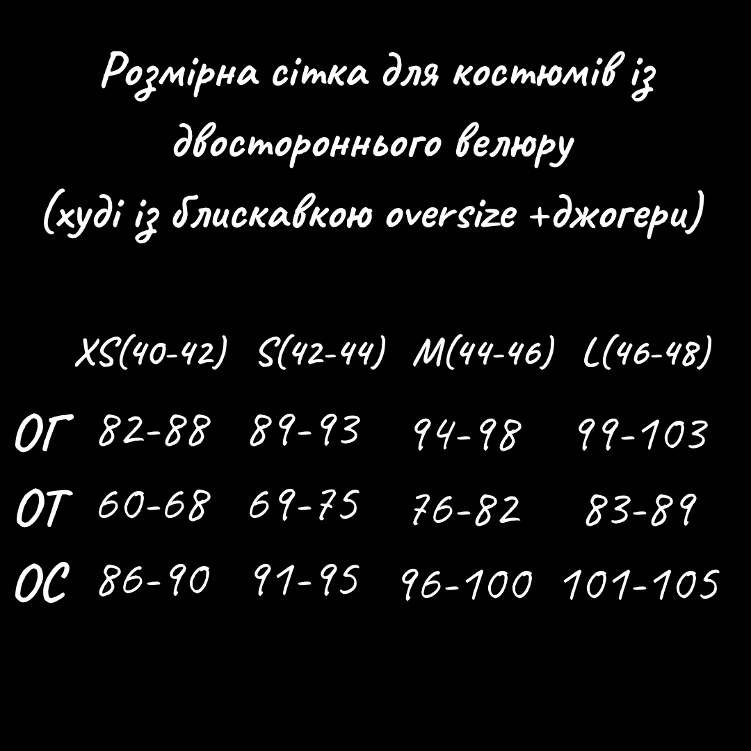 Костюм (худі oversize +джогери) із двосторонньго велюру , не кашлатиться, внутрішня сторона дуже приємна та тепла. Худі oversize із блискавкою з об’ємним, подвійним капюшоном. Джогери з кишенями, високої посадки та м’якою резиночкою, зі шнурками на поясі